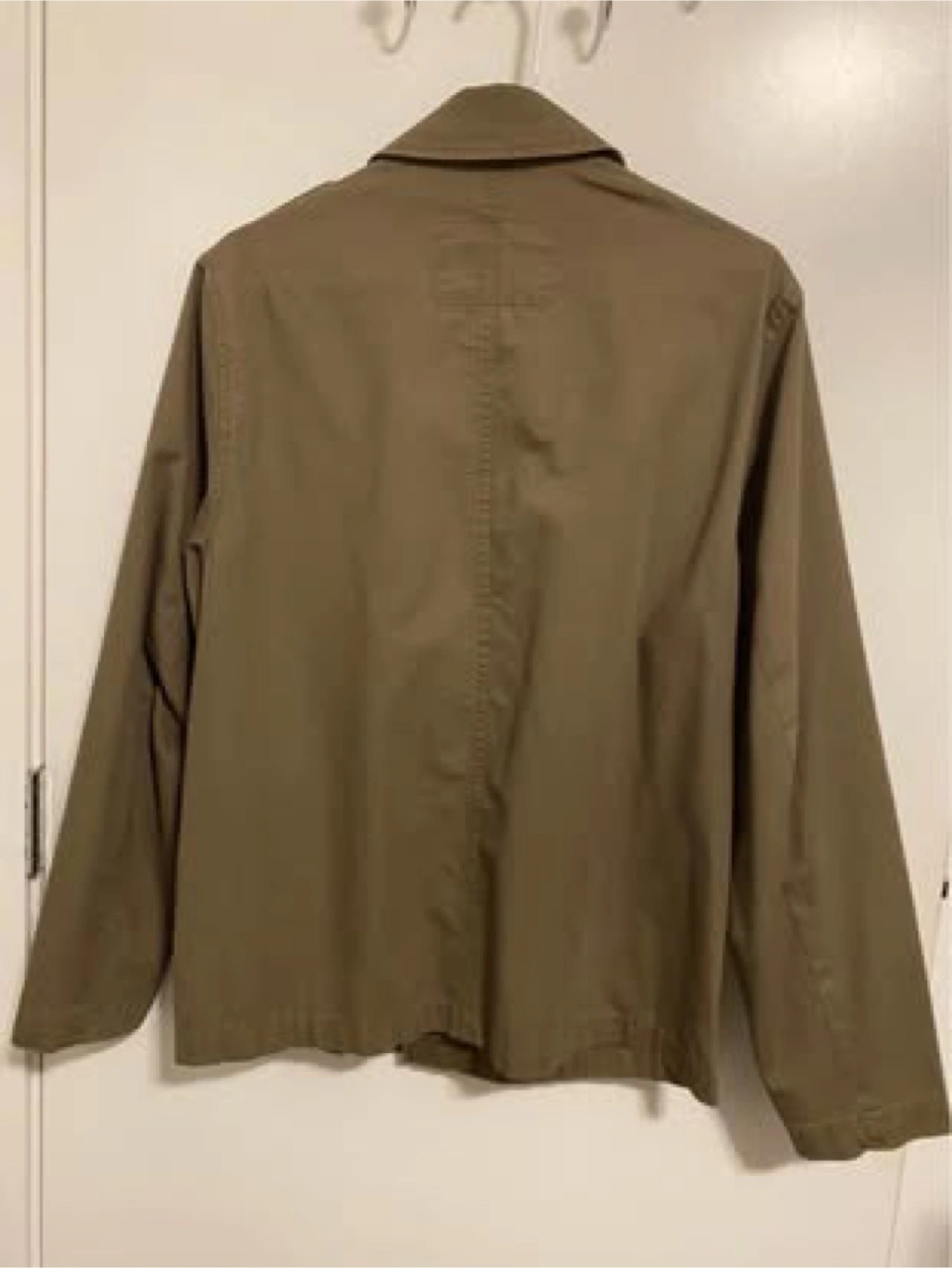 Men's olive green utility jacket. Size small. Features multiple pockets and button closure. Long sleeves.