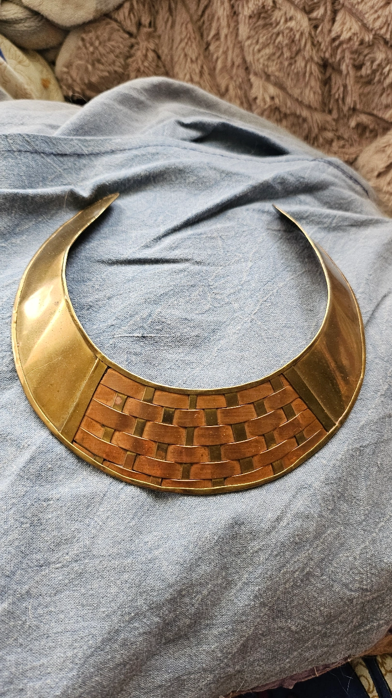 Unique statement necklace. Brass and copper woven design. Curved collar shape. Excellent for layering or wearing alone. Available for pick-up near Oakwood Village.