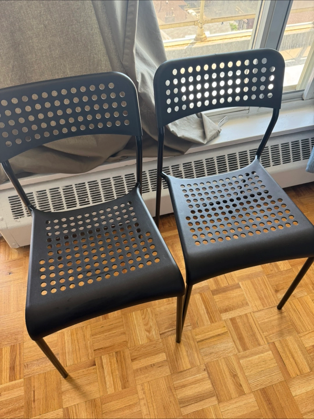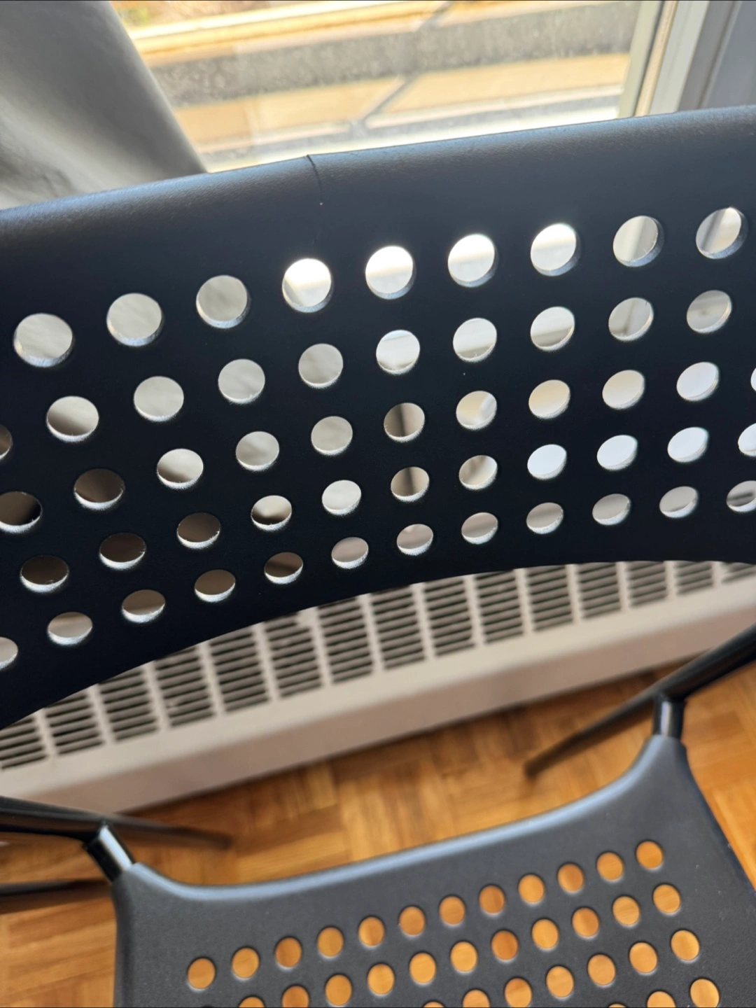 Two black plastic chairs. Simple design, perforated seat and back. Metal legs. One is totally fine however another one has minor wear.