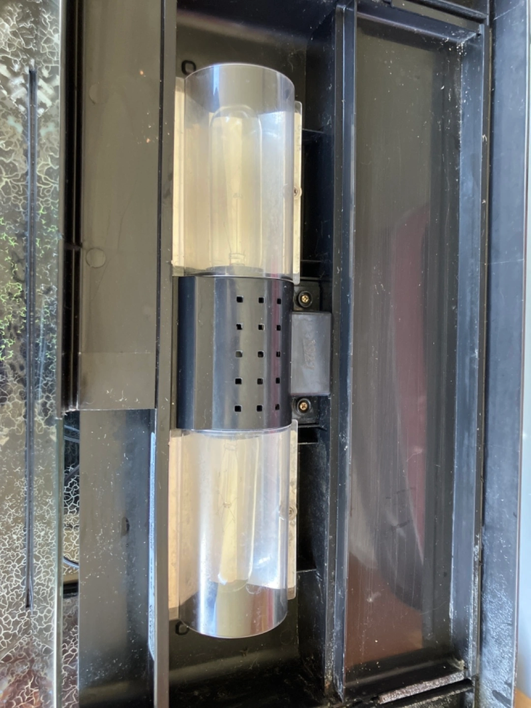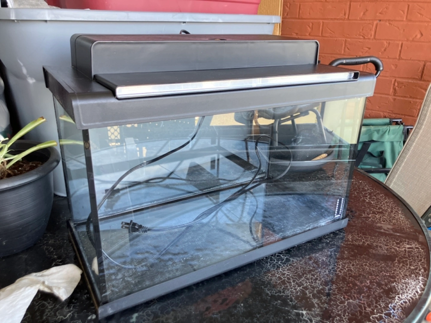 Small aquarium kit. Includes a hood with light fixture. Some minor damage to the top of tank but with lid on you can’t see it. Three replacement light bulbs included plus the lightbulbs that are in the lid already are brand new. No filter Included! ( Mine Broke)