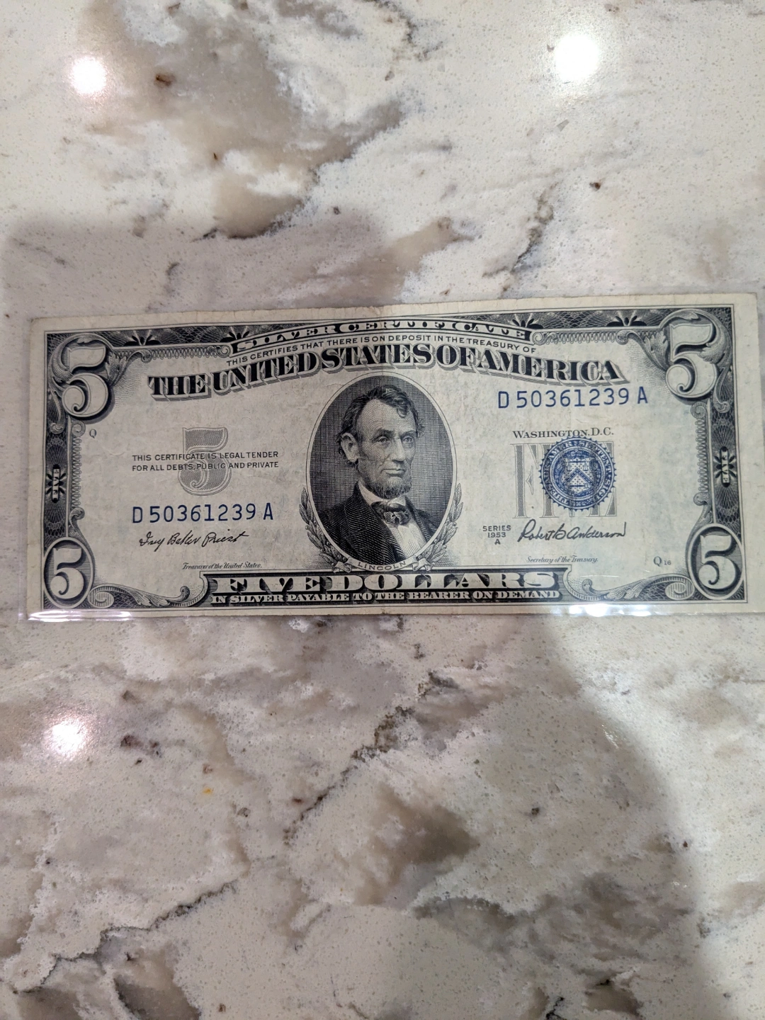 Vintage 1953 $5 dollar bill Silver Certificate. Features Abraham Lincoln on the front and the Lincoln Memorial on the back. Collectible currency. Serial number D50361239A.