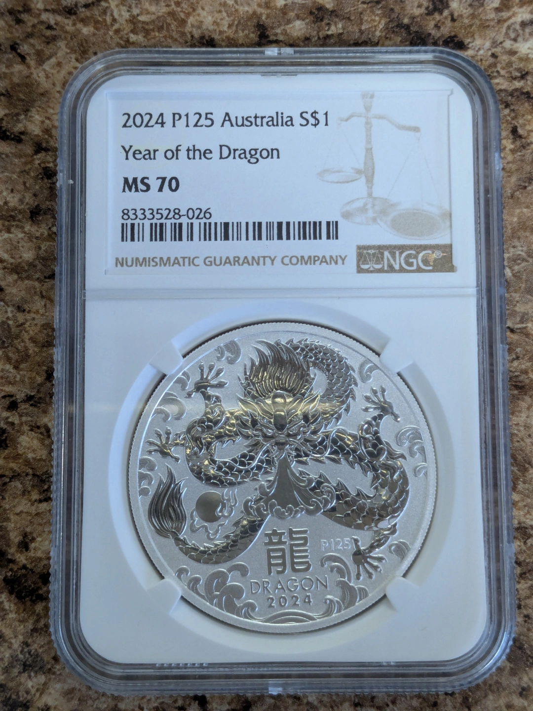 342Graded MS70 by NGC. 1oz 999 fine silver. Comes in protective holder. Beautiful coin. Year of the Dragon design. Features a dragon and the year 2024.