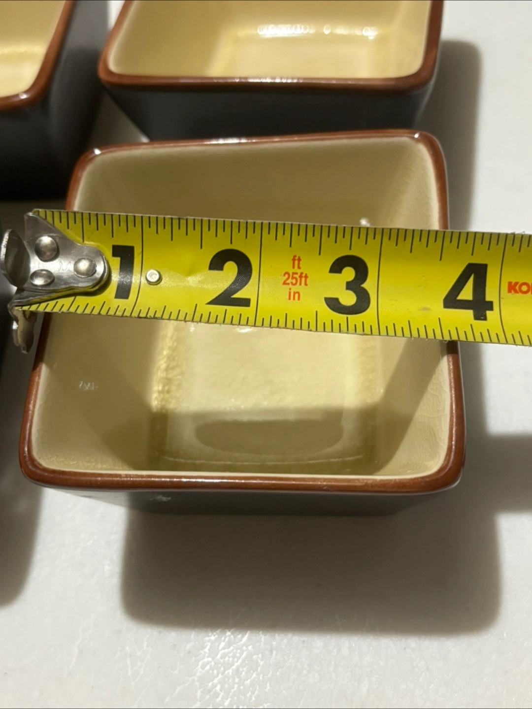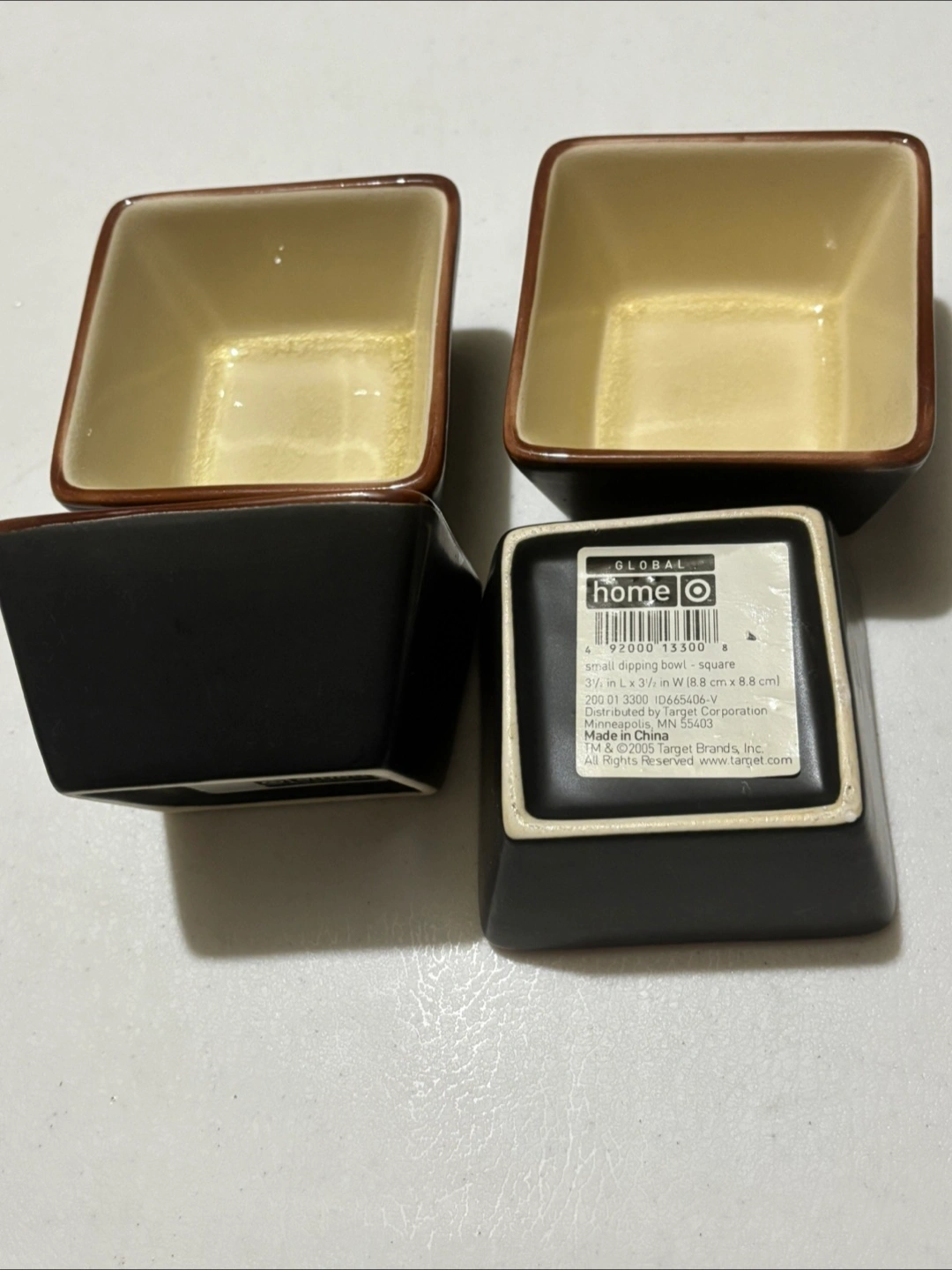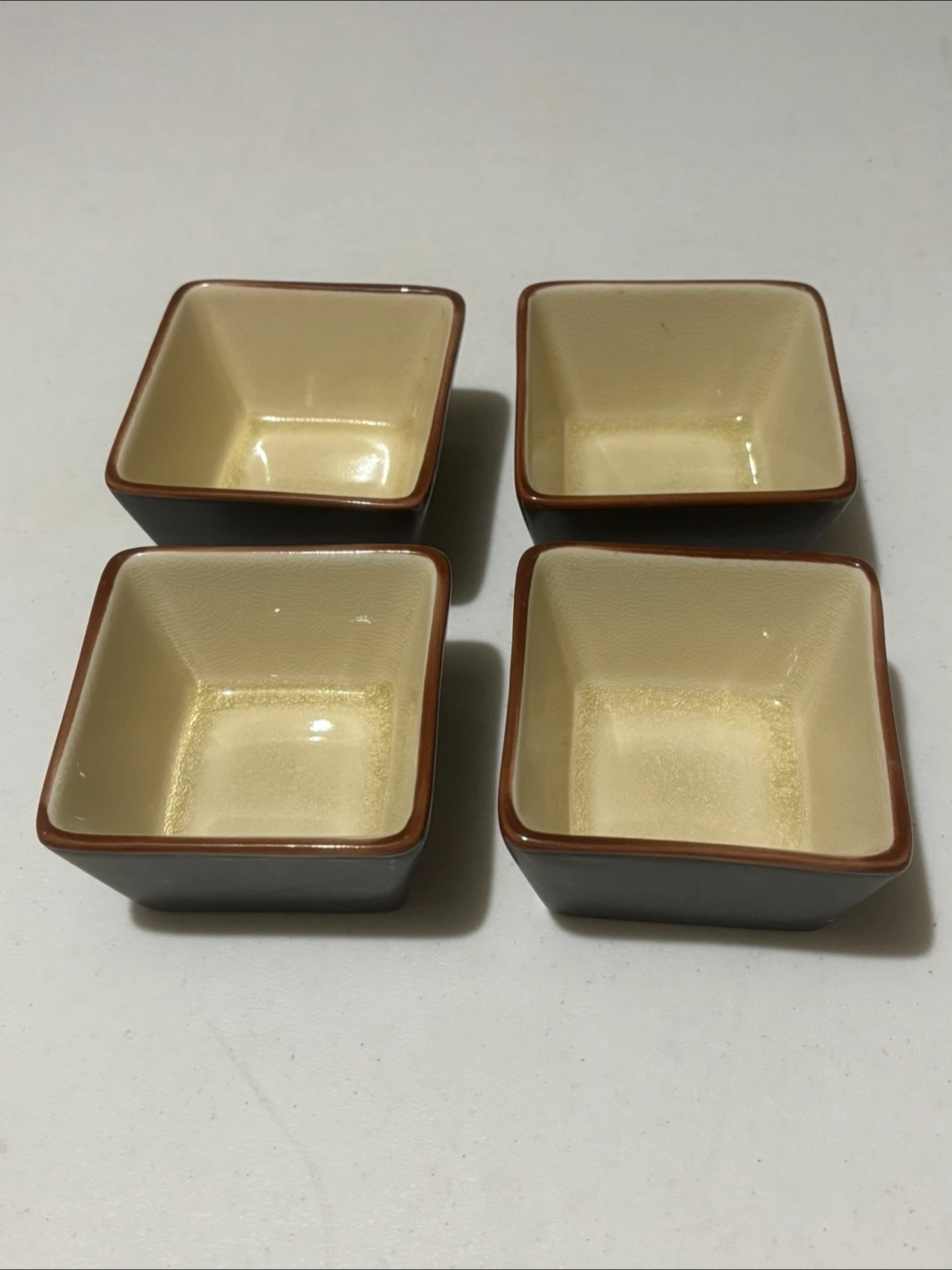 Four small square ceramic bowls. Beige interior, dark brown exterior. Perfect for condiments or sauces. Approximately 3.75 inches square.