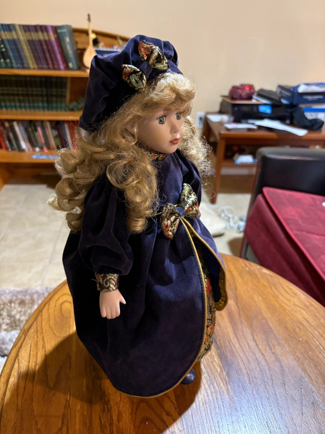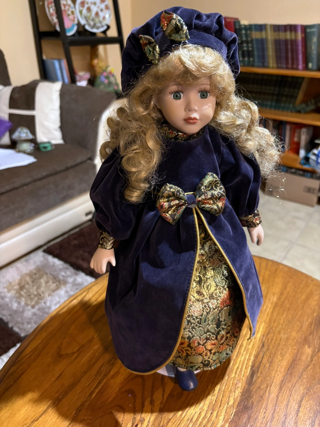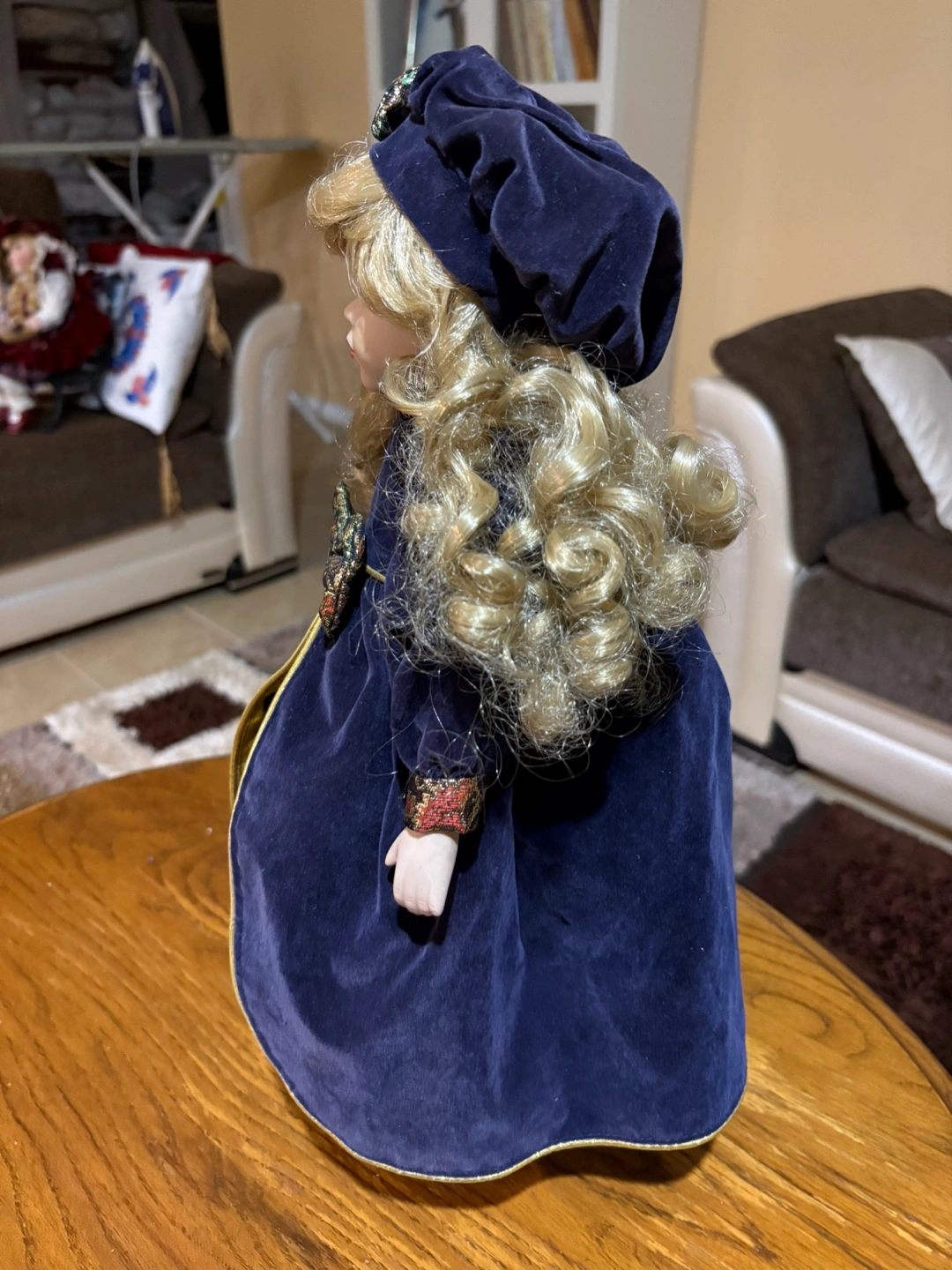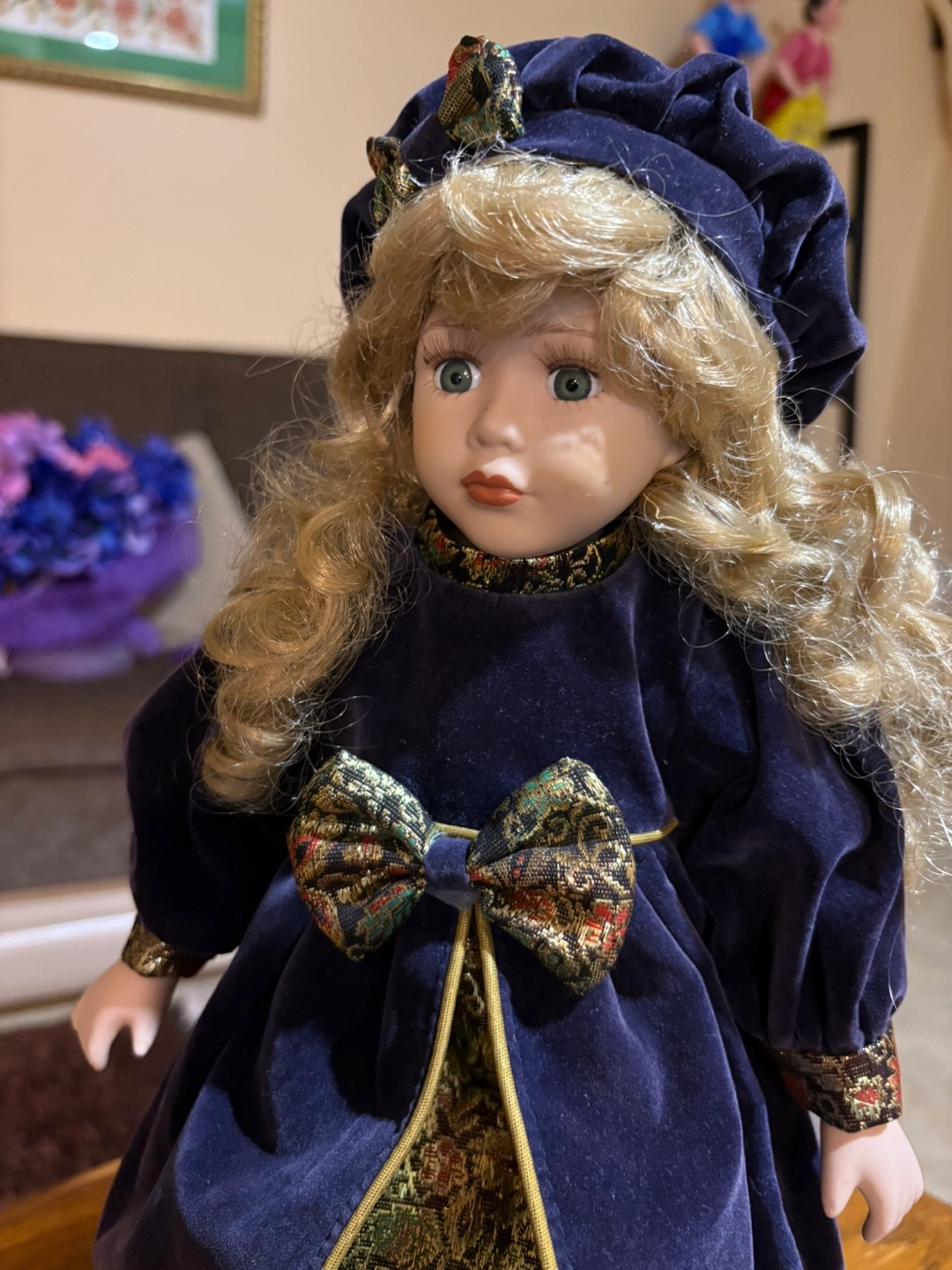 Beautiful porcelain doll. Long blonde curls. Wears a dark blue velvet dress with gold trim and a matching hat. Collectible item. Perfect for display. I can ship it