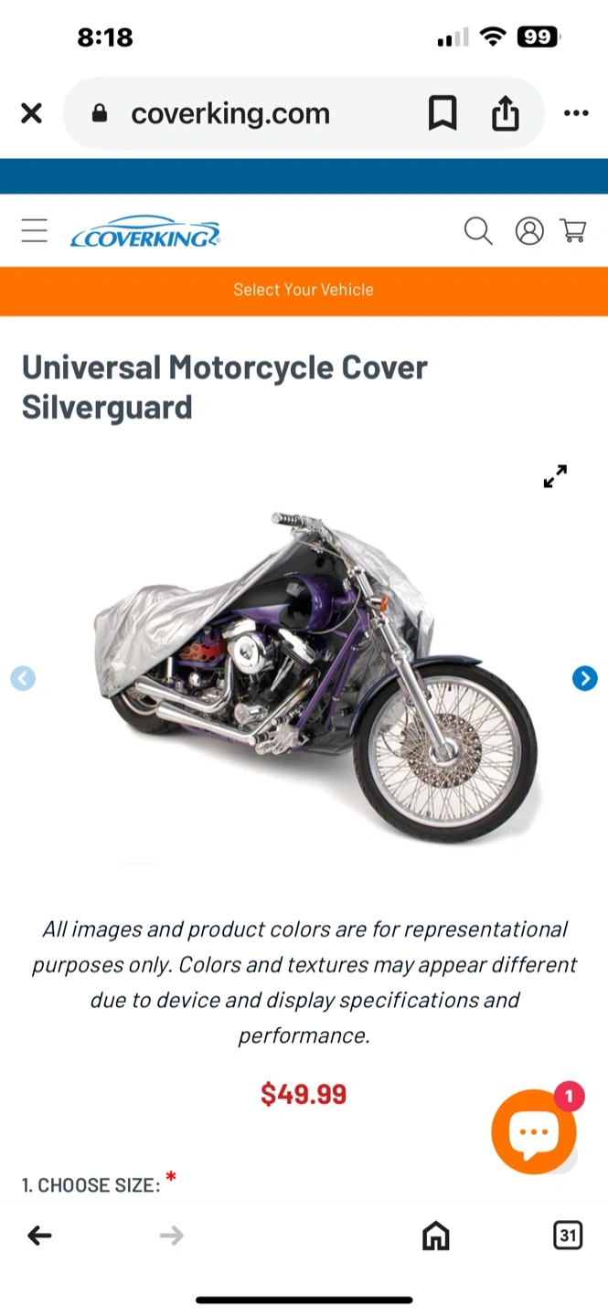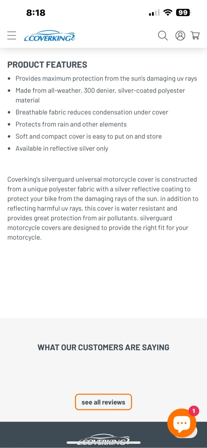 18New, unused Coverking motorcycle cover. Silver, reflective material, silver-coated polyester. Protects from rain and sun. Breathable fabric. Easy to use. See pictures for more details.