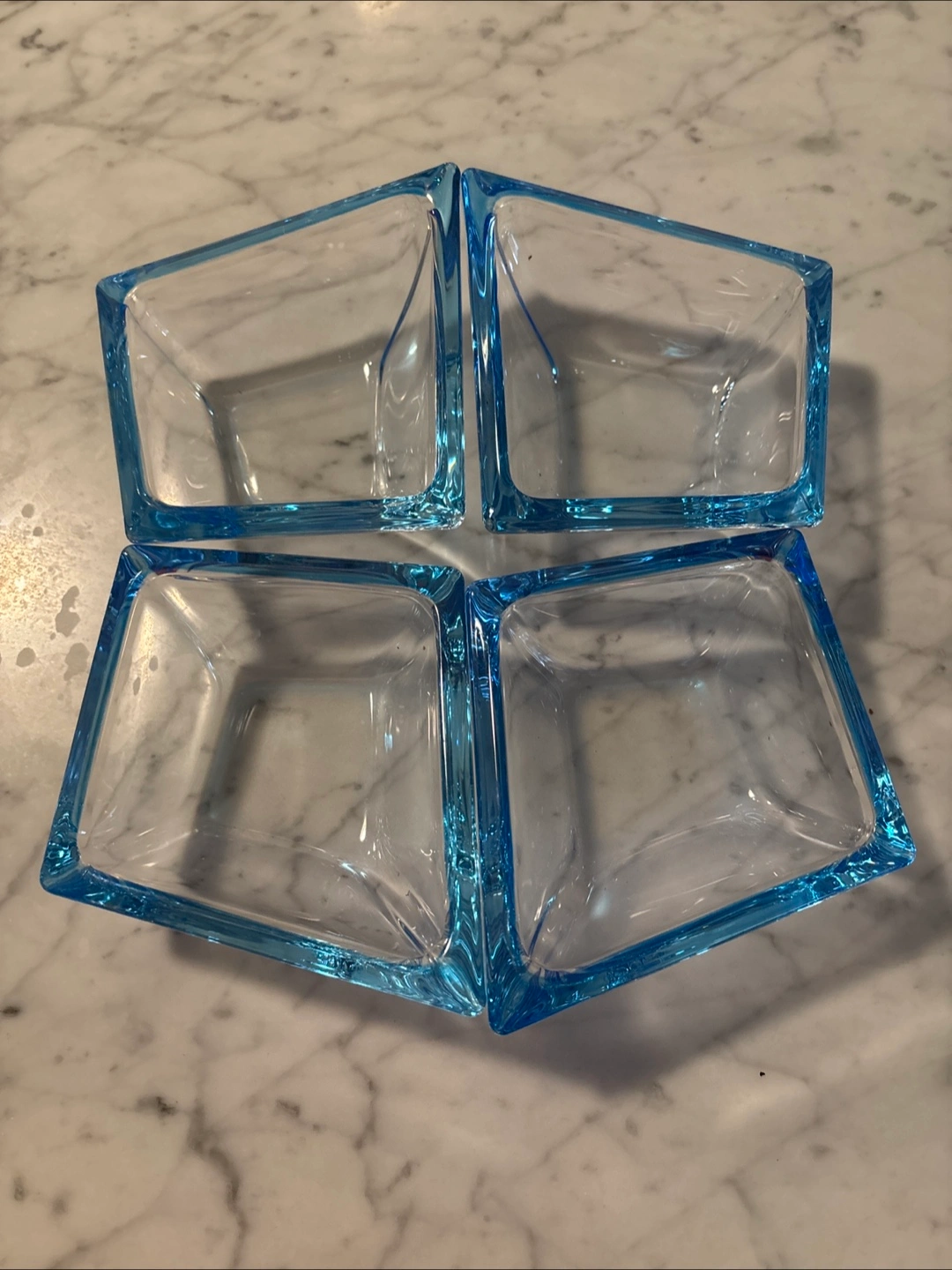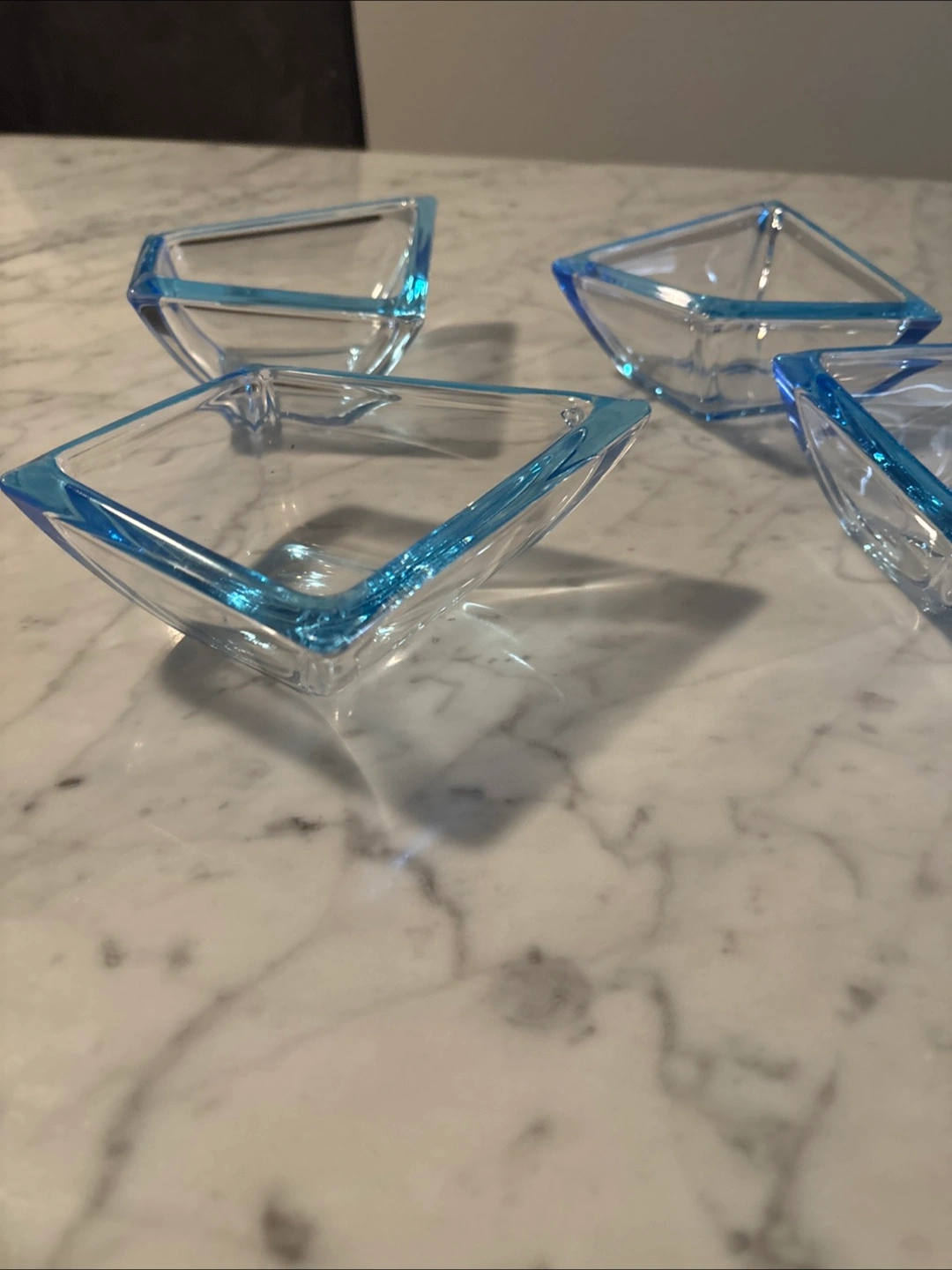 347Set of four small glass dishes. Clear glass with a light blue accent around the rim. Perfect for condiments, spices, or small snacks.