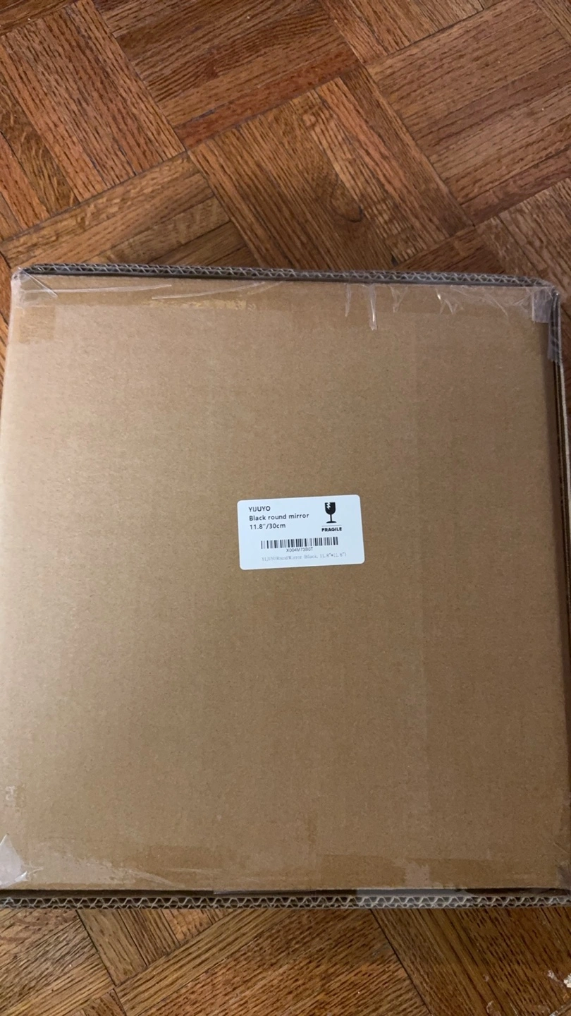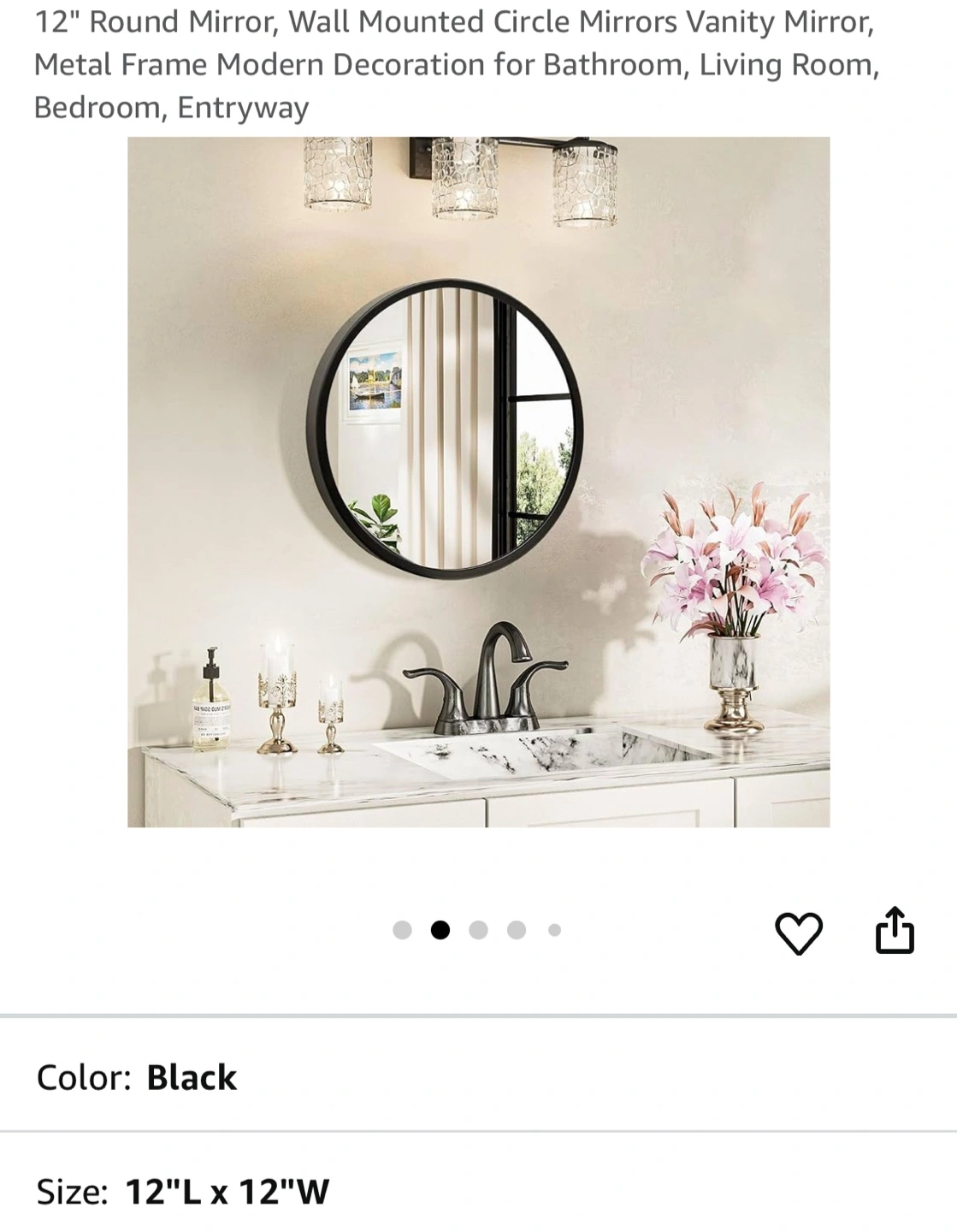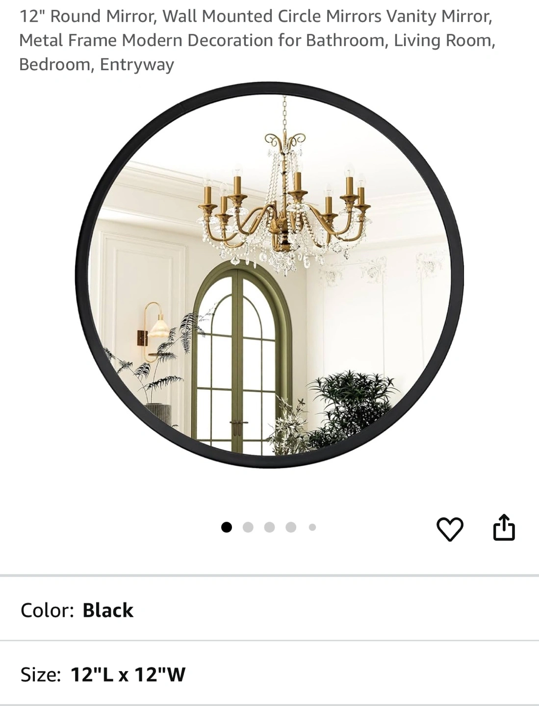 New 12 inch diameter round mirror. Black metal frame. Perfect for bathroom, bedroom, or entryway. Wall mounted.