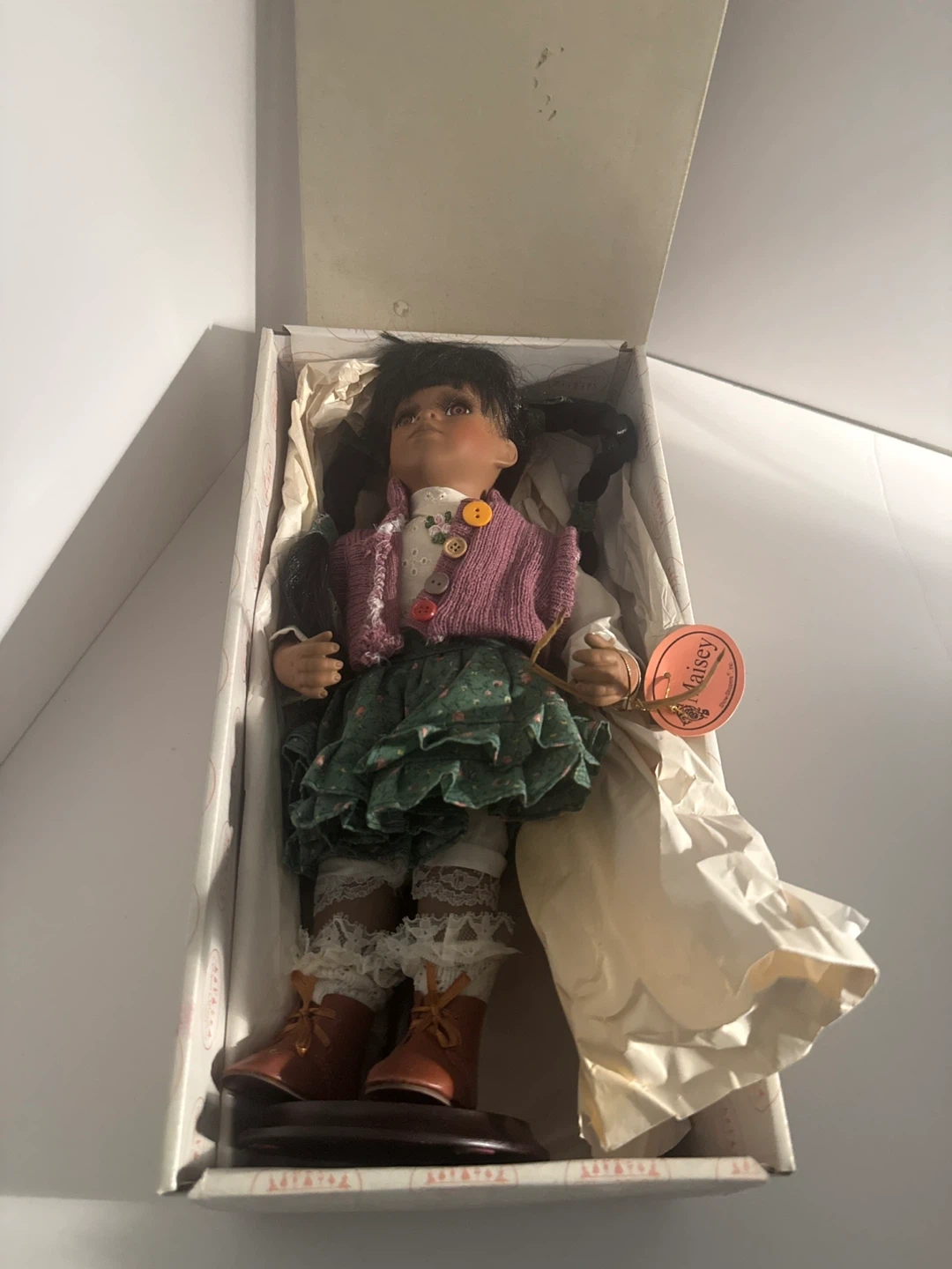 This Maisey doll is from Show-Stoppers Inc. It's dressed in a patterned dress and a purple sweater. The doll comes in its original box with packaging.