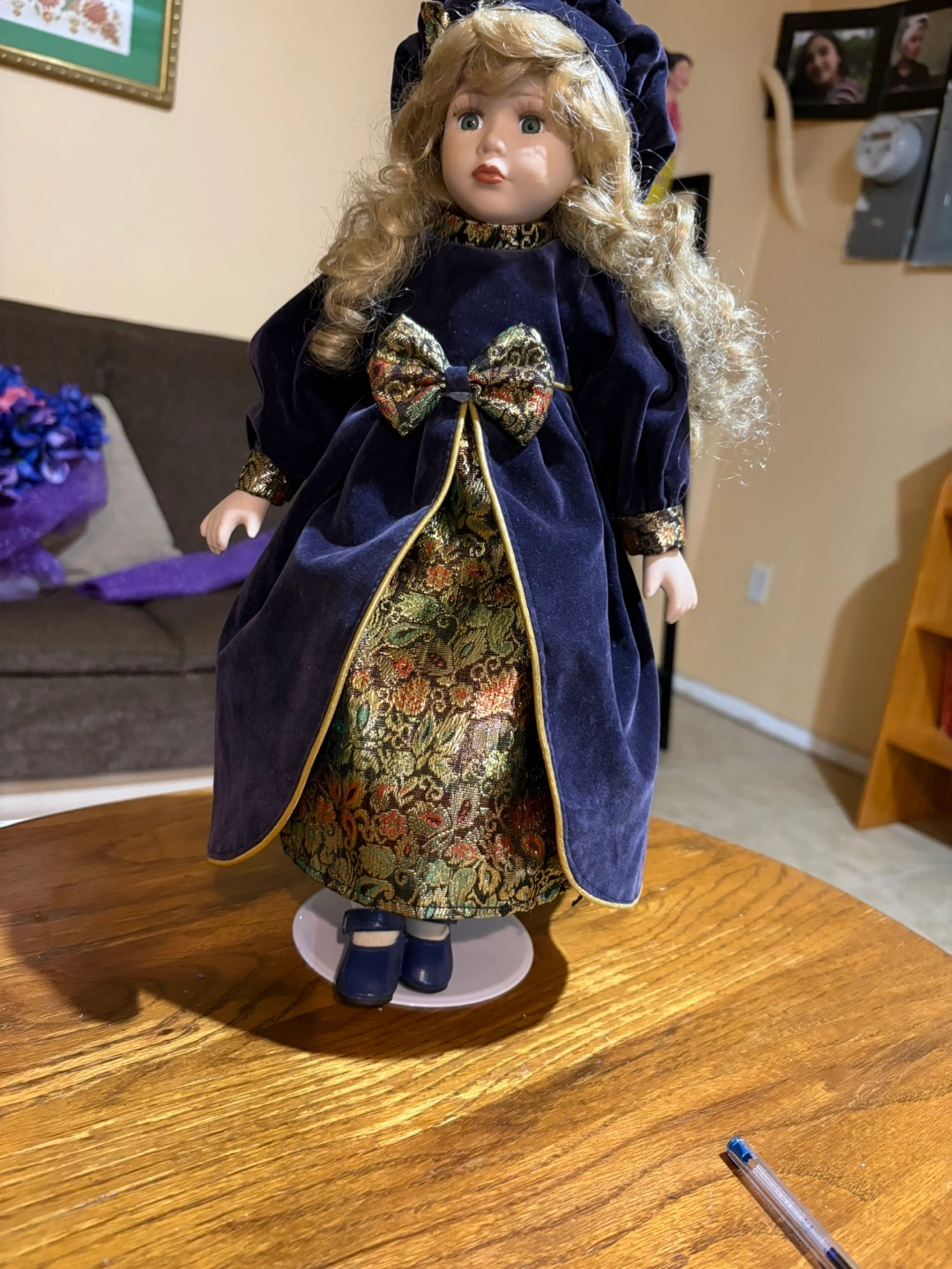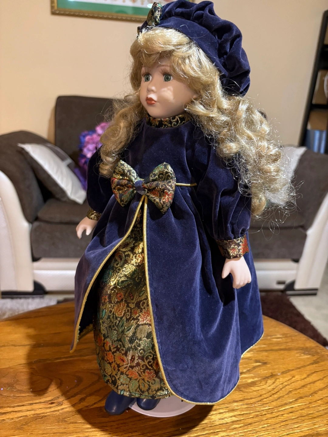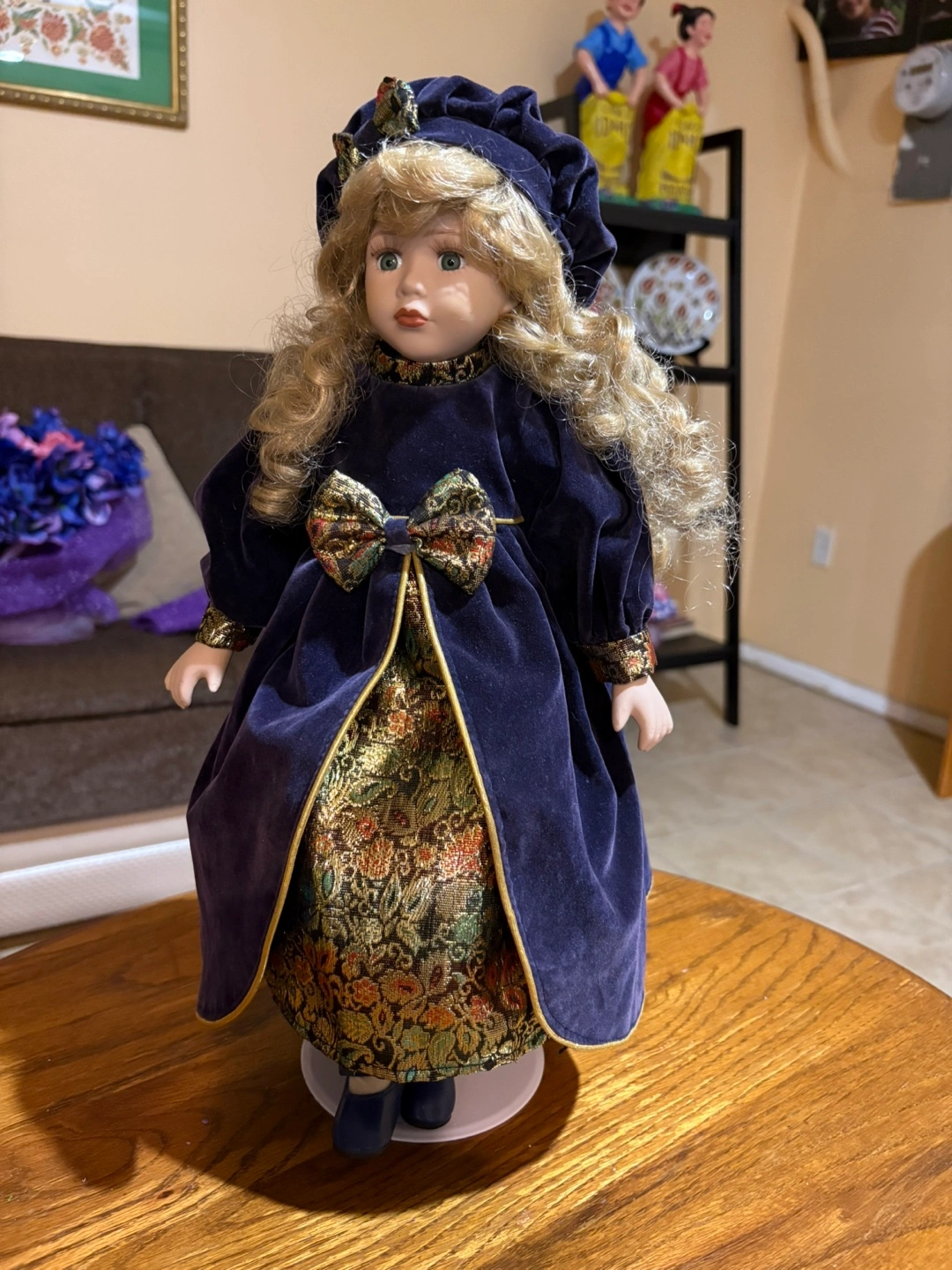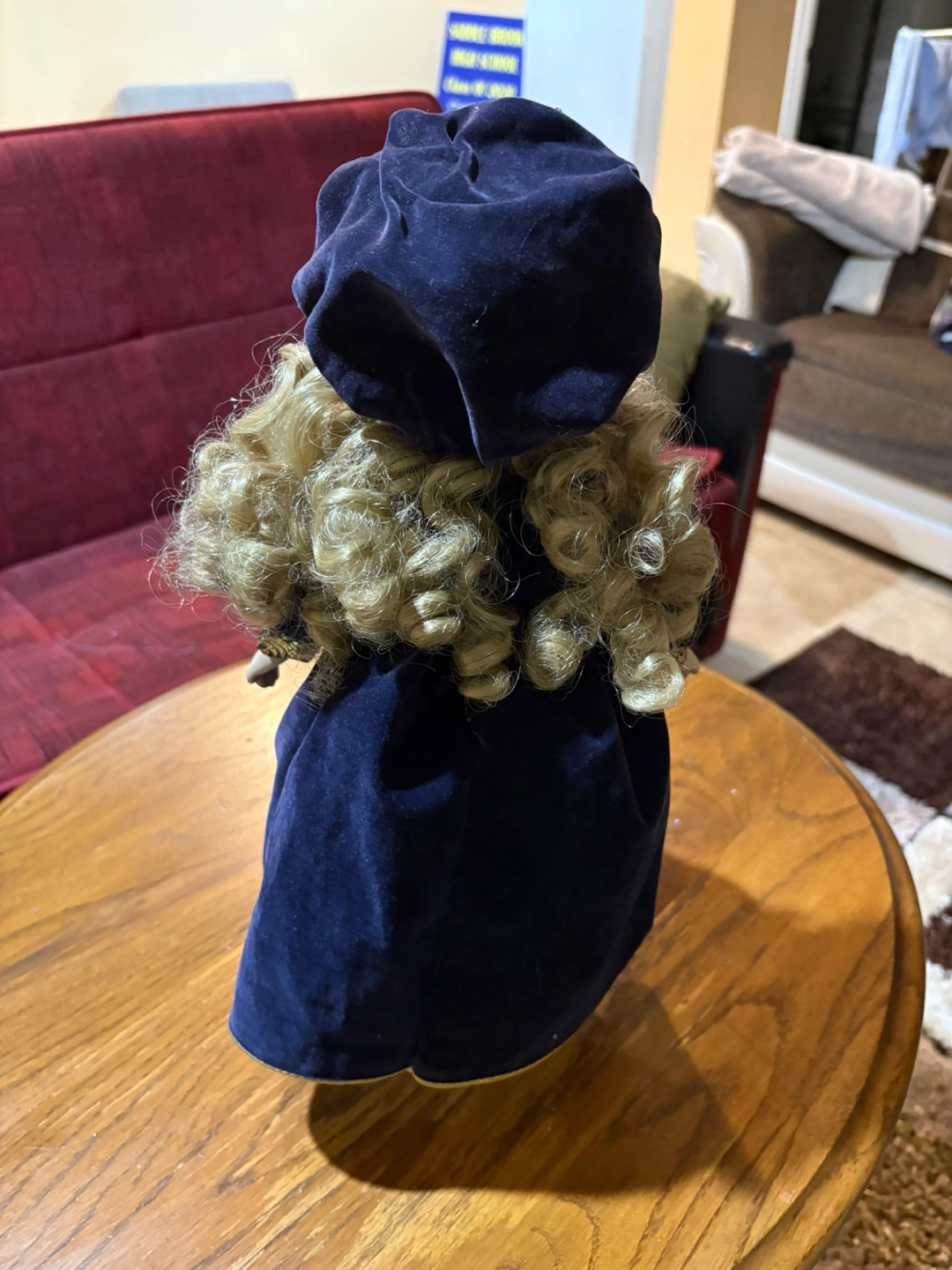 Beautiful porcelain doll. Long blonde curls. Navy blue velvet dress with gold accents. Matching hat. Collectible. Height: 17 “