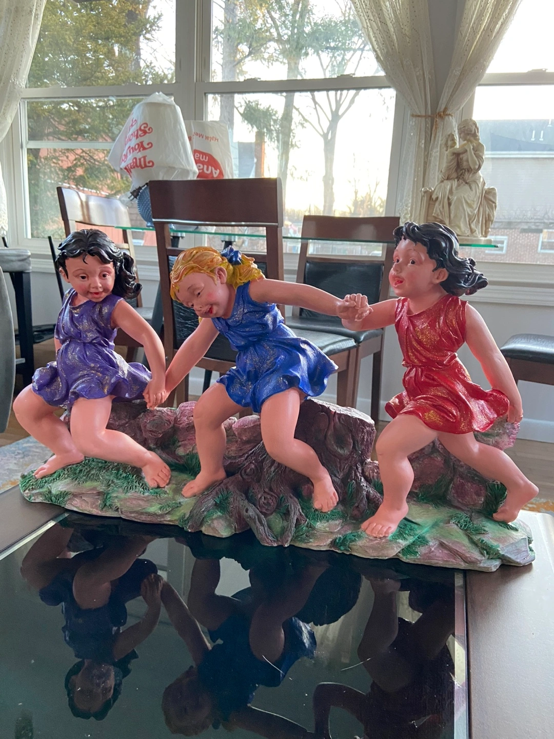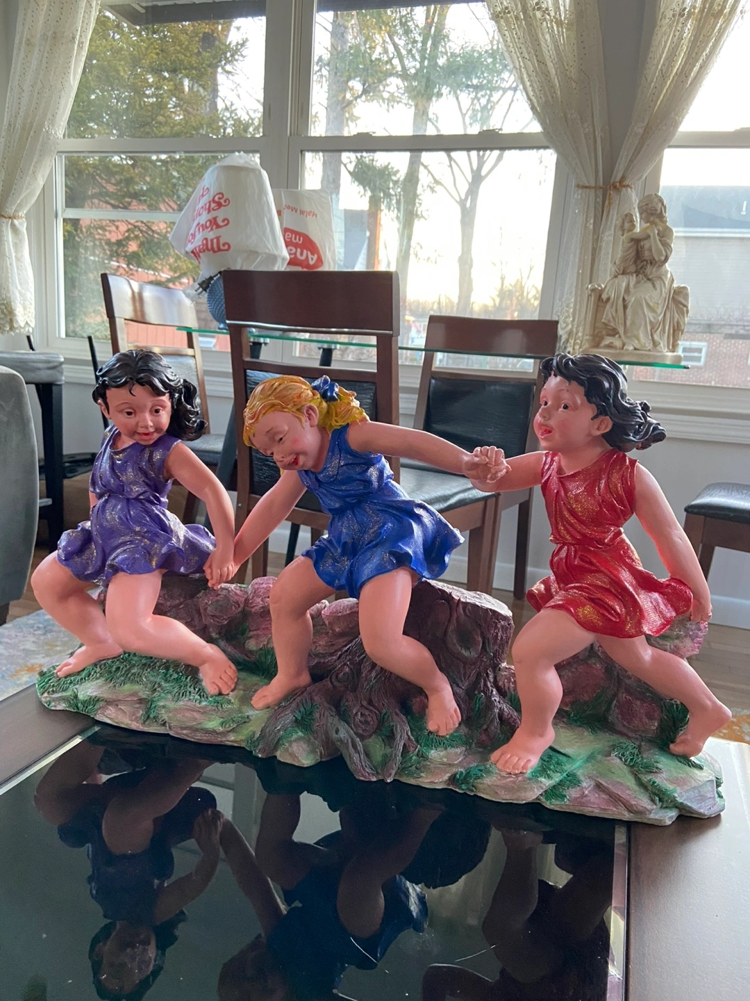 Adorable statuette of three little girls playing. Colorful dresses. Resin material. Great for home decor. Hand painted.