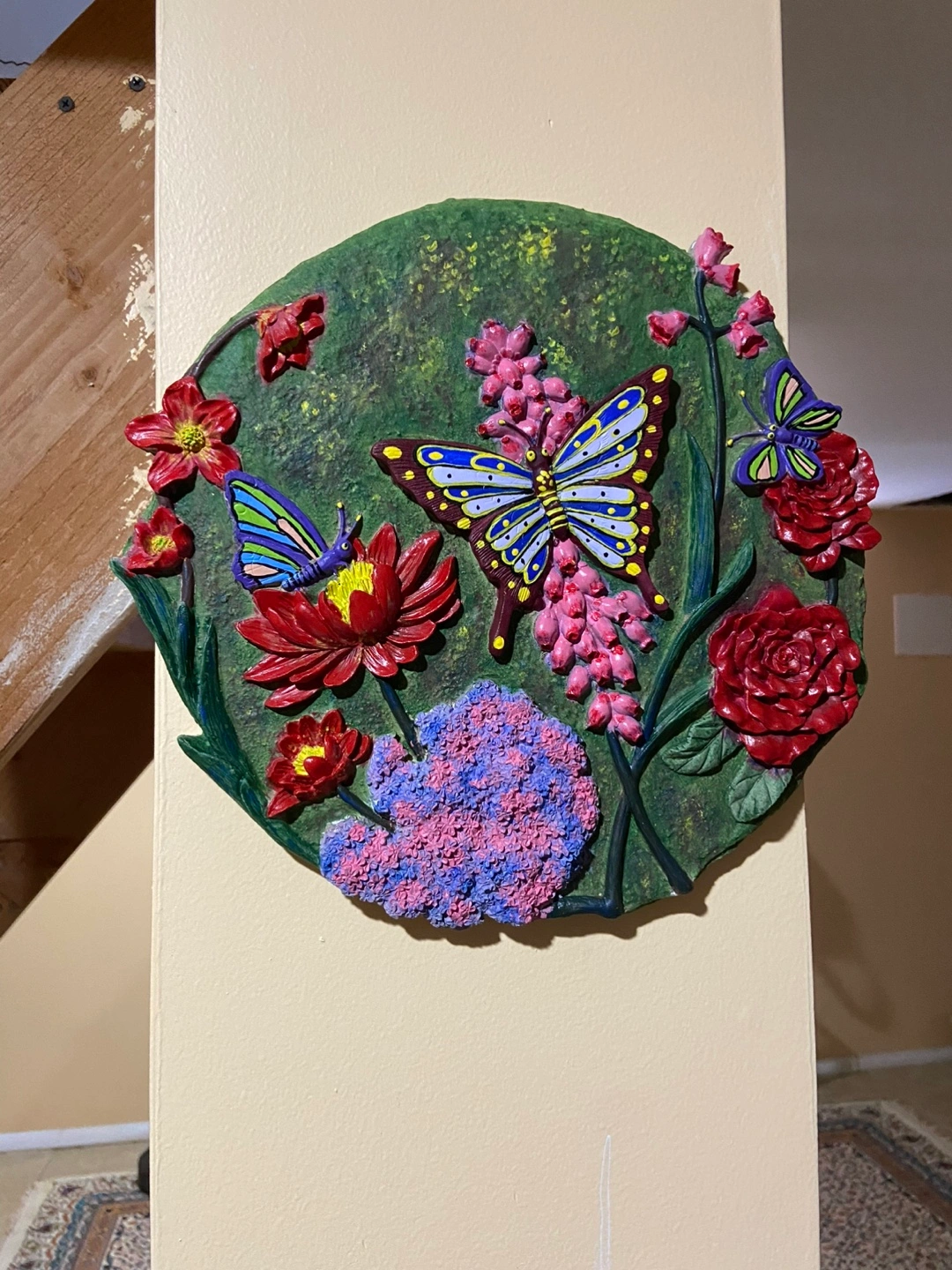 Round garden-themed wall hanging. Features sculpted flowers, butterflies, and foliage. Intricate detail and vibrant colors. Adds a pop of color to any room. Hand Painted