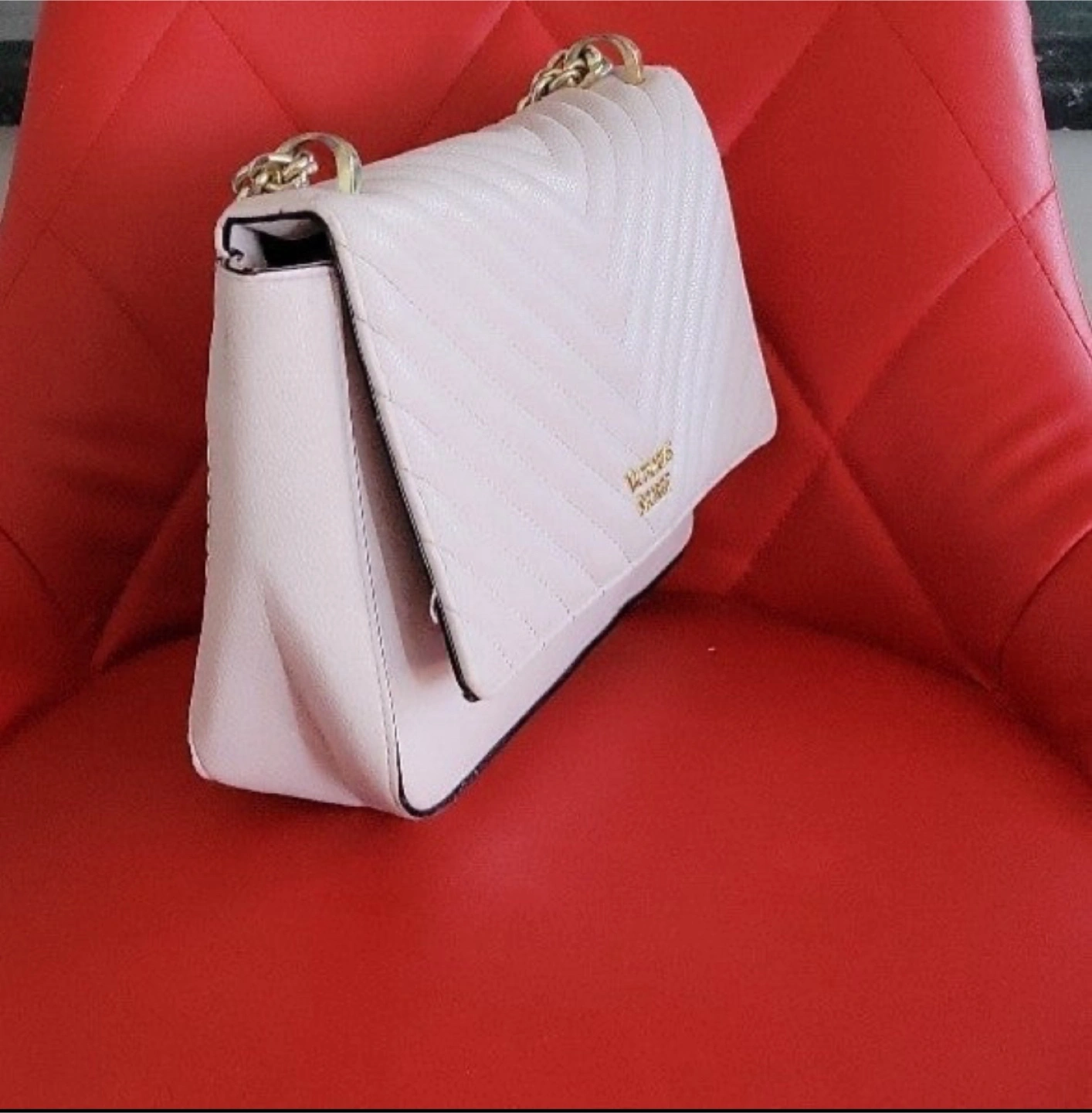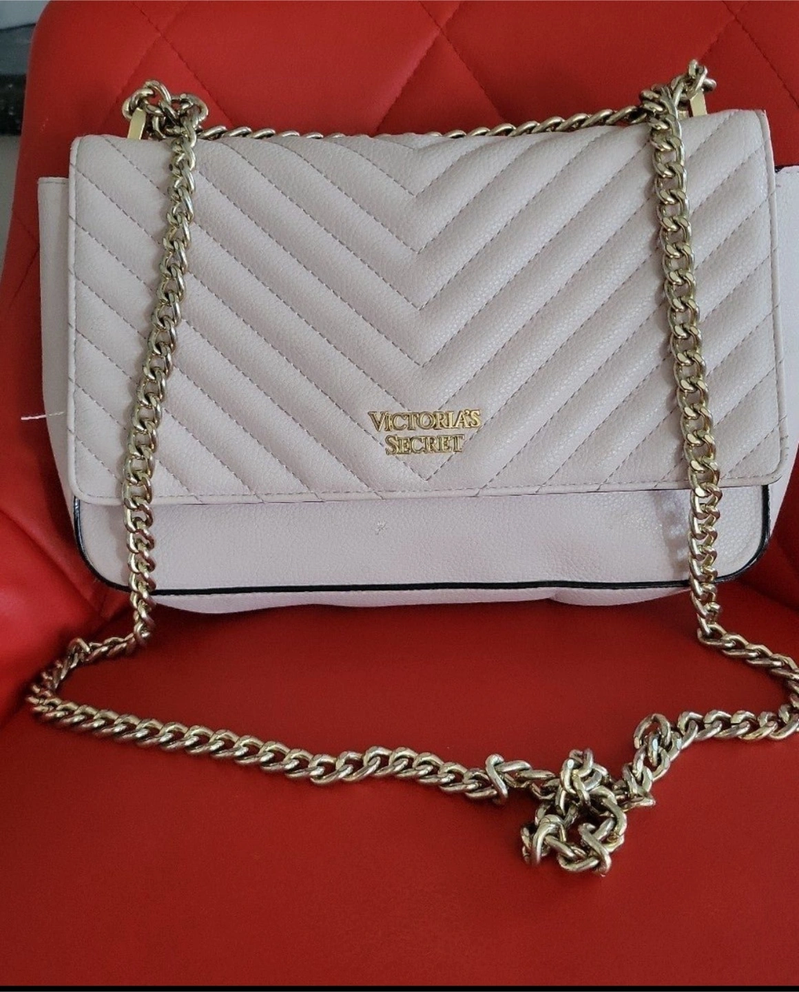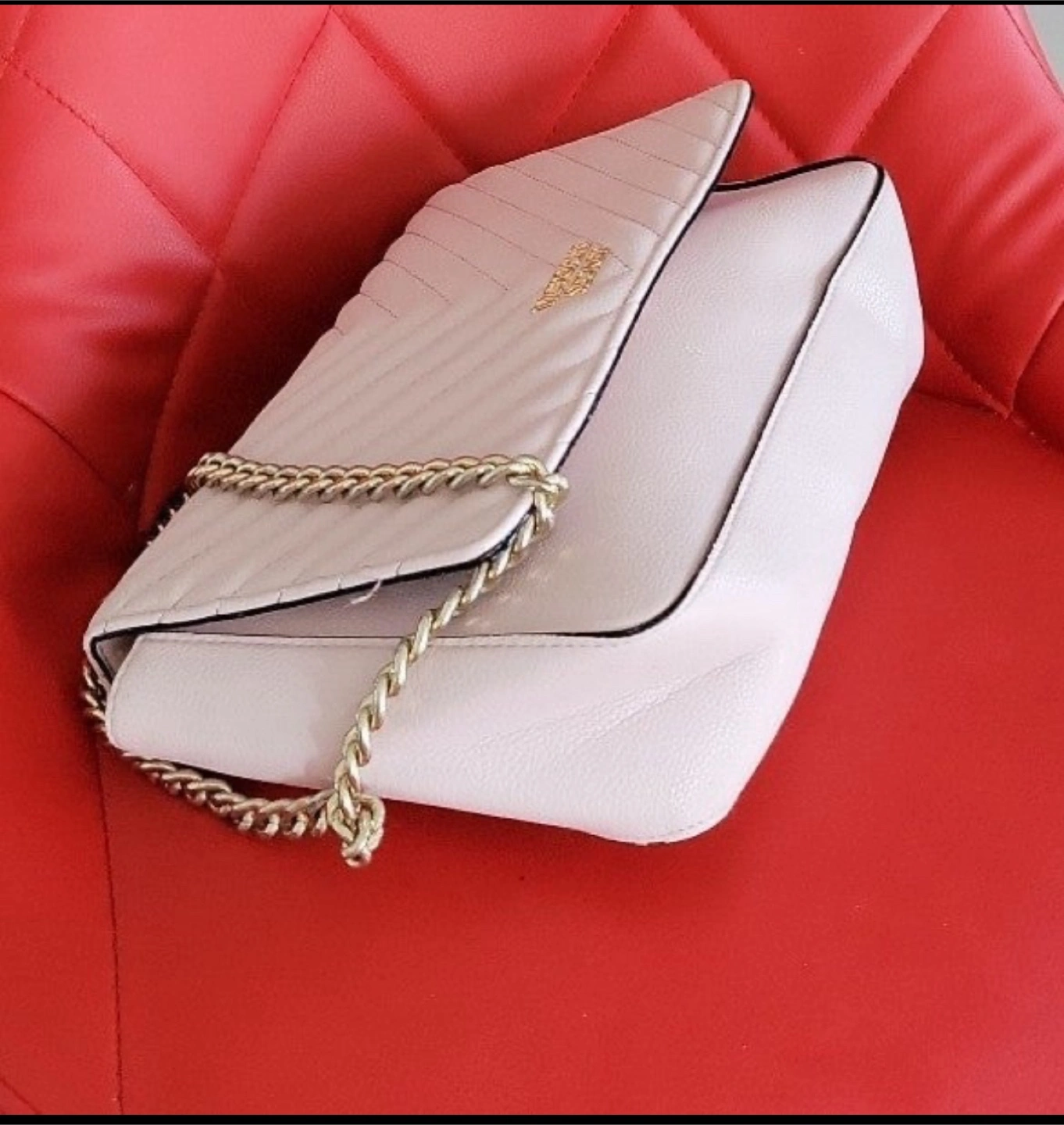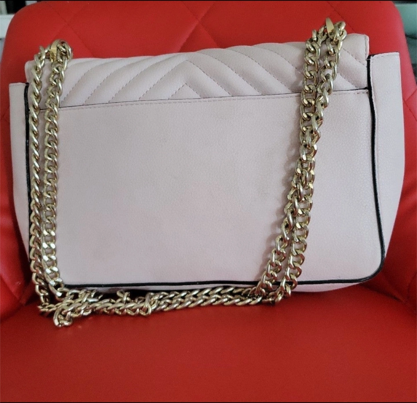 Adorable blush pink quilted crossbody bag. Gold chain strap. Flap closure. Perfect everyday bag.