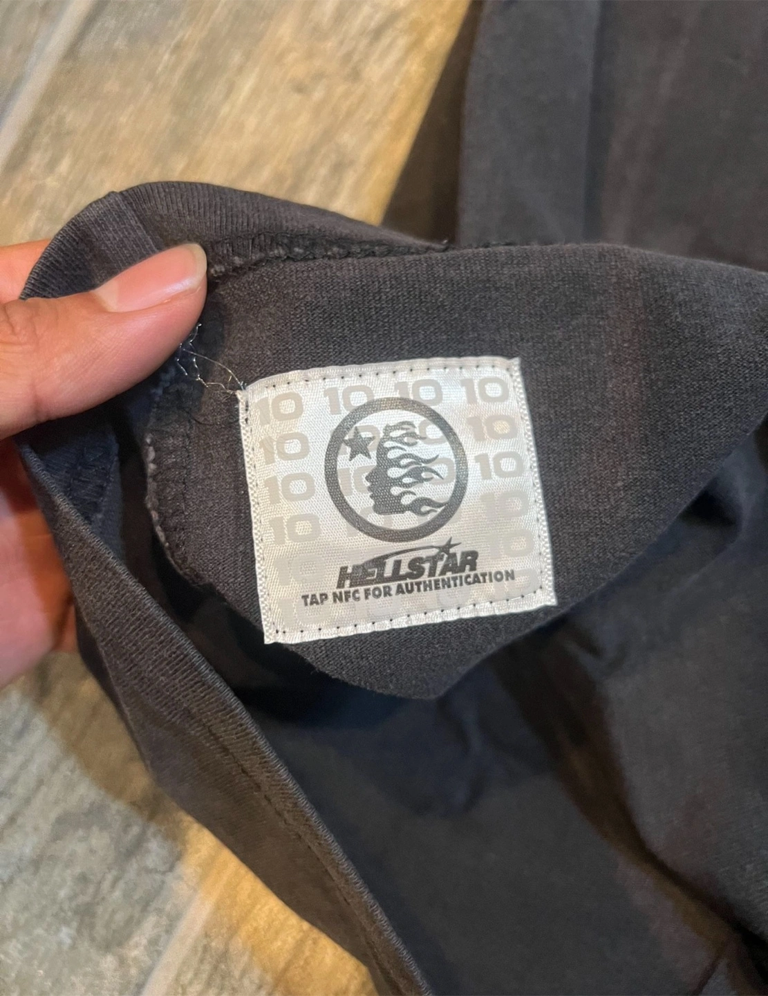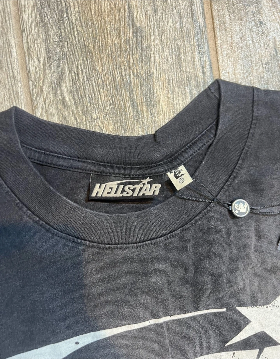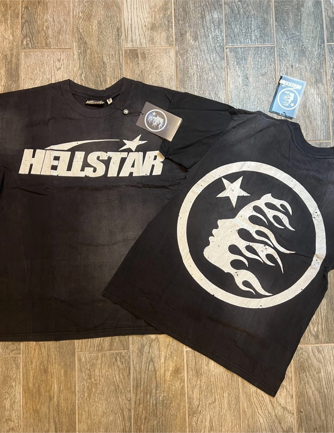 21Black graphic tee. Features Hellstar logo on front and back. Acid wash effect. Men's style. NFC authentication tag.