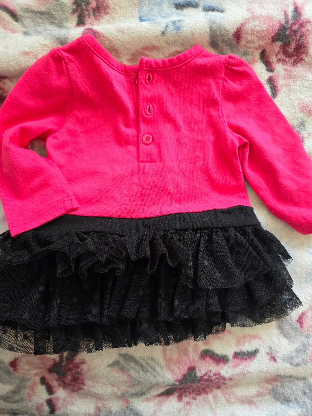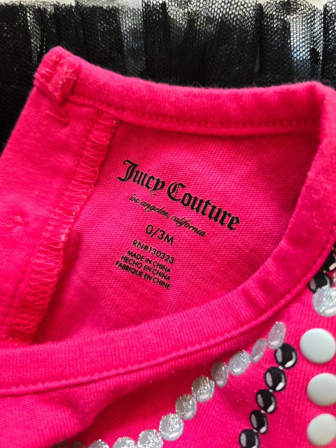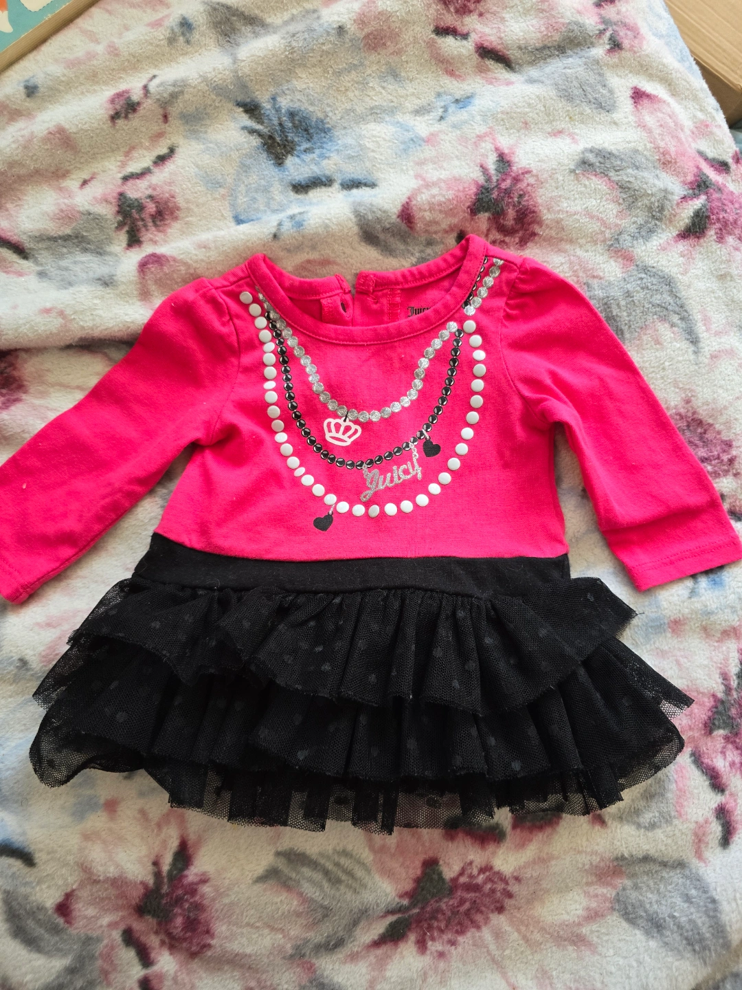 1000+gentle use Adorable Juicy Couture baby girl's dress. Pink long-sleeve top with black tulle tutu bottom. Features a jeweled necklace design. Size 3 months.