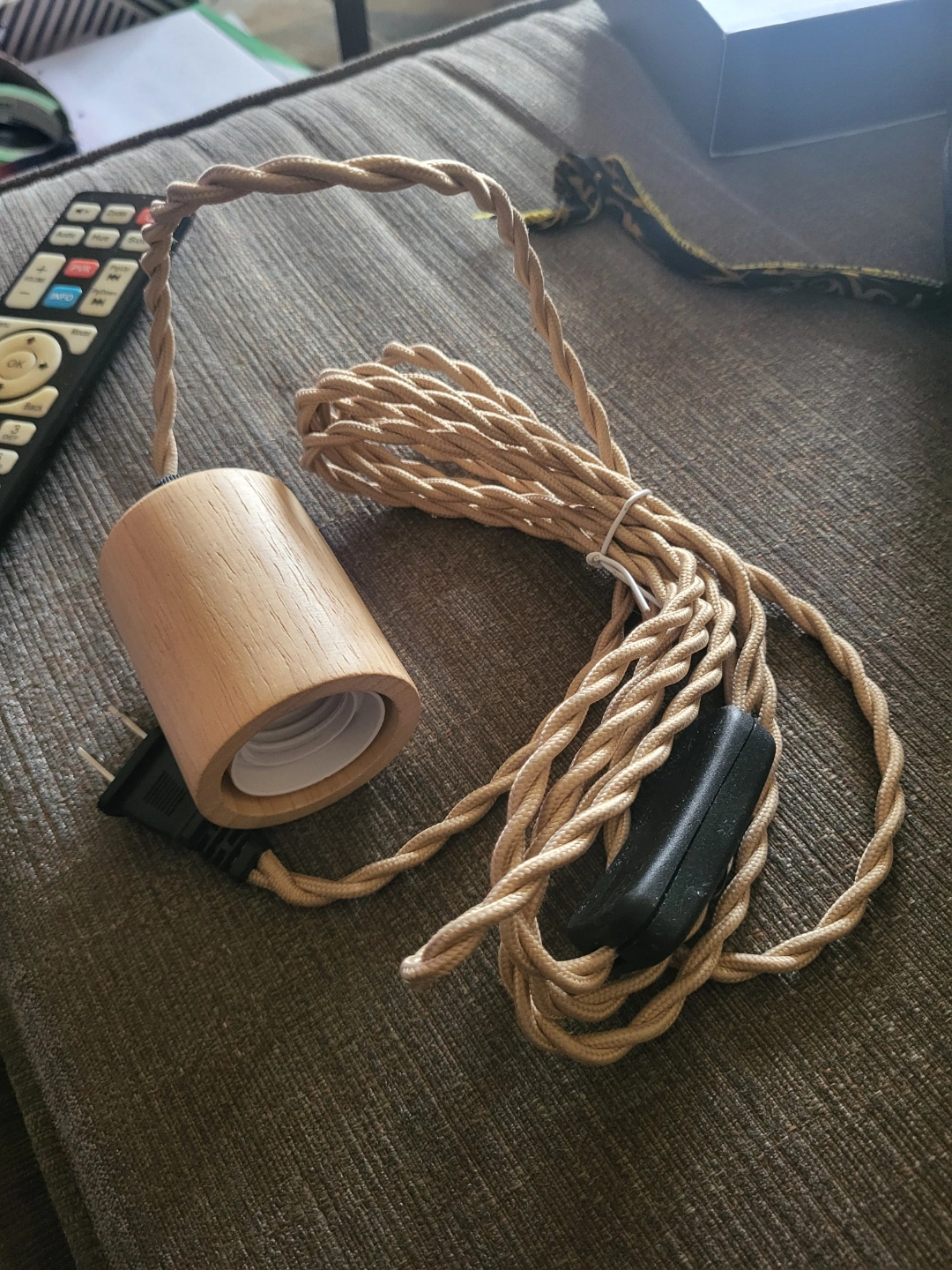 The item shown is an Arturesthome Wood Pendant Light Cord Kit with a switch and a twisted nylon rope cord. It is designed for DIY projects and can be used as a pendant light, table lamp, or wall light.