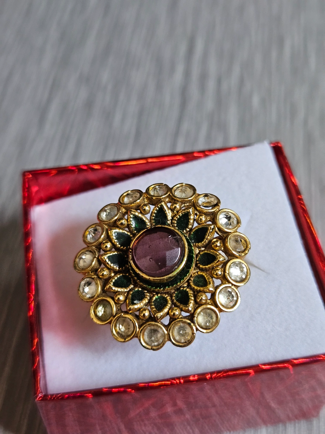 92Beautiful ring. Features a large purple gemstone surrounded by smaller clear stones and green enamel accents. Gold-toned metal. Comes in a red gift box.