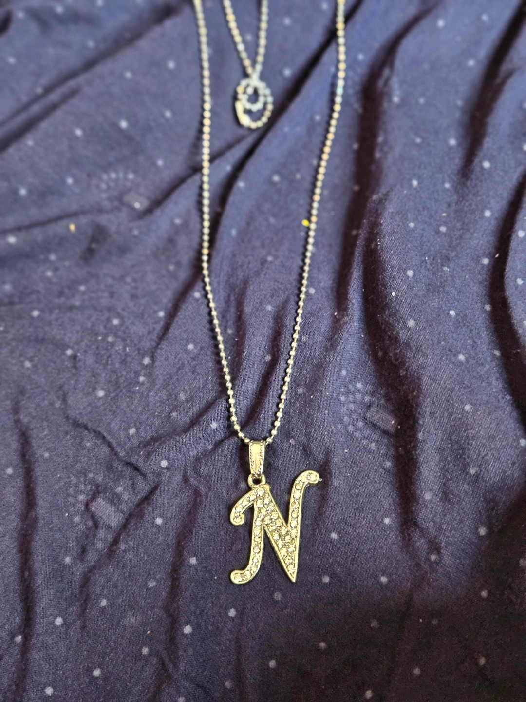 92Dainty silver chain necklace. Features a sparkly crystal N pendant. Perfect layering piece.