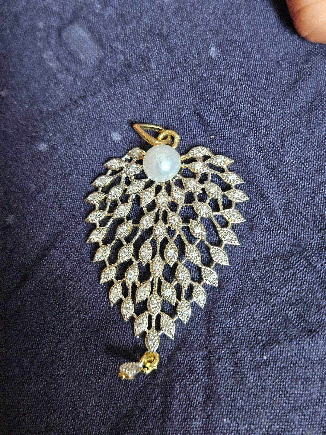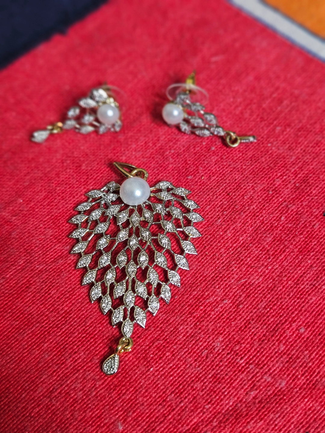 82Beautiful pendant and earrings set. Features a leaf design with sparkling cubic zirconia stones and a single pearl accent. Gold-toned metal. Perfect for adding a touch of elegance to any outfit.