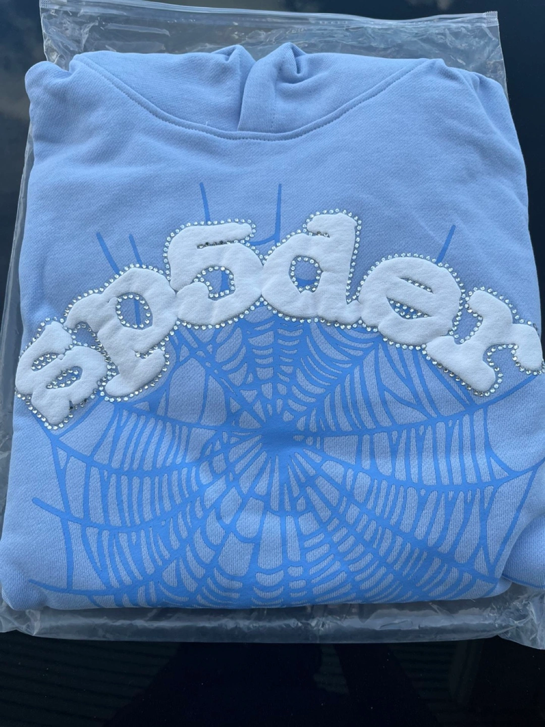115Brand: Sp5der Color: Sky Blue Condition: New Size: Medium Material: 100% Soft cotton Design: Iconic spider web graphic on front