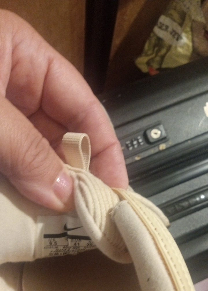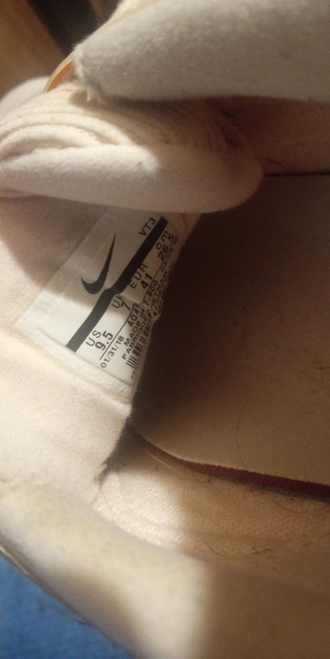 584Cream-colored Nike Air Max 97 sneakers. Women's size 9.5. Features corduroy-like material and gold accents. Pre-owned condition.