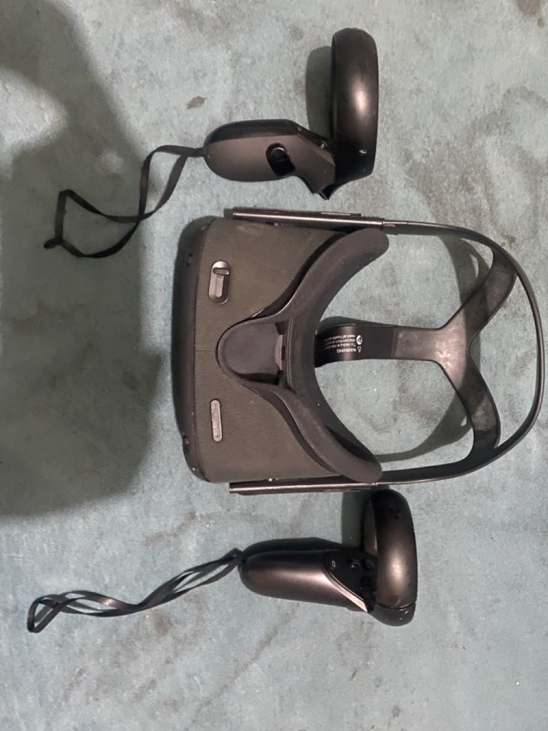 VR Headset, two controllers, and straps. Good condition. Includes all shown components.