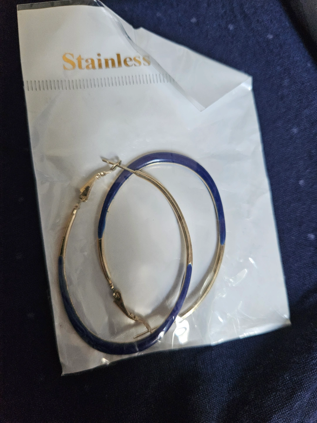 92Large gold hoop earrings. Blue enamel accents. Stainless steel. New, never worn.