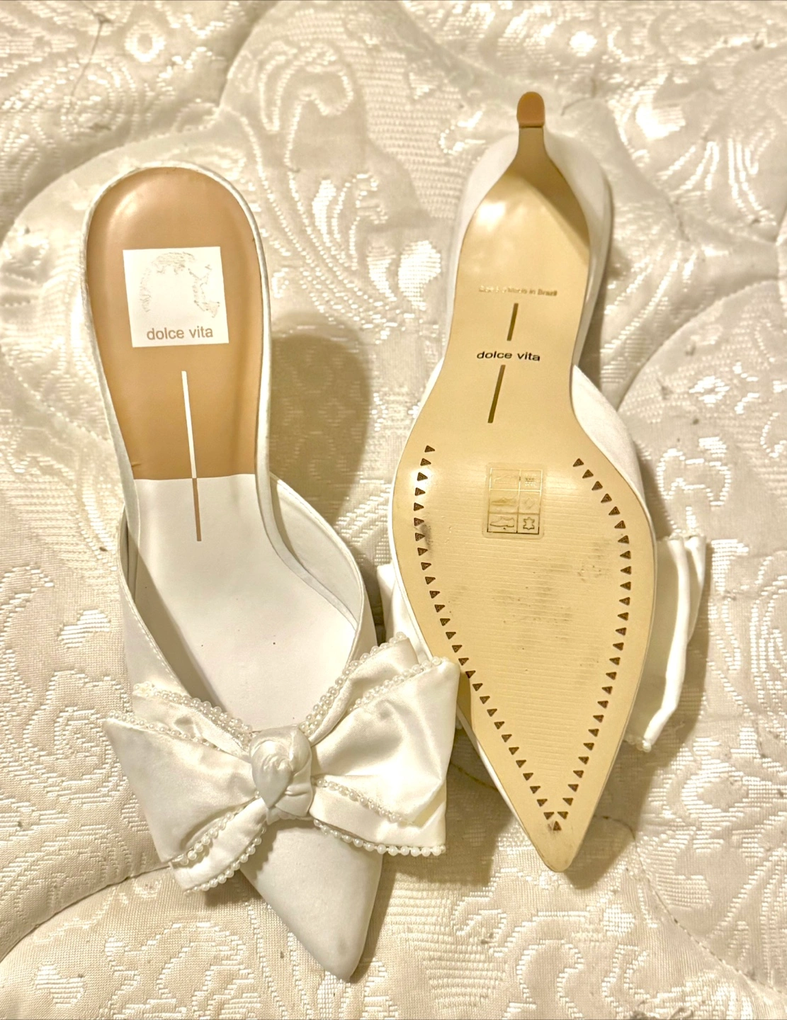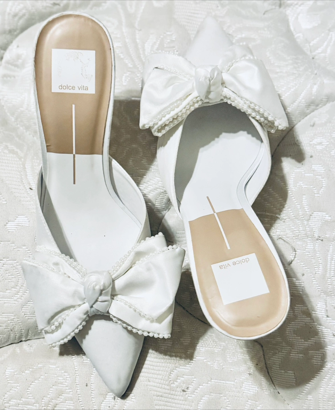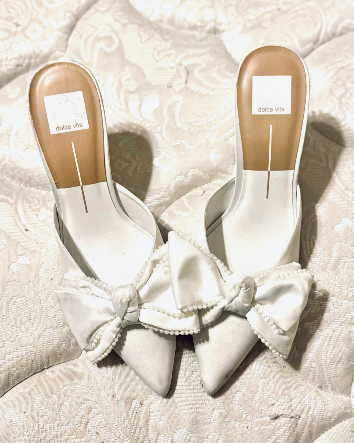 Beautiful white satin mules. Pointed toe. Features a large satin bow with pearls . Medium heels. NWT Size 8