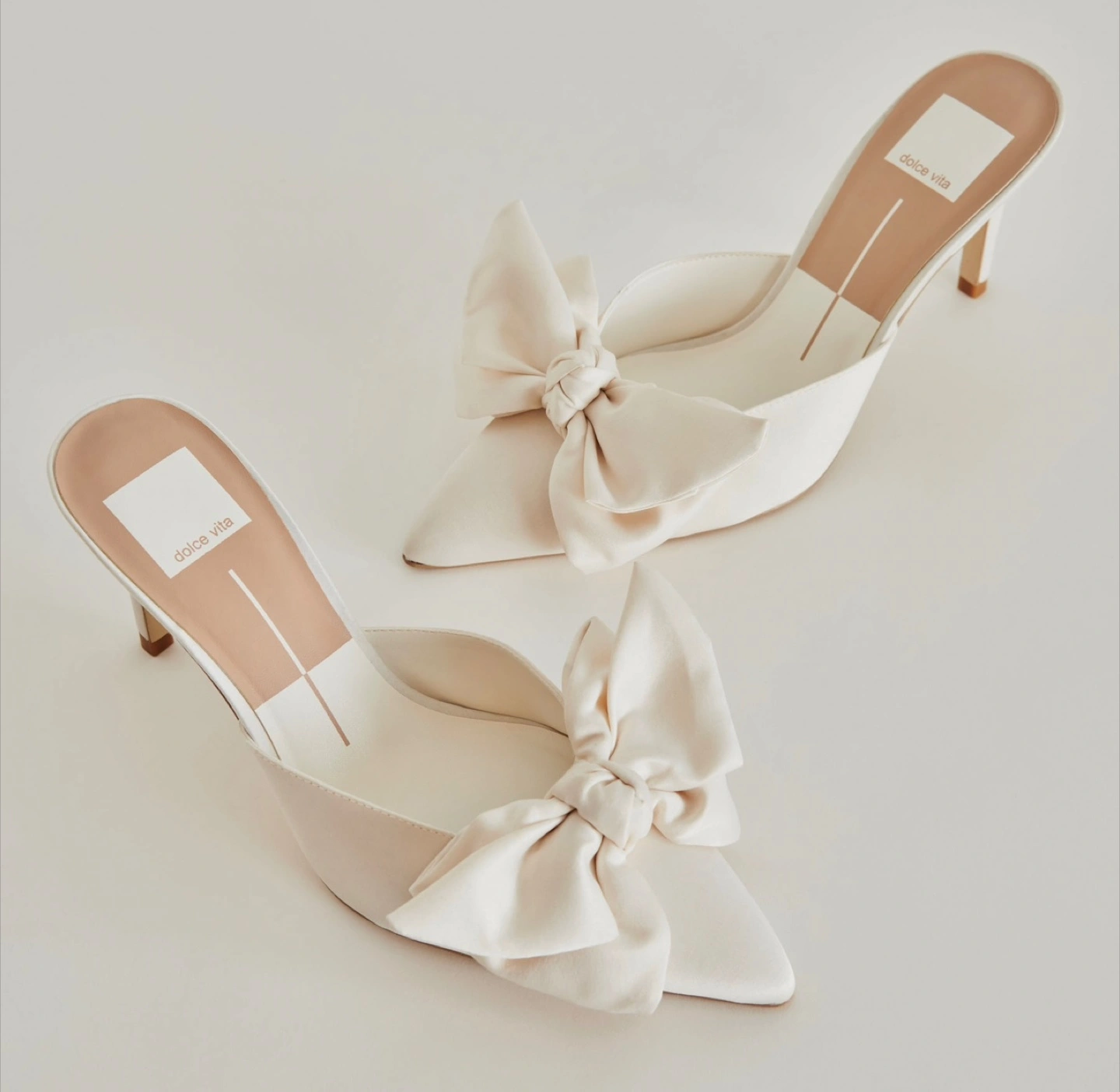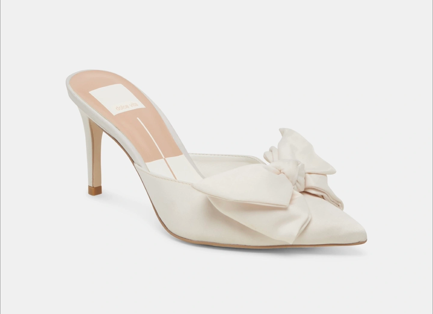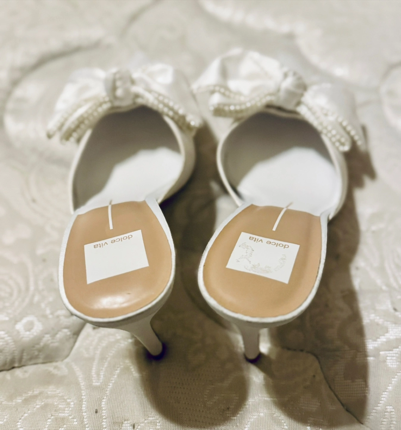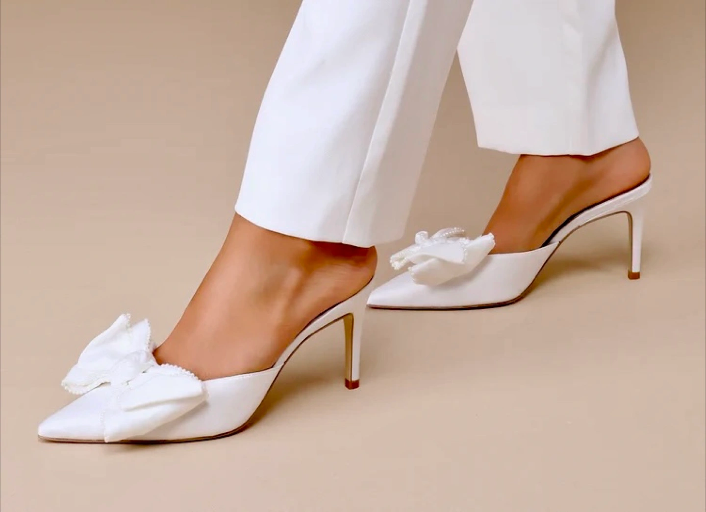 Beautiful white satin mules. Pointed toe. Features a large satin bow with pearls . Medium heels. NWT Size 8