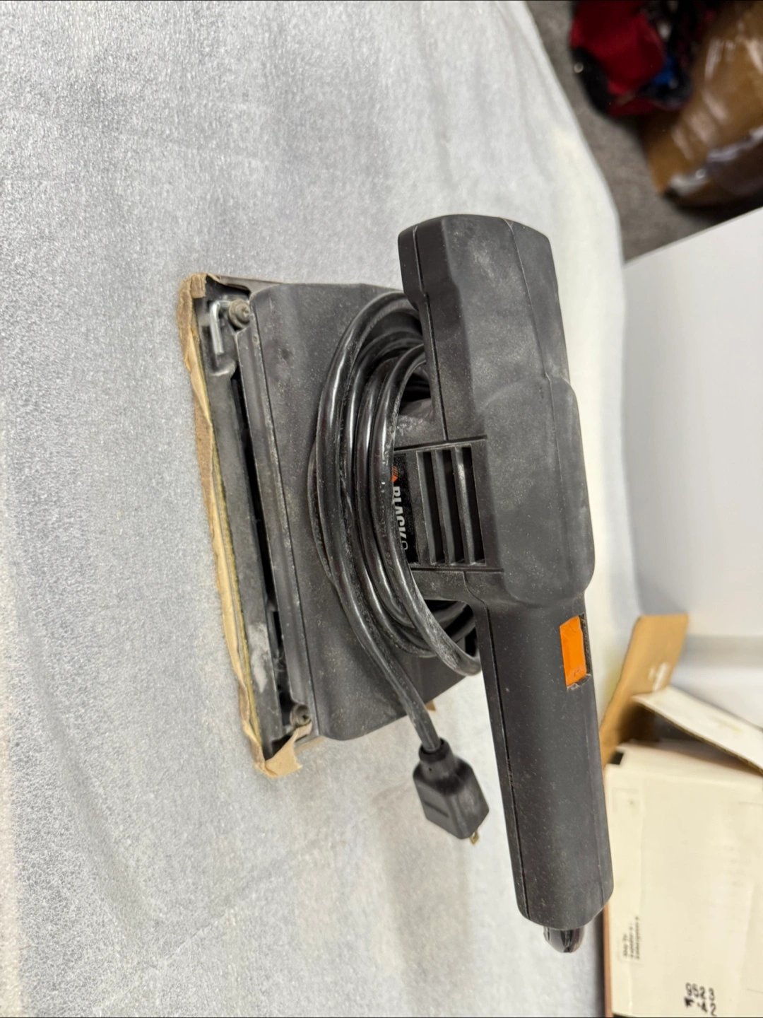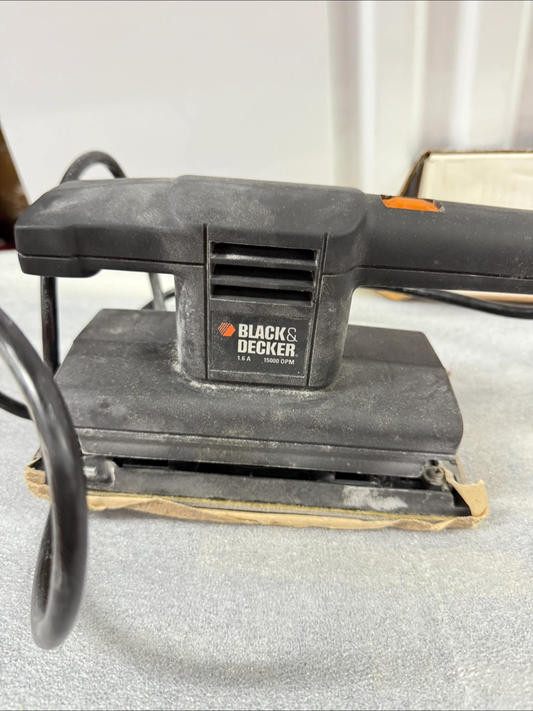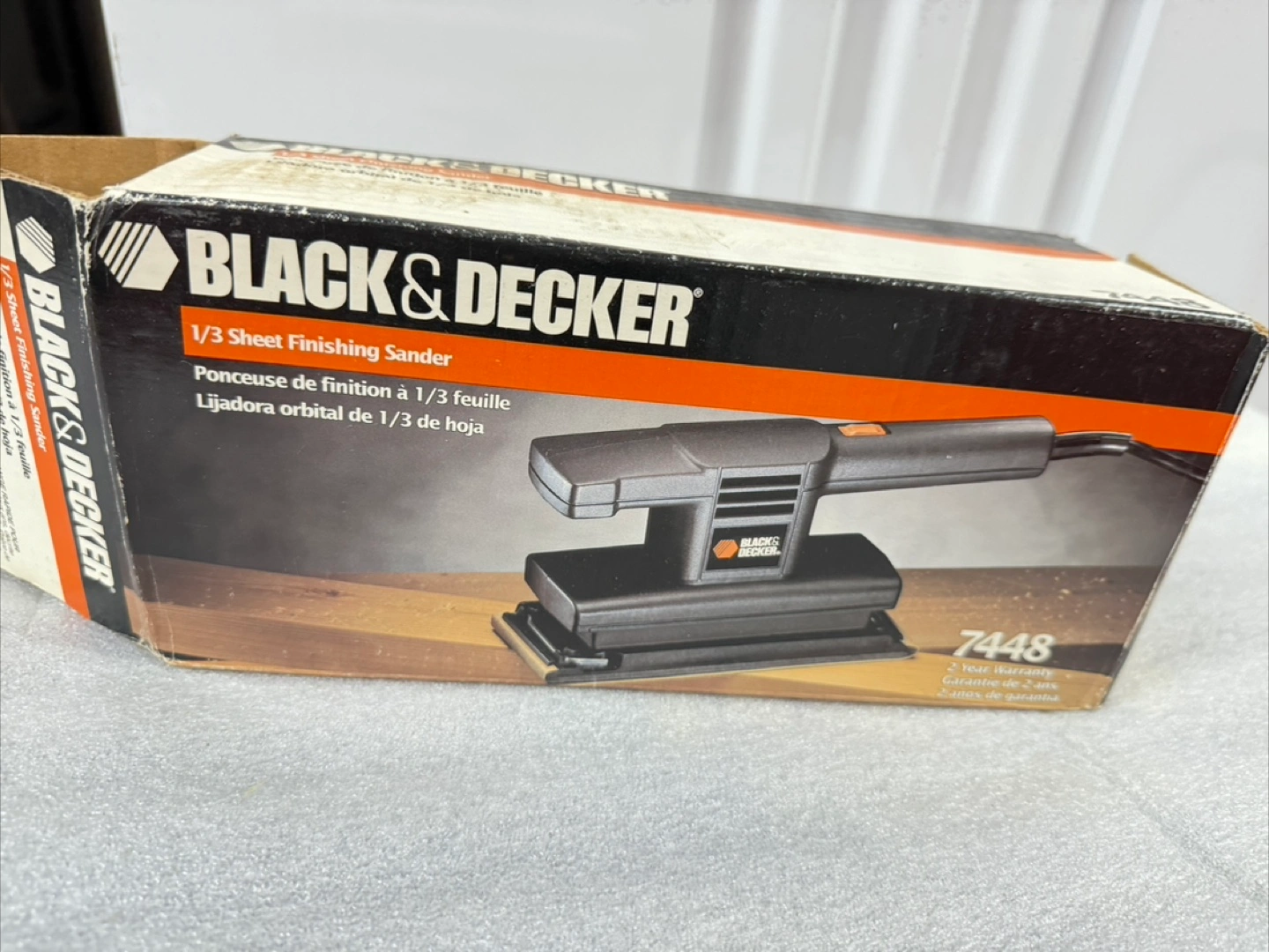 Black & Decker 1/3 sheet finishing sander. Model 7448. 1.6 A, 15000 OPM. Used condition. Comes in original box.