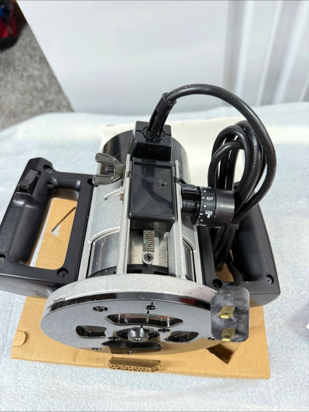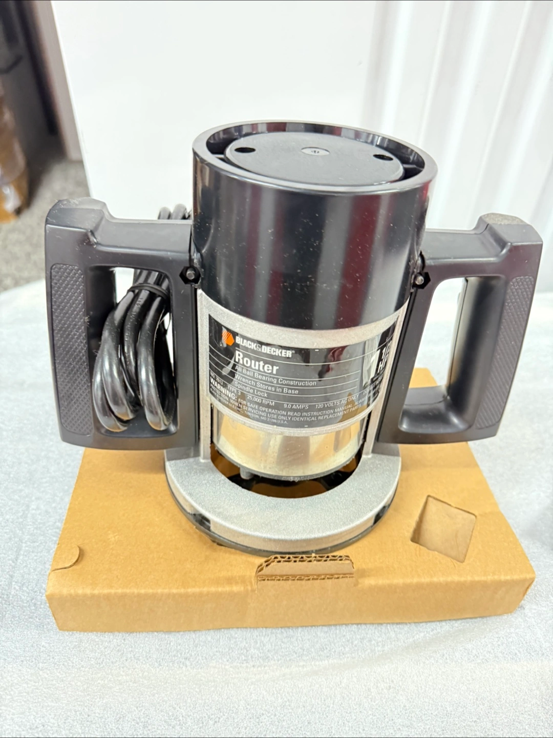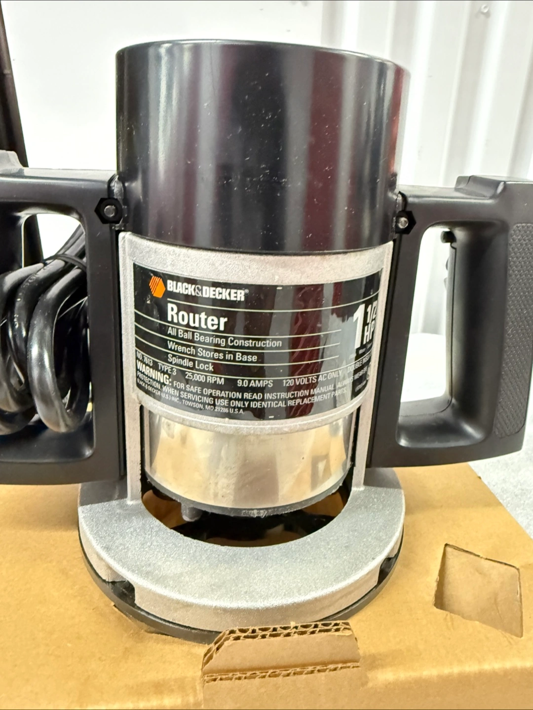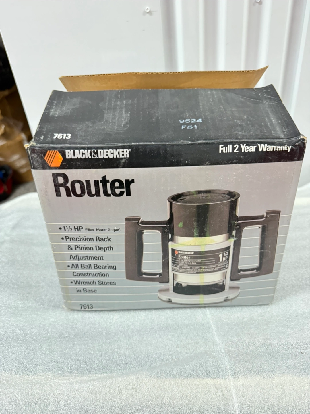 Black & Decker router, model 7613. 1/2 HP (max motor output). Features precision rack and pinion depth adjustment. All ball bearing construction. Wrench stores in base. Includes original box.