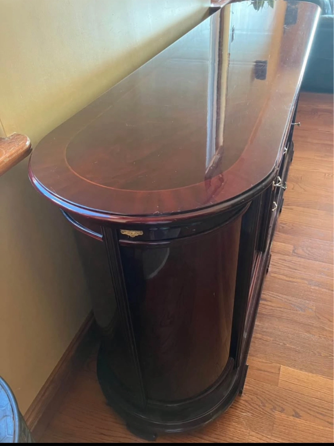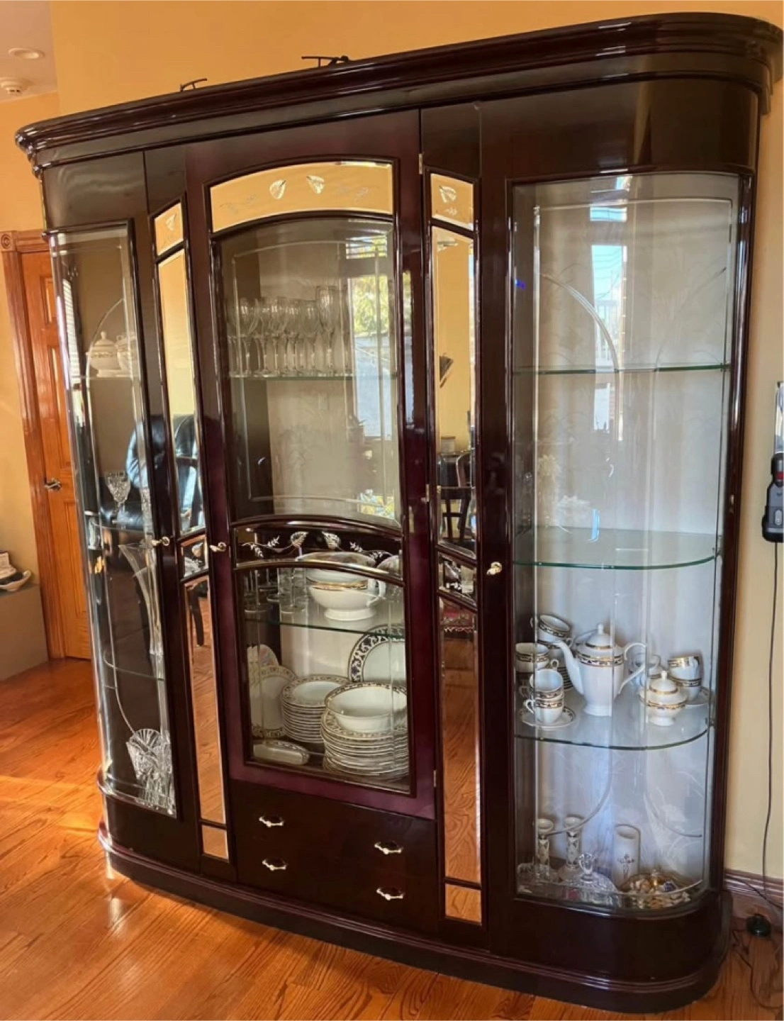 Beautiful Italian dark wood dining set. Includes a large buffet, six-chair dining table with glass top, and a curved china cabinet. Classic style. Some assembly required.
