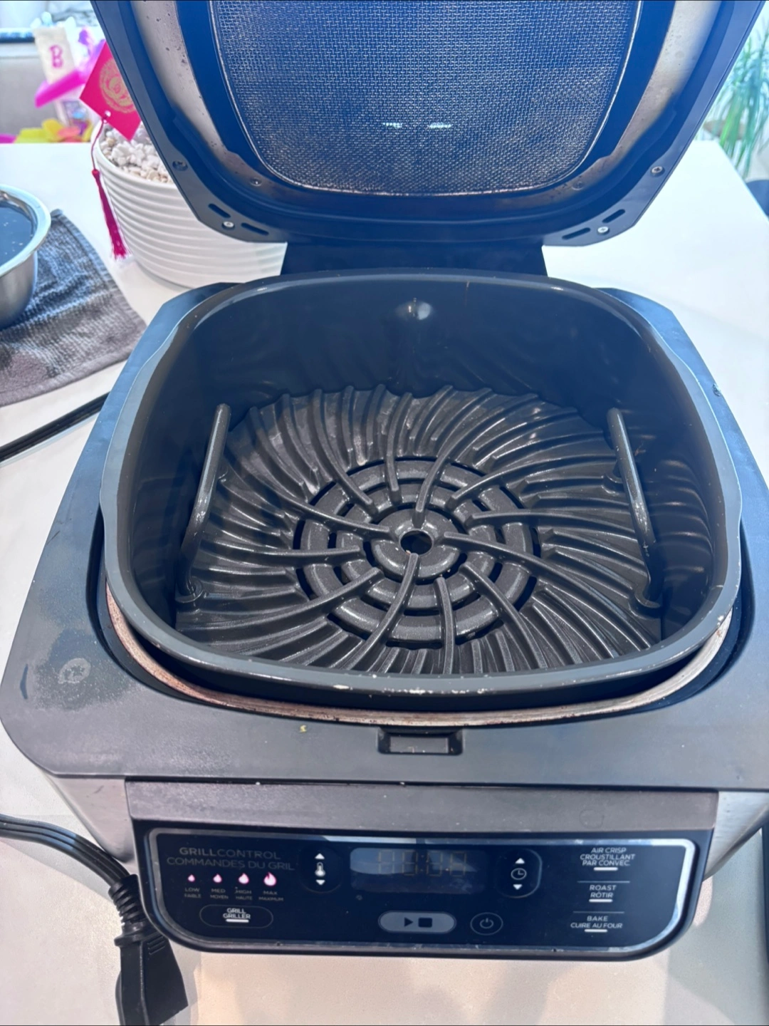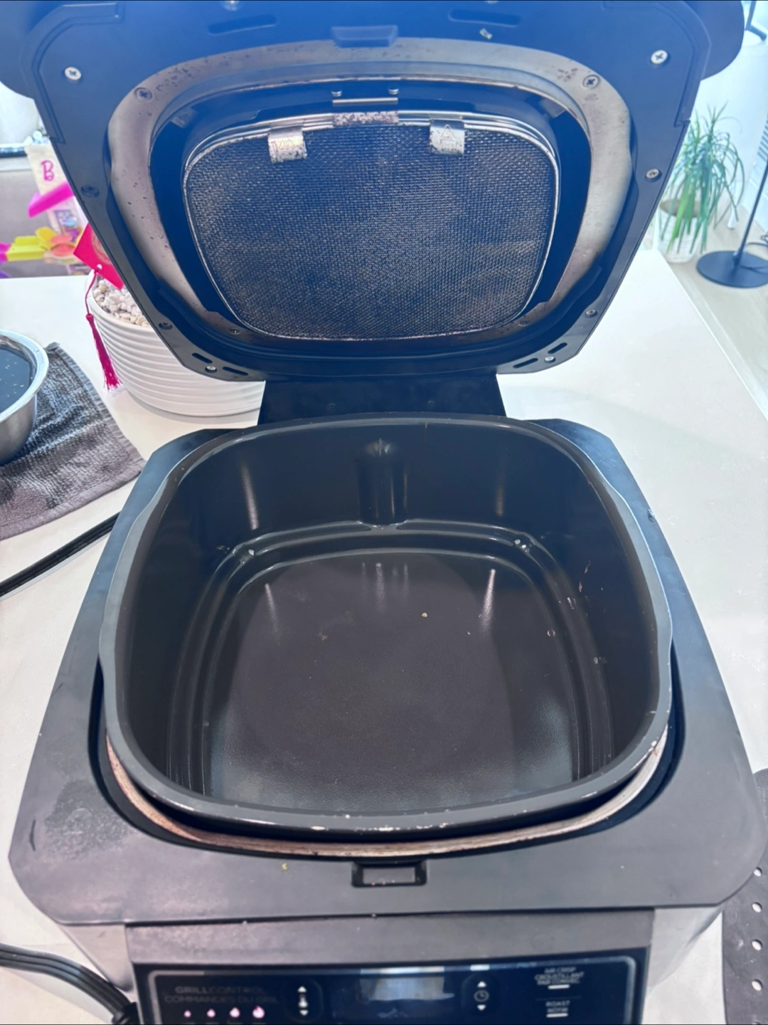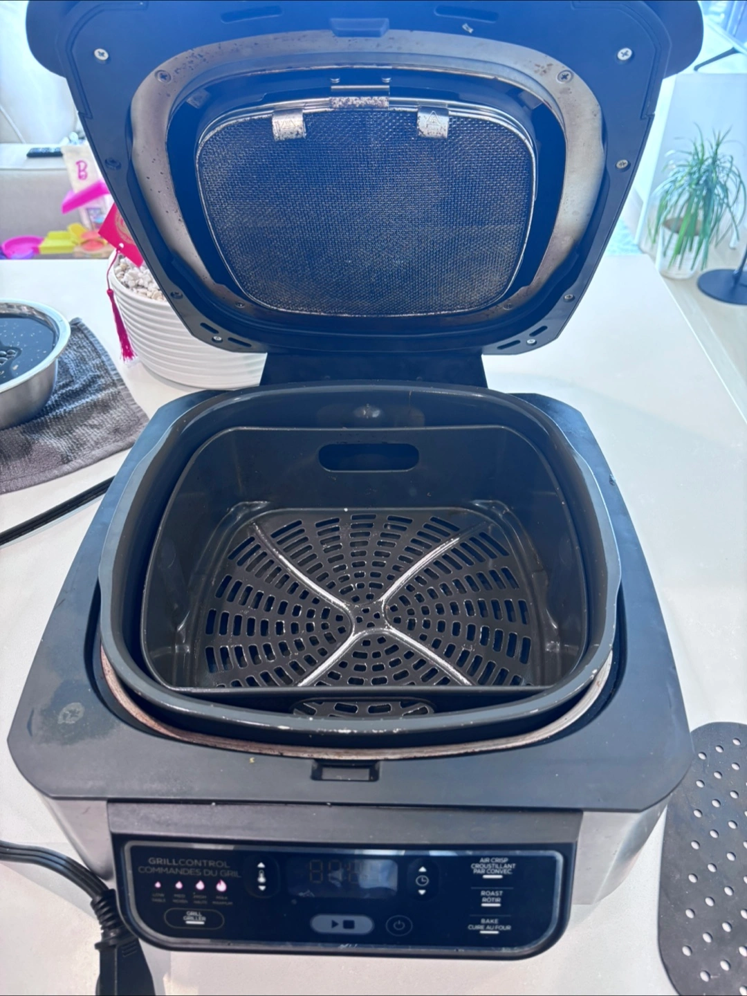 Used Ninja air crisp. Includes grill plate and crisper basket. Multiple functions: bake, roast, air crisp. Good condition.