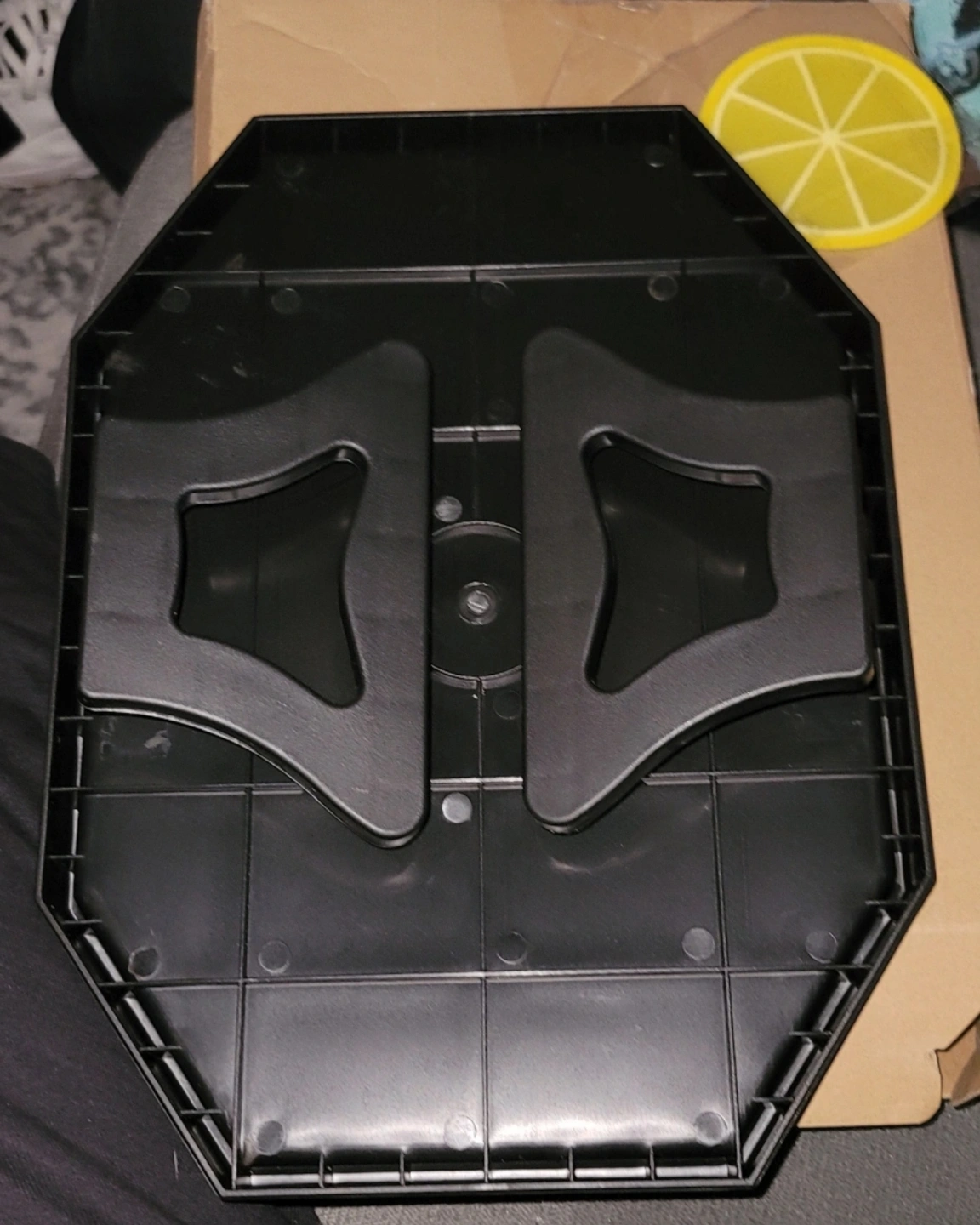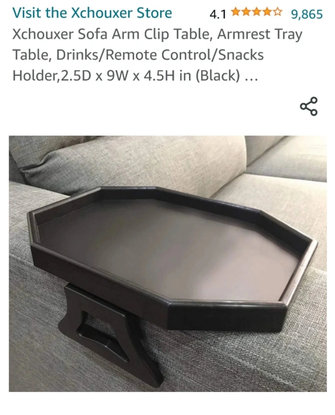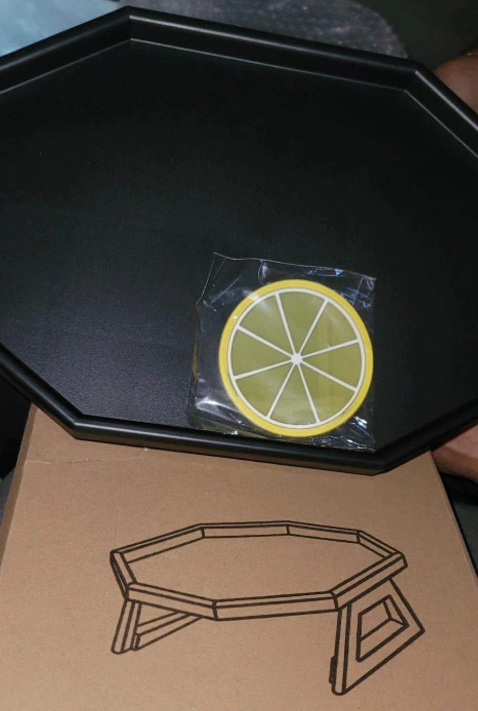 New Octagon-shaped tray. Clips onto sofa arm. Holds drinks, remotes, snacks. Includes lemon-shaped coaster. New, in box. Pickup in River Grove