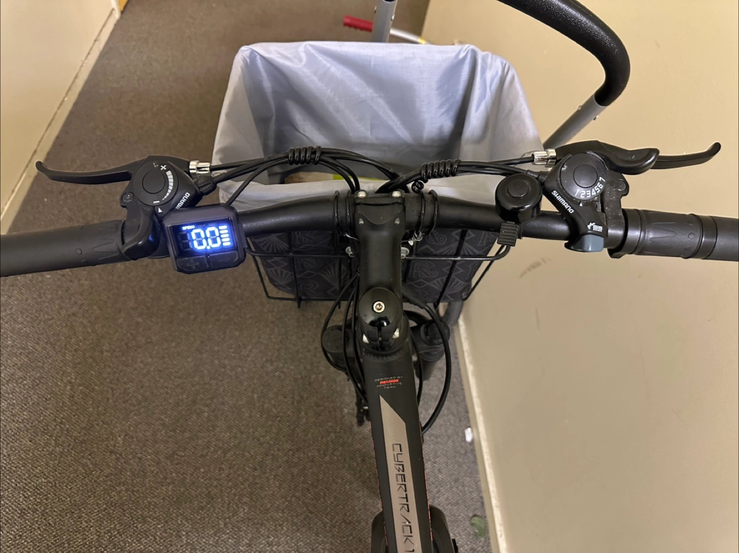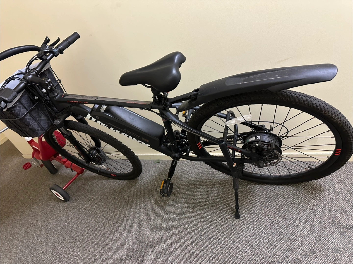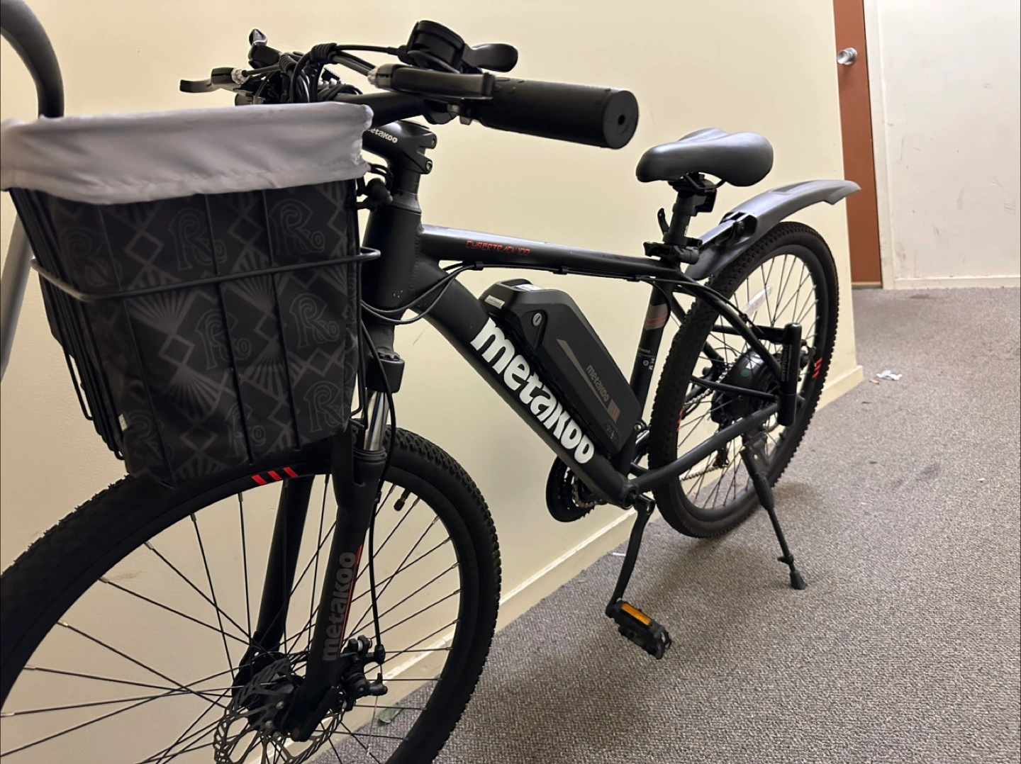 10Black electric bike. Includes front basket and fenders. Good condition.