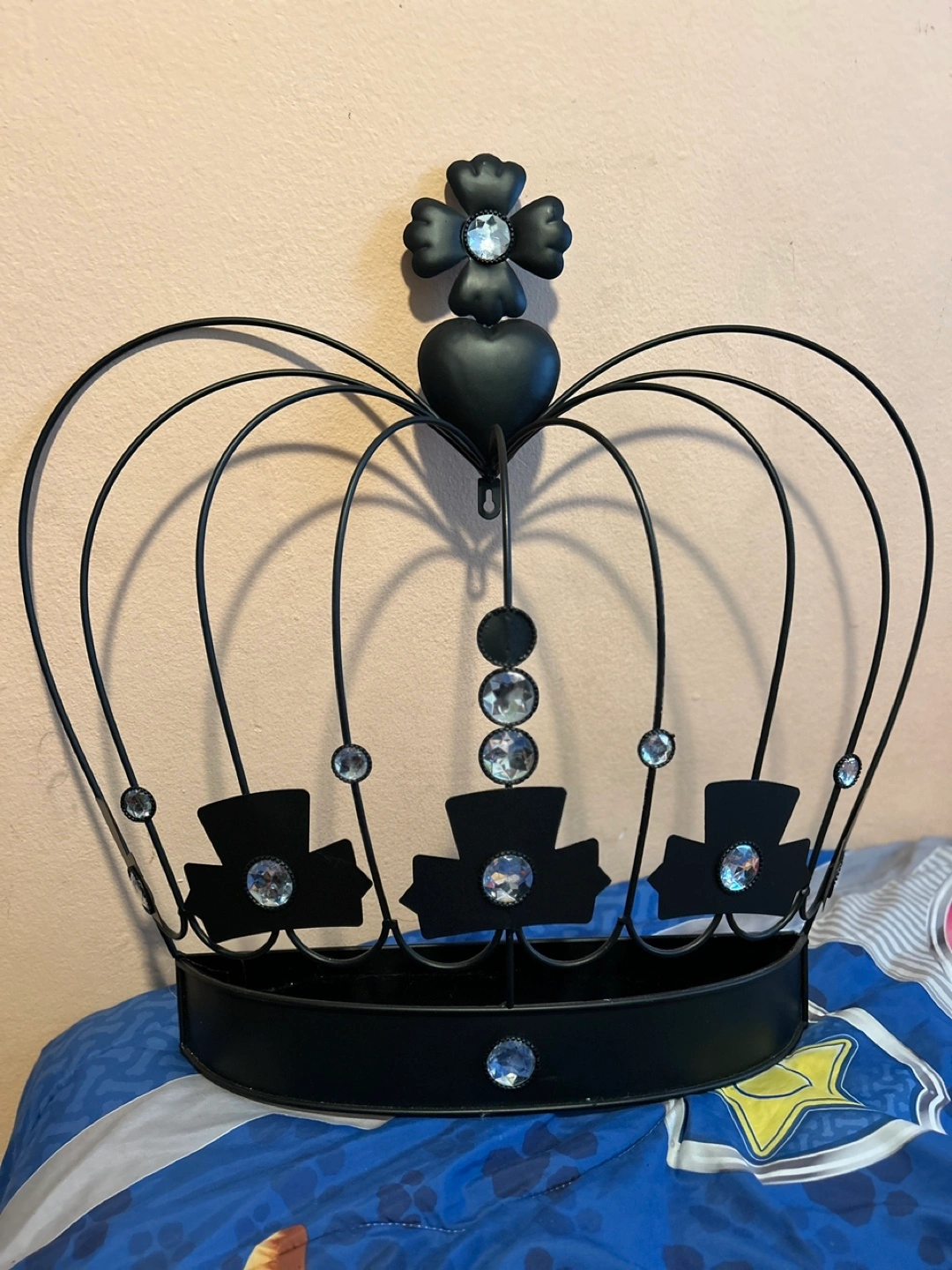 Black metal crown wall decor. Features rhinestones and a unique design. Perfect for adding a touch of regal style to any room.