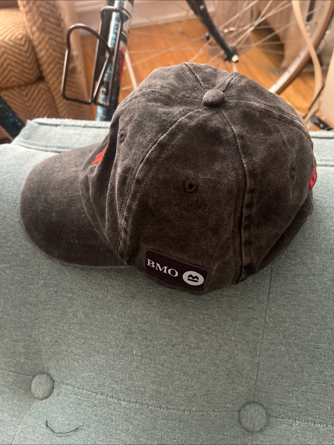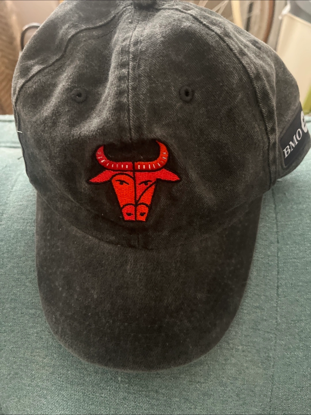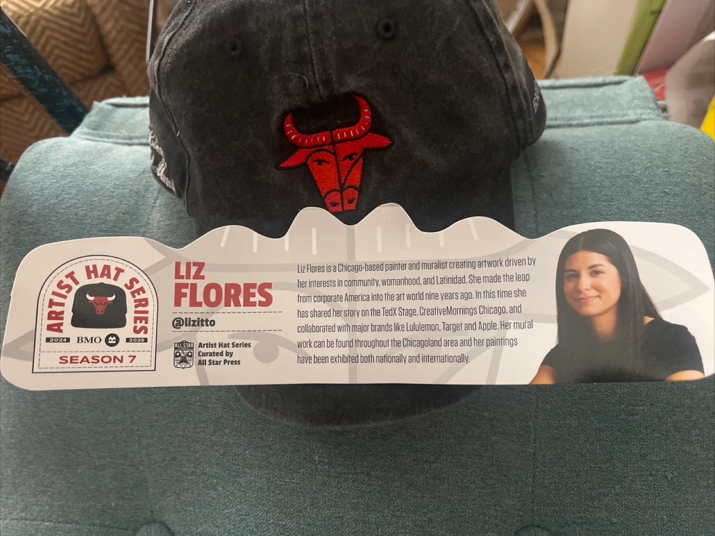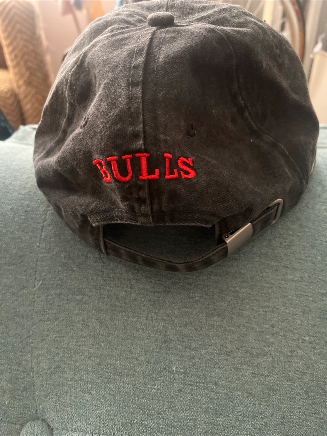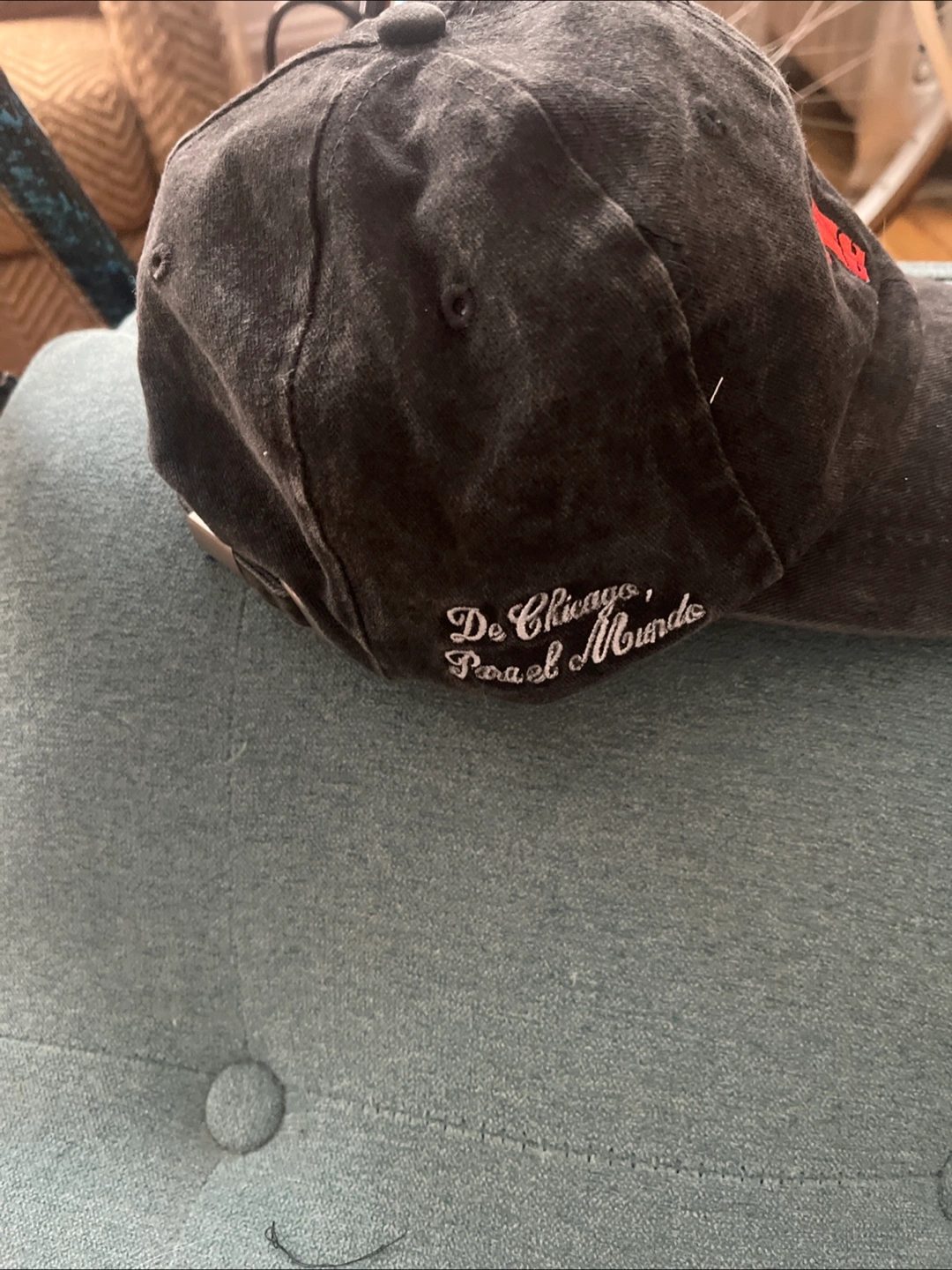 Black baseball cap. Features embroidered red Chicago Bulls logo. BMO logo patch. 'Bulls' embroidered on back. 'De Chicago, Pearl Mundo' embroidered on brim. Artist Series tag included.