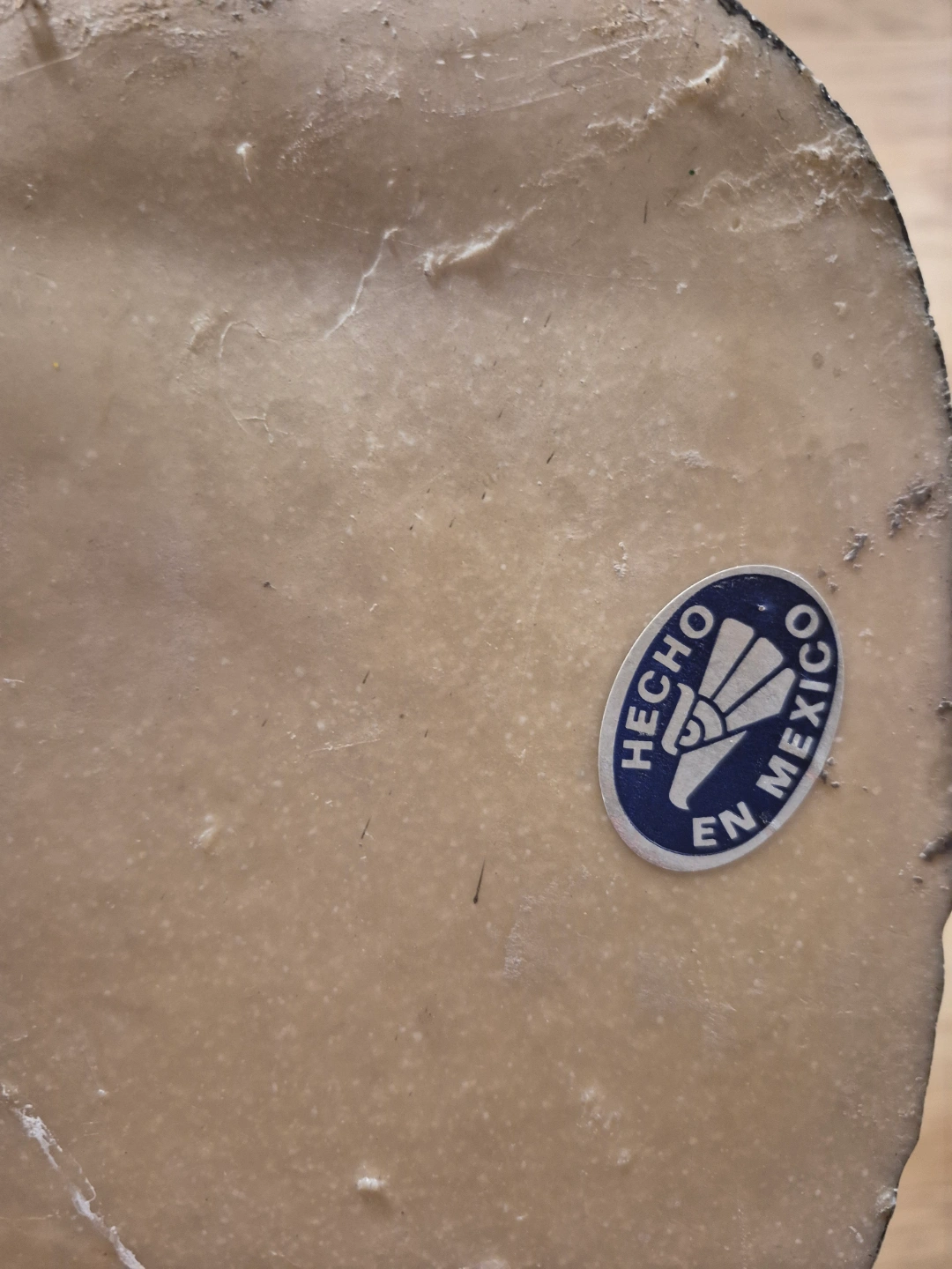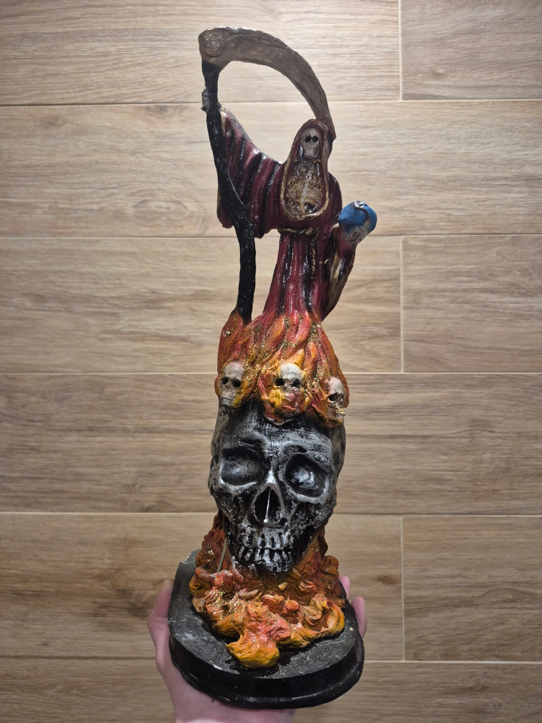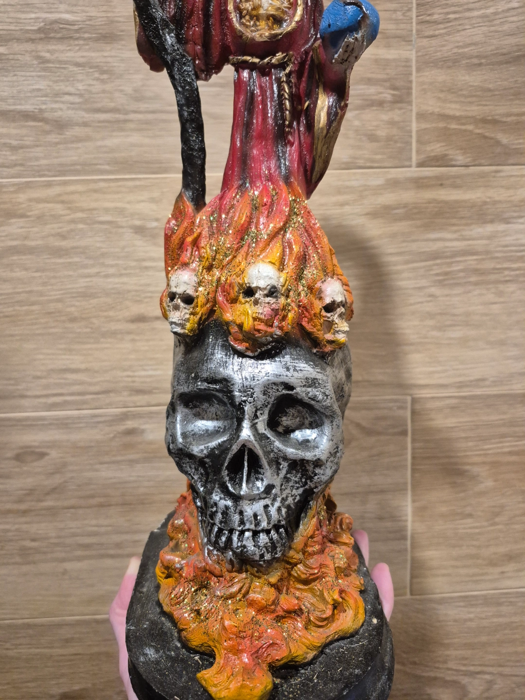 Intriguing figurine. Features Santa Muerte or the grim reaper standing atop a skull engulfed in flames. Detailed craftsmanship. Made in Mexico.