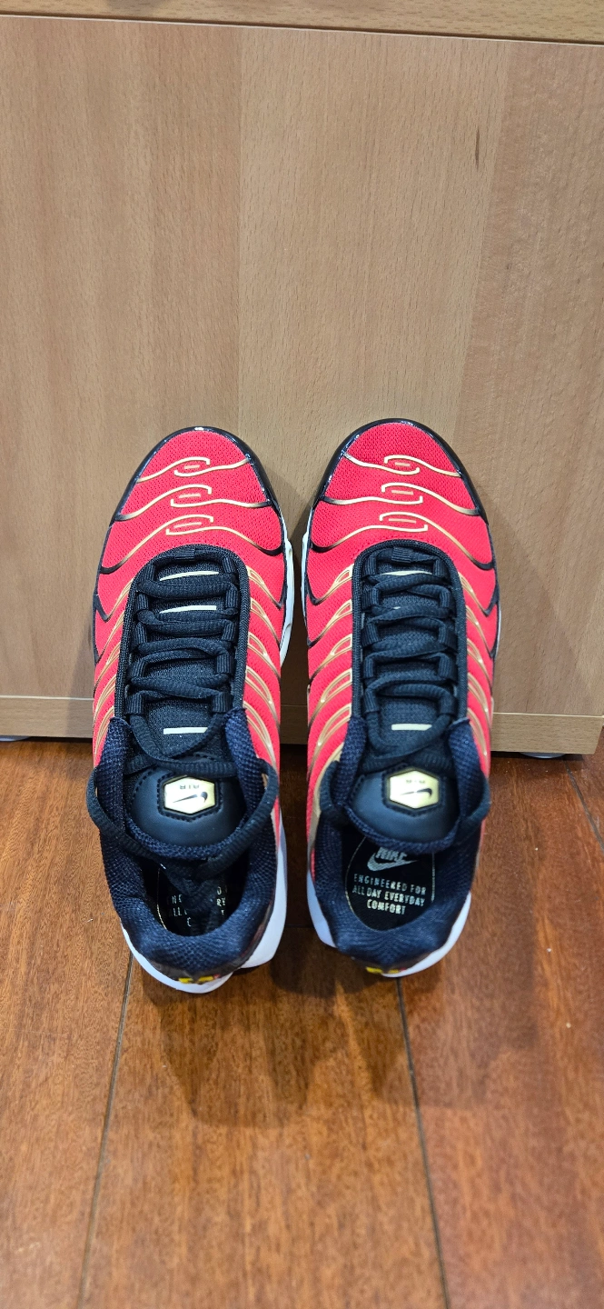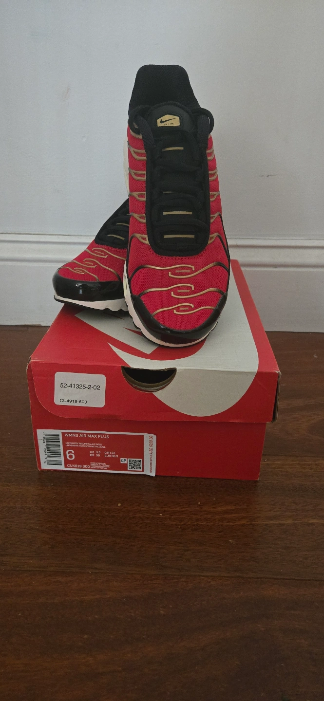 Nike Air Max Plus shoes. Size 6. Red, black, and gold color scheme. New in box.