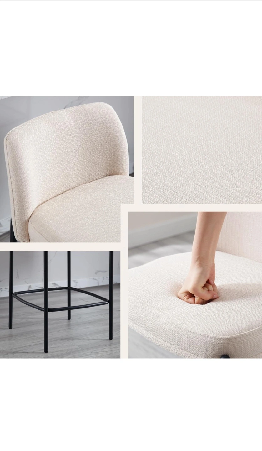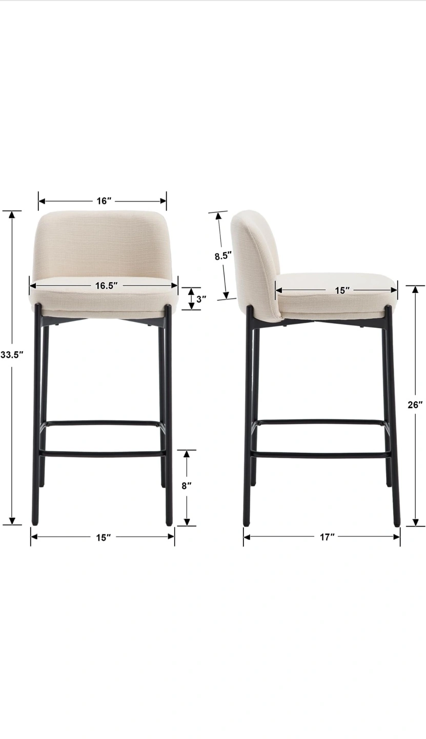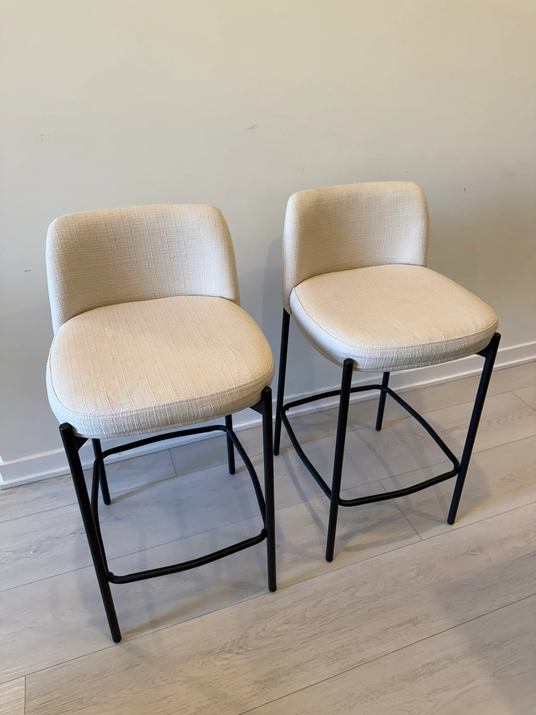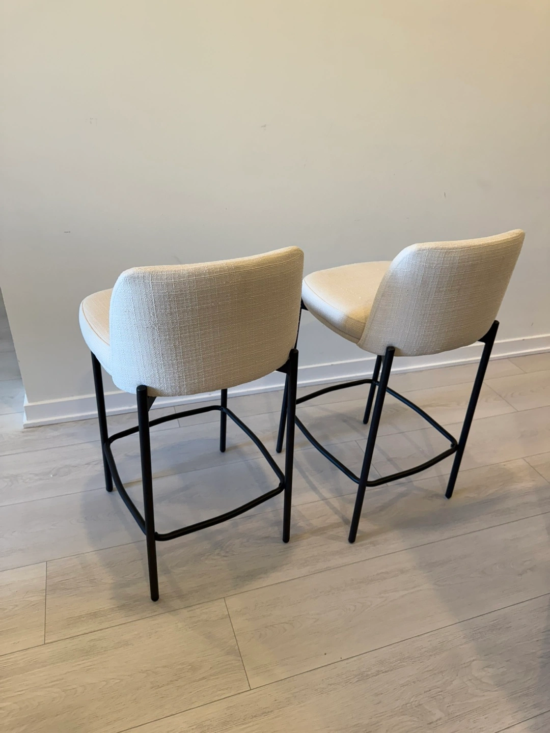 Set of two stylish counter stools. Cream-colored fabric seats. Black metal legs and frame. Simple, modern design. Comfortable and sturdy. Normally new $225 selling for $175.