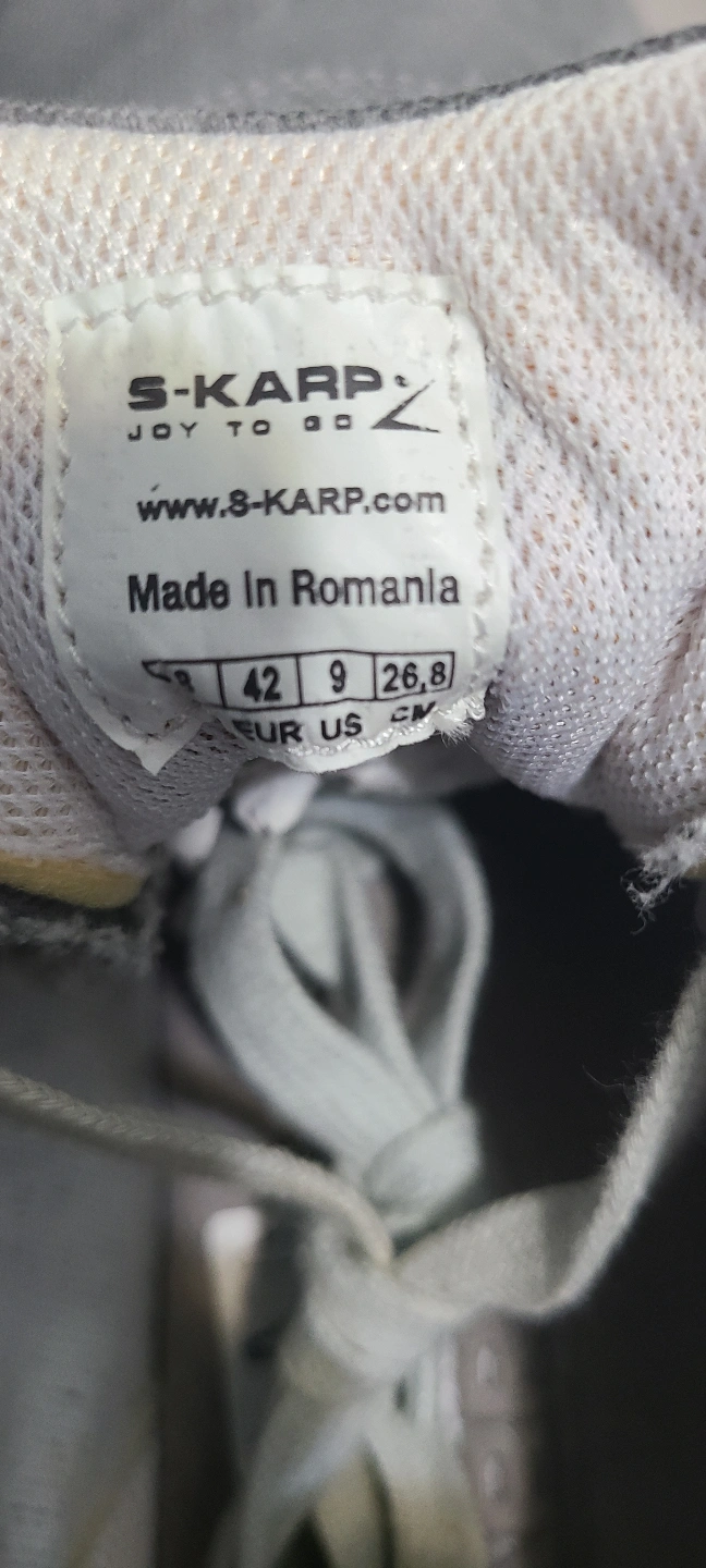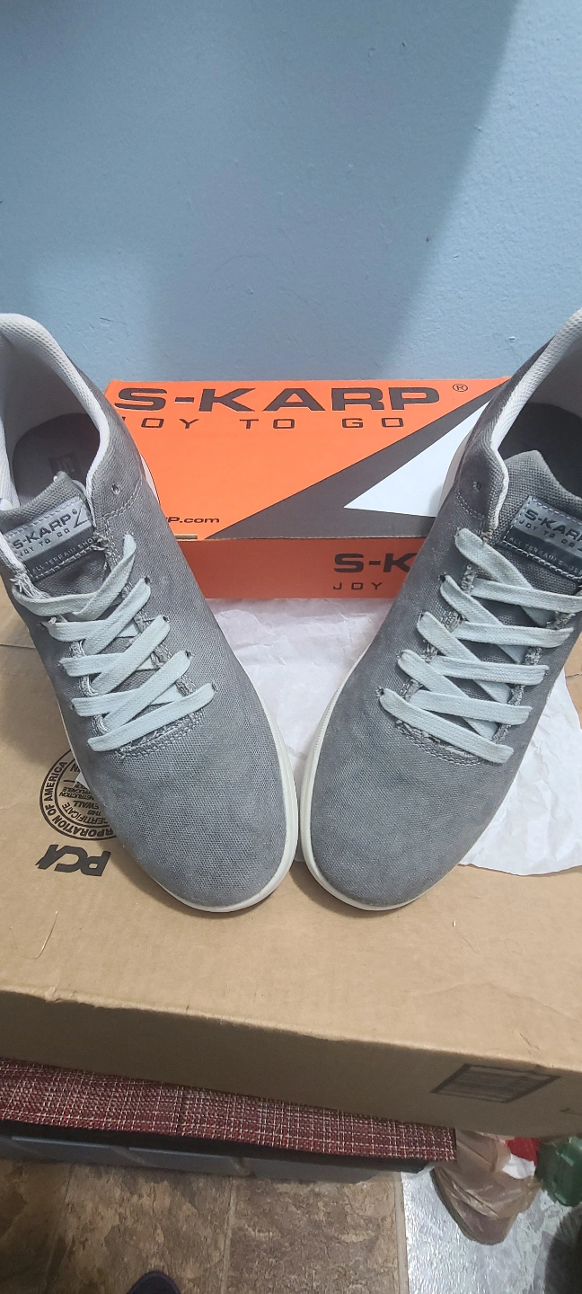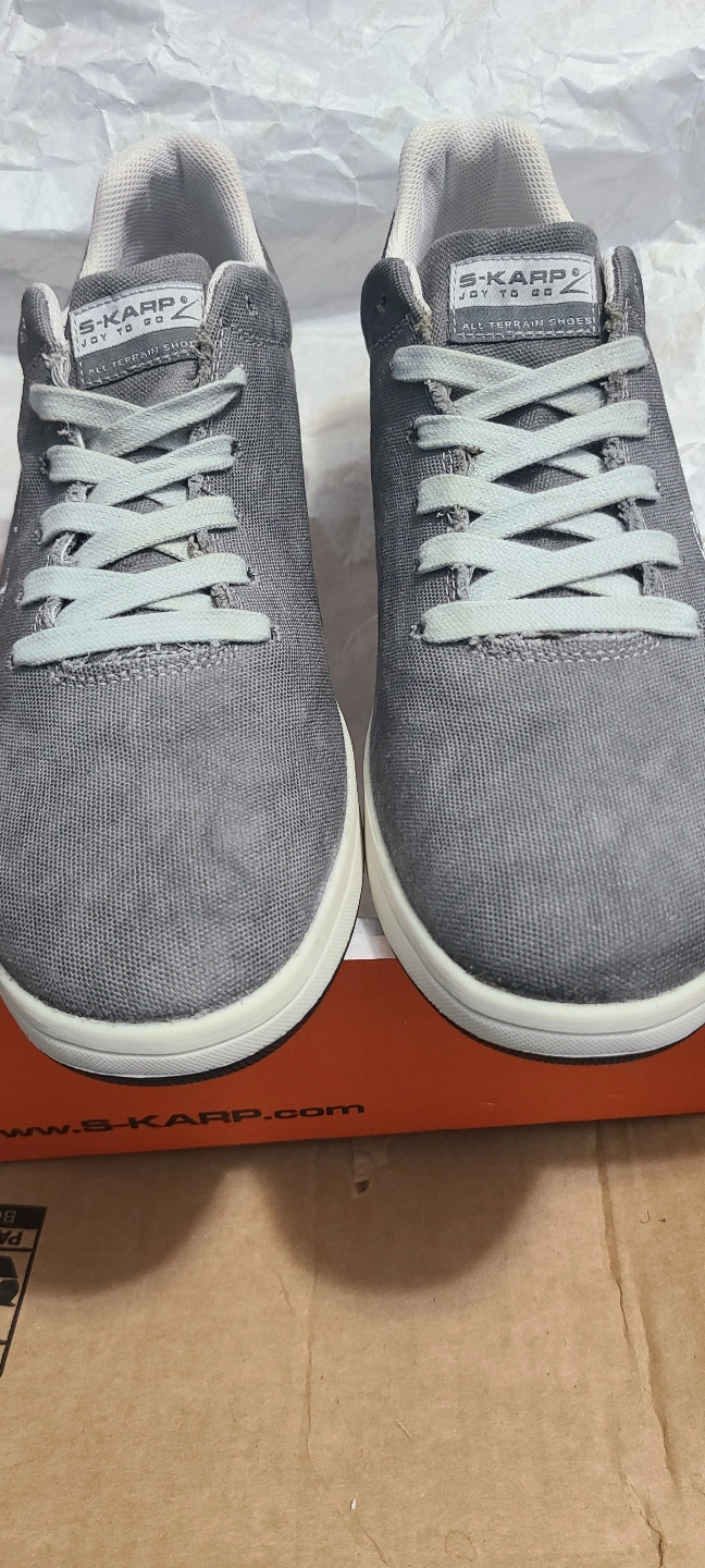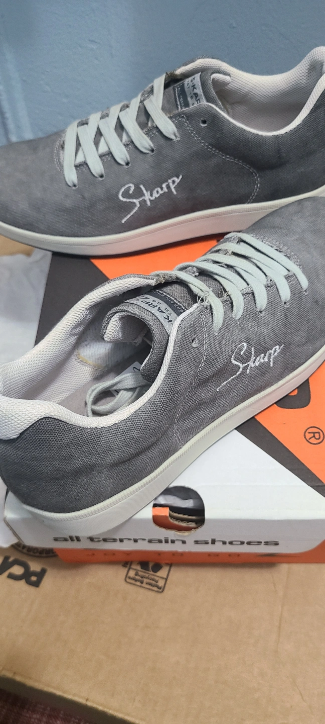 Gray canvas casual shoes. 'Sharp' embroidered on side. White soles. Comes in original box. Can be unisex in original wrapping, box and bag. All terrain shoes. No offers below $50.