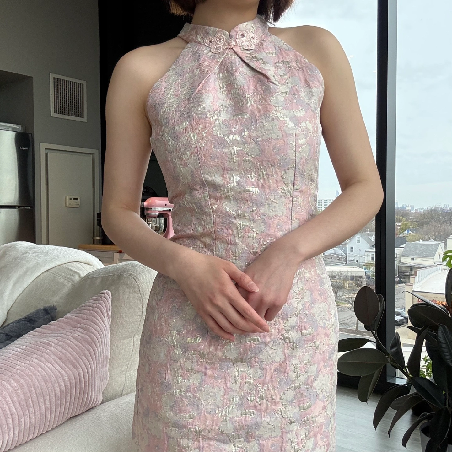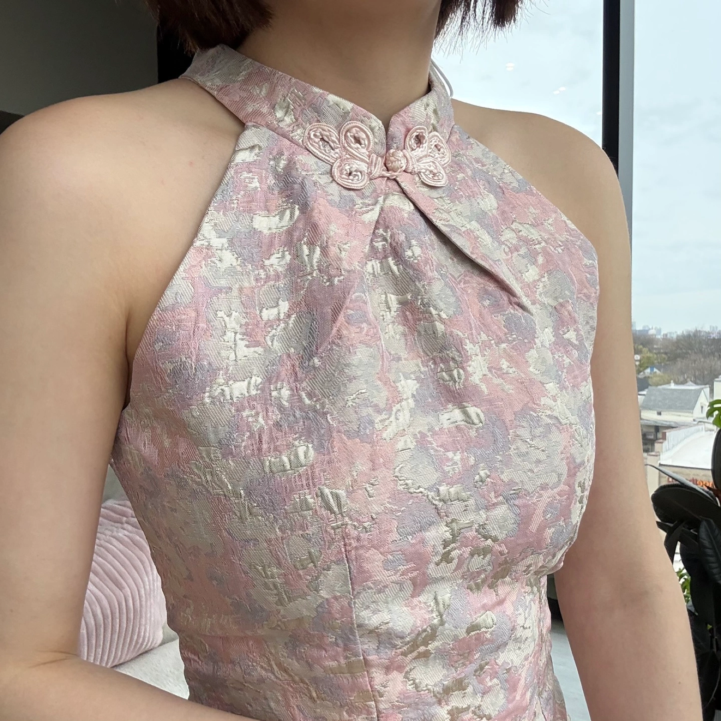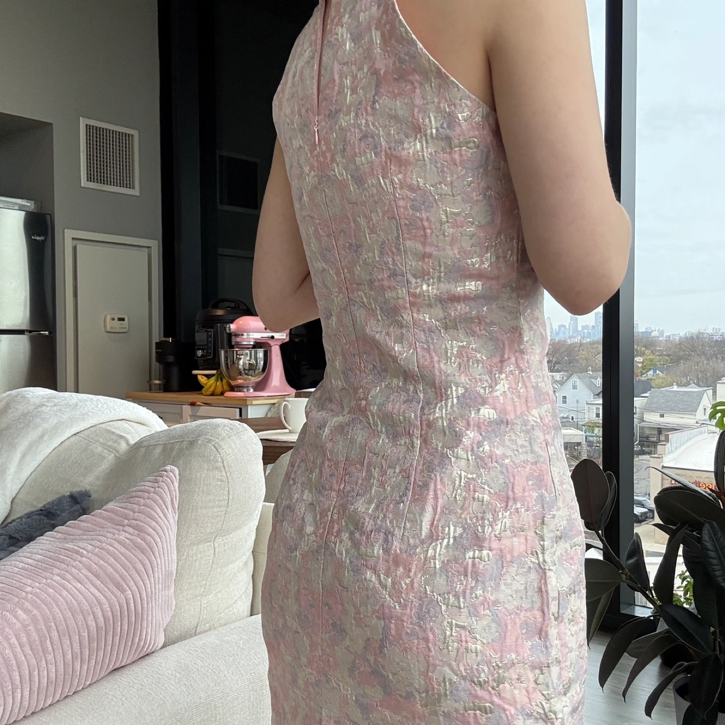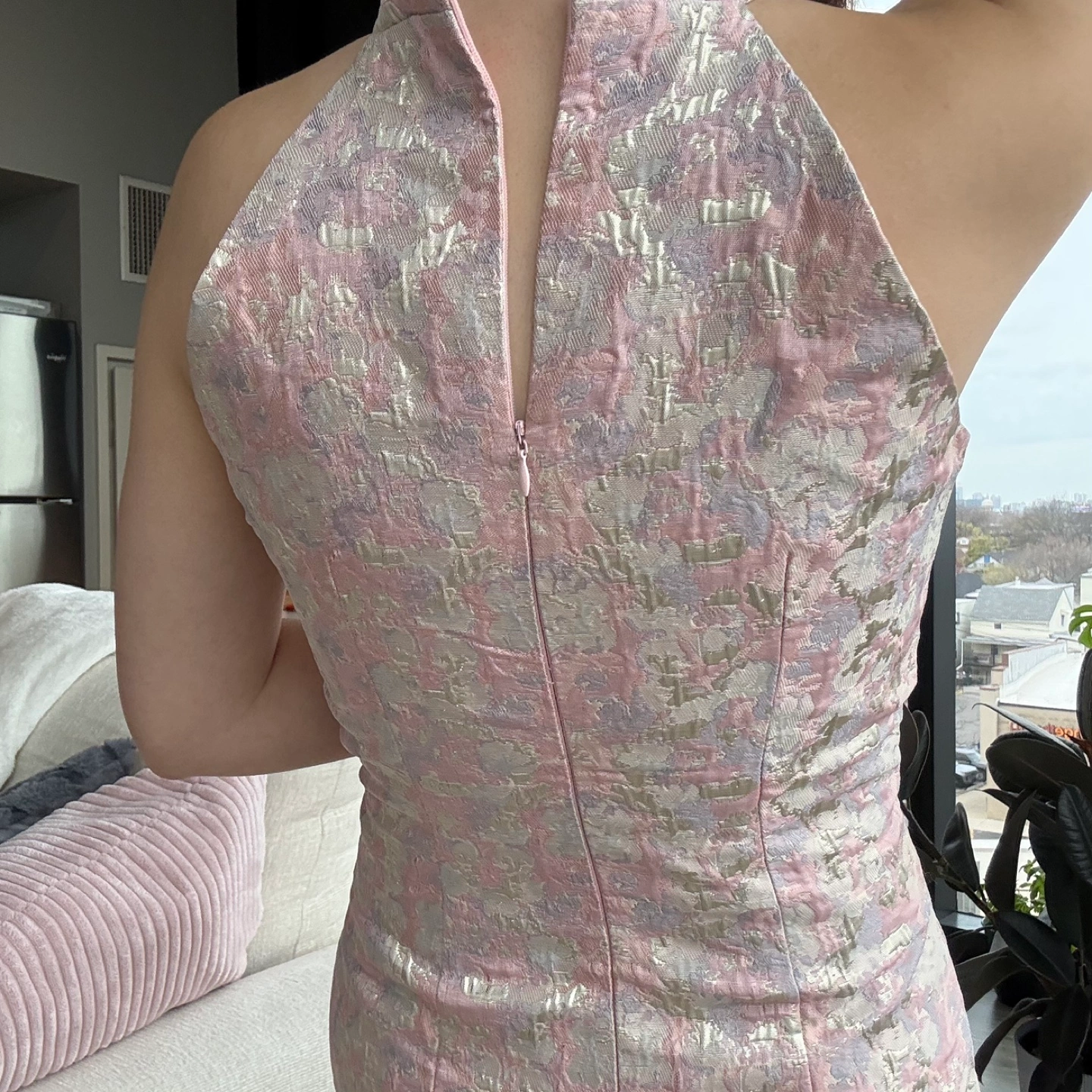 Stunning sleeveless midi dress. Features a halter neck, mandarin collar, and beautiful brocade fabric. Pink, silver, and white color scheme. Back zipper closure. Feather trim at the hem. Perfect for special occasions.
