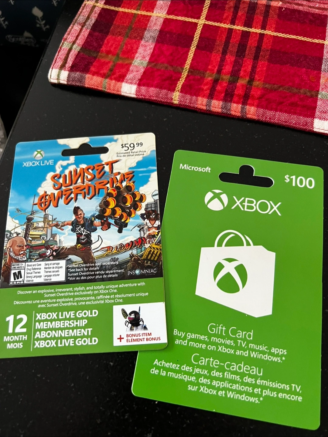 Two Xbox gift cards. One is a $100 general gift card. The other is a $59.99 card with a code for Sunset Overdrive. 12 months Xbox Live Gold membership included.