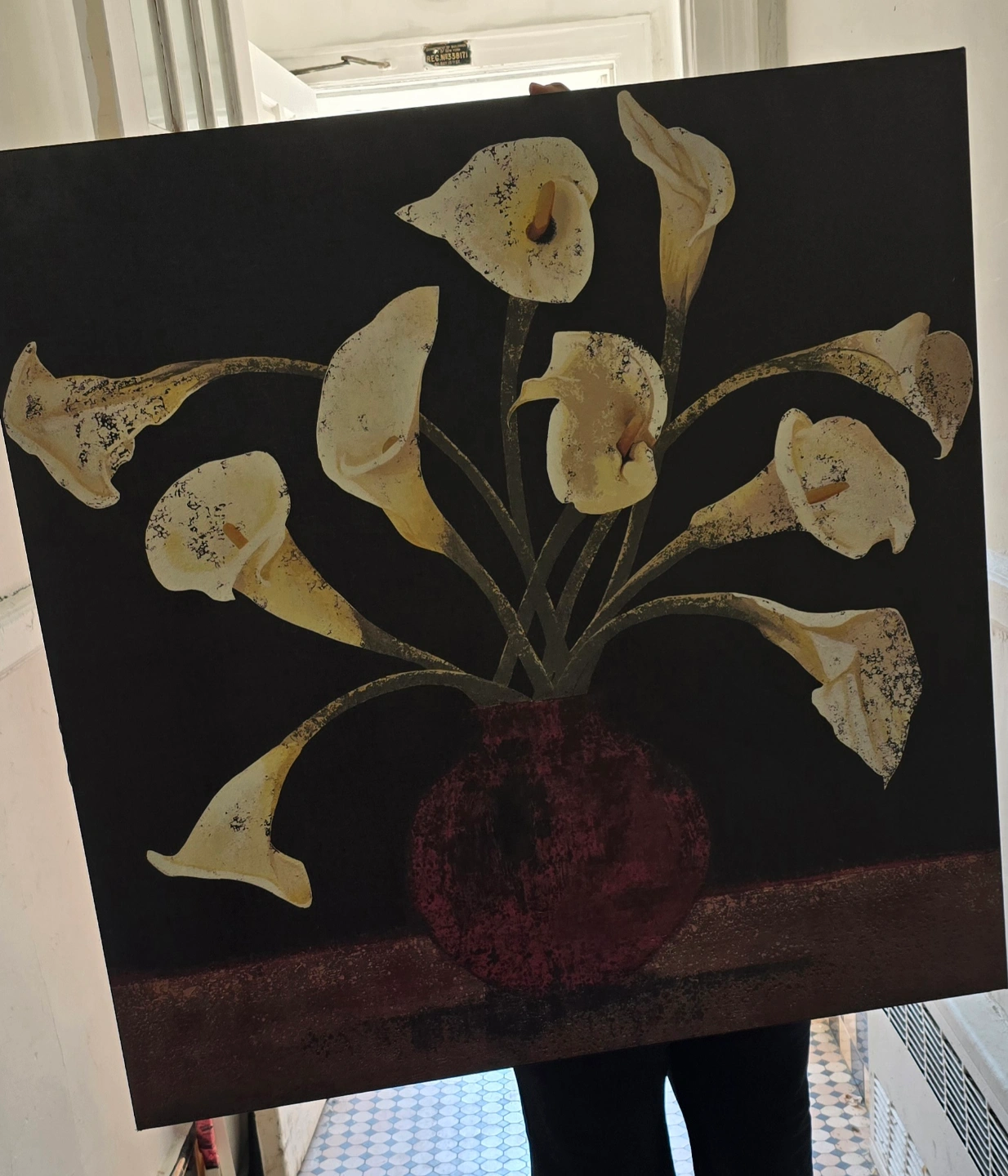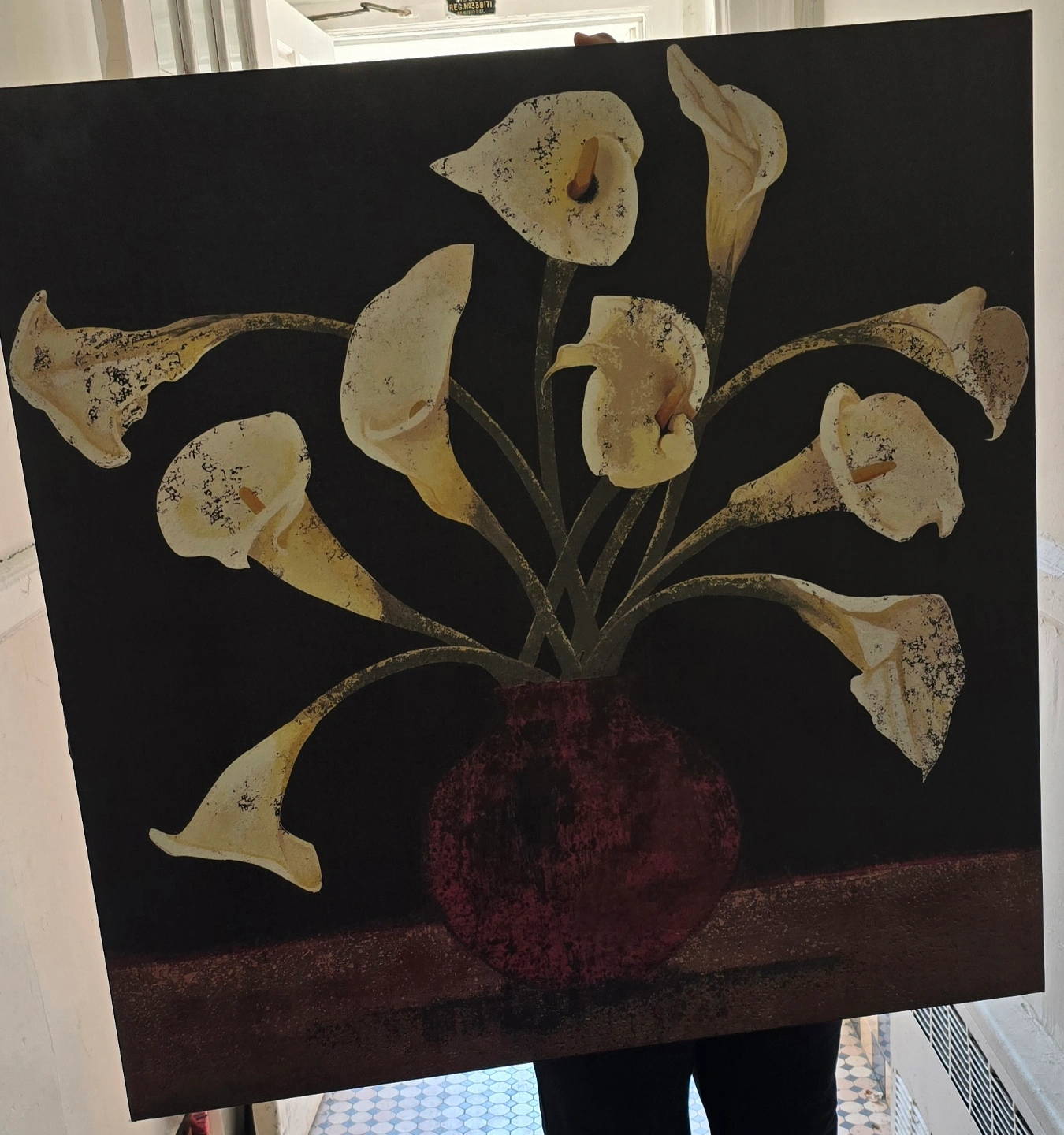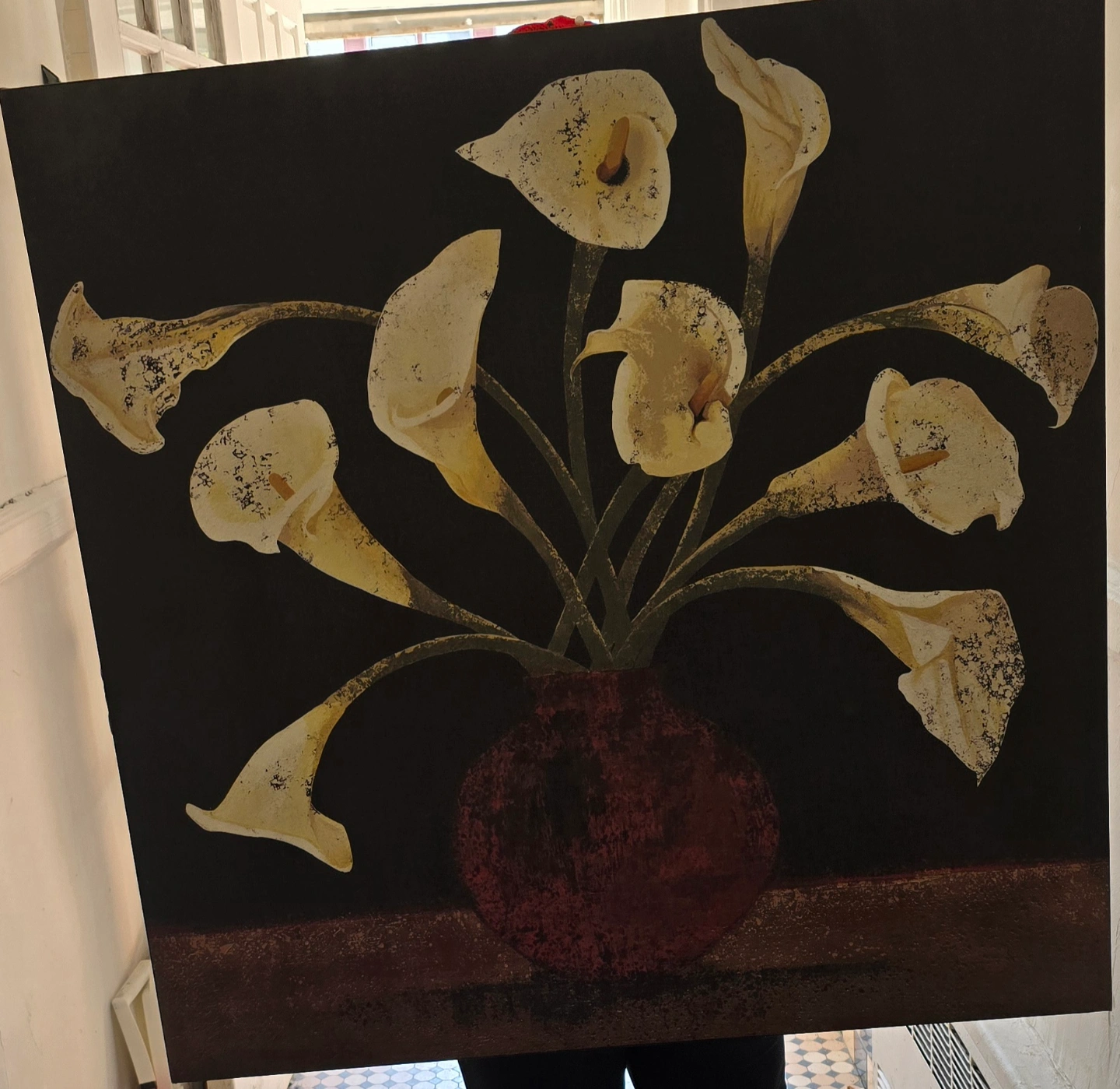 10Large Painting Features a bouquet of white calla lilies in a dark red vase. Dark background. Great for home decor.