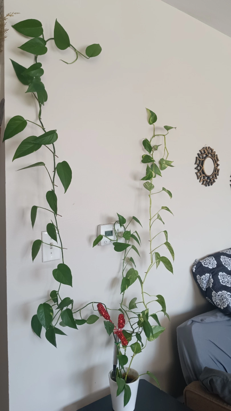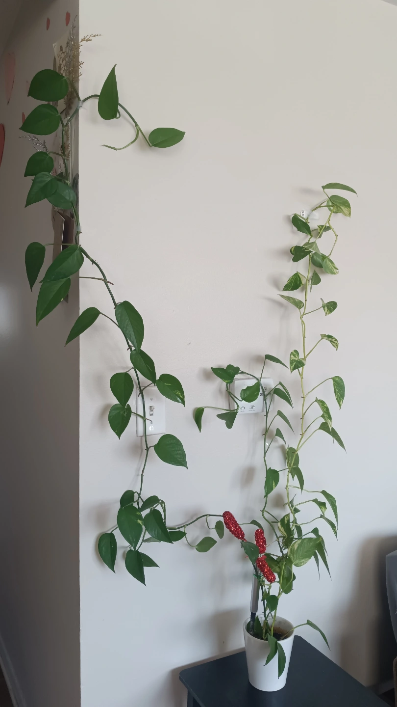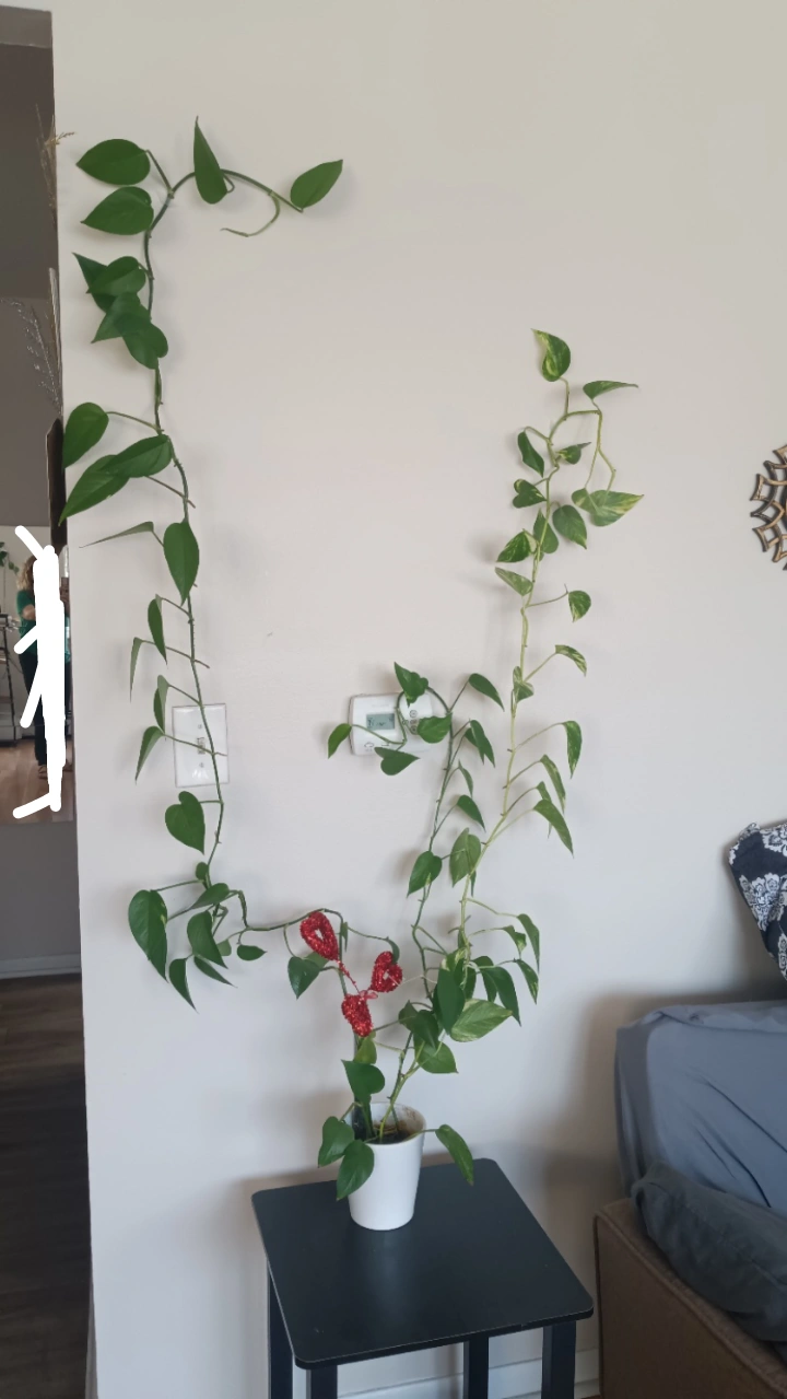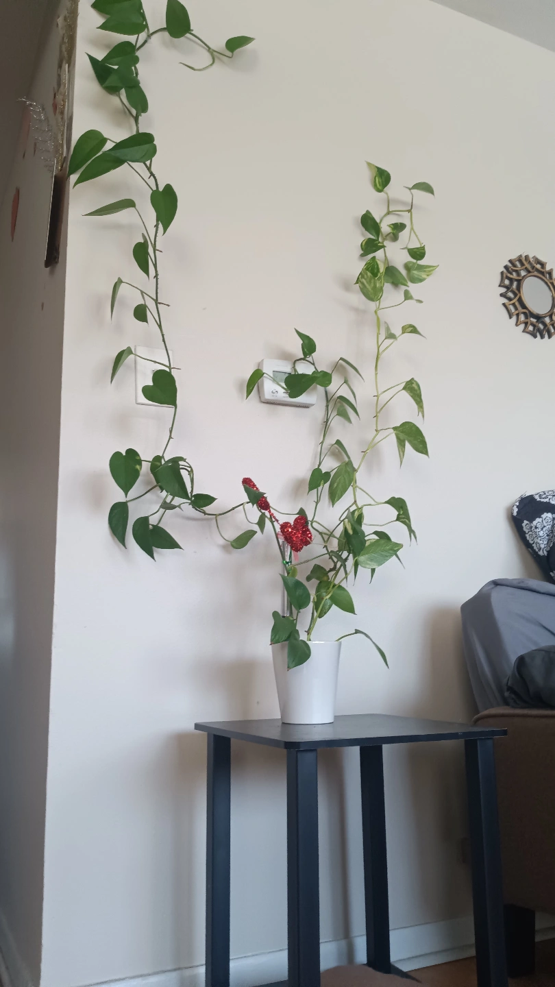 Healthy, established Golden Pothos. Three vines, two with solid green leaves, the other variegated. Planted in a white pot. Great for home decor.