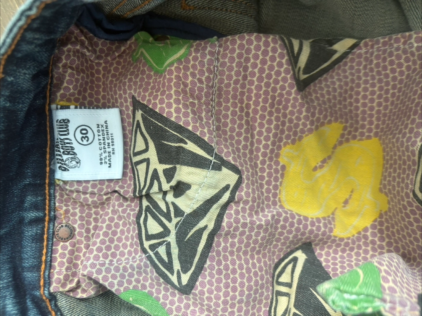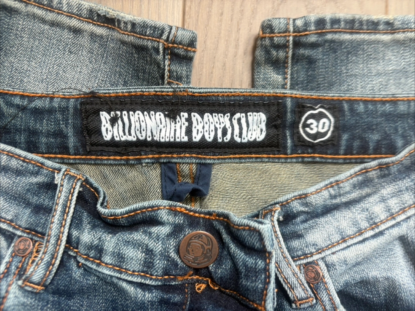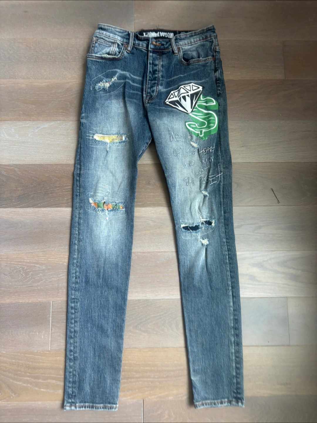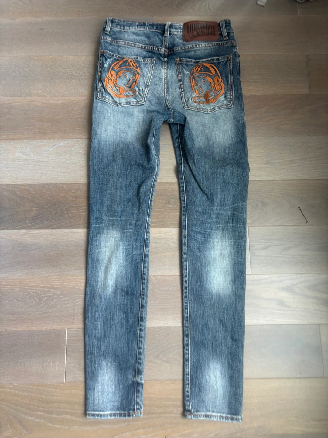 23Men's Billionaire Boys Club jeans. Size 30. Distressed denim with embroidered astronaut patches. Features a printed inner waistband. Skinny fit. Slight wear, like new.