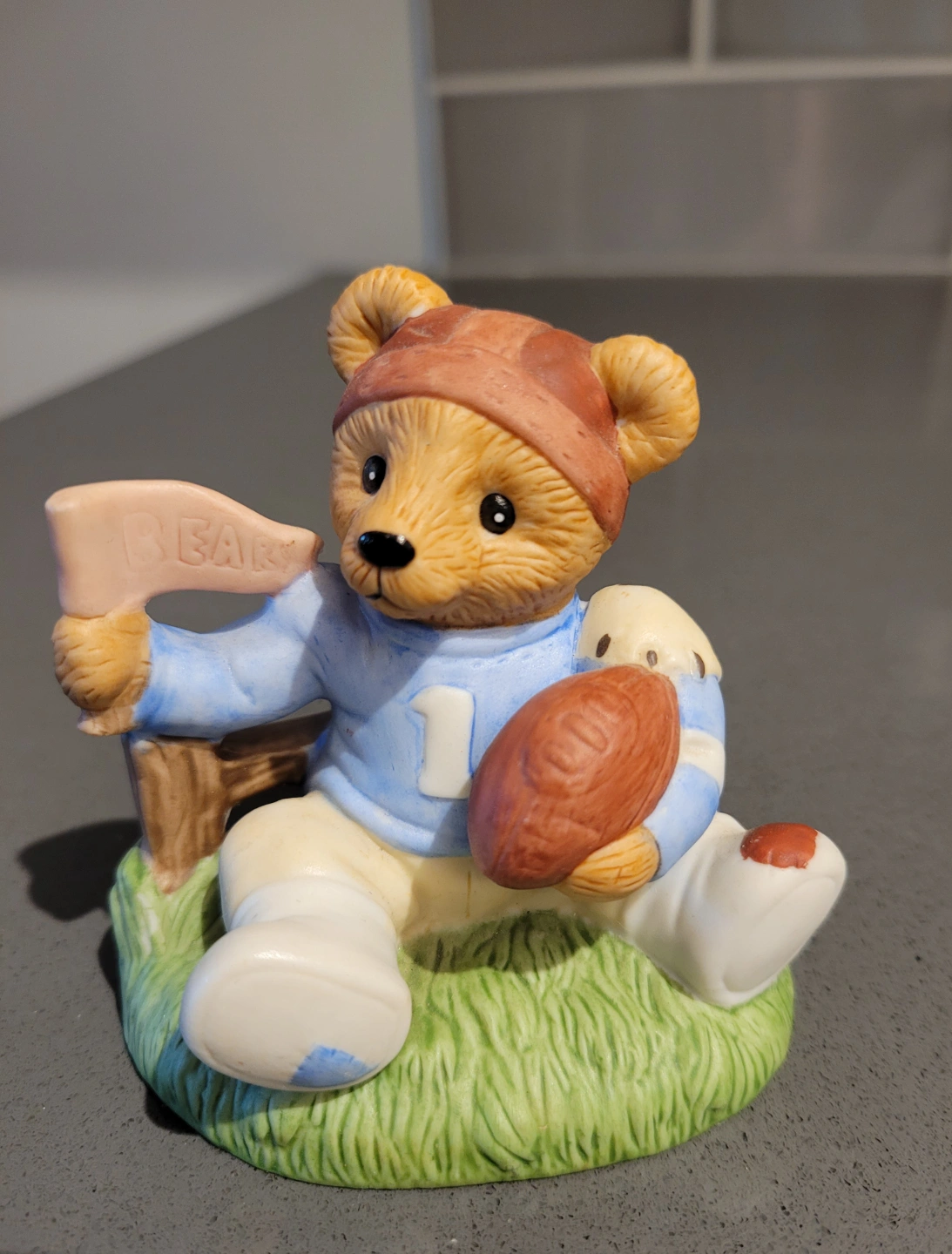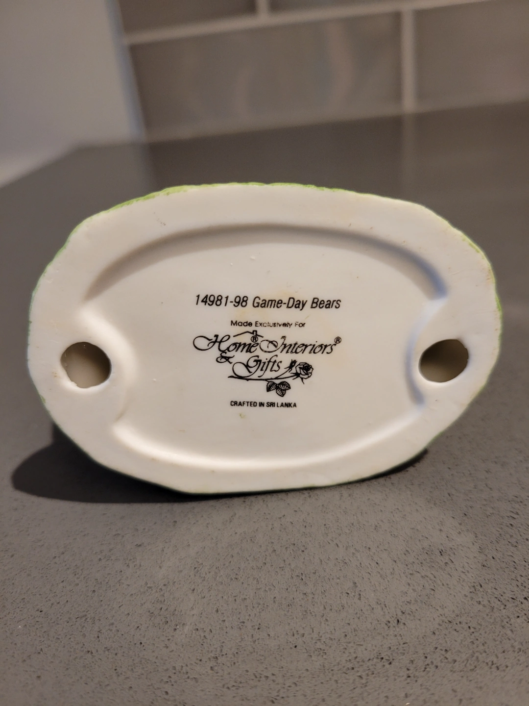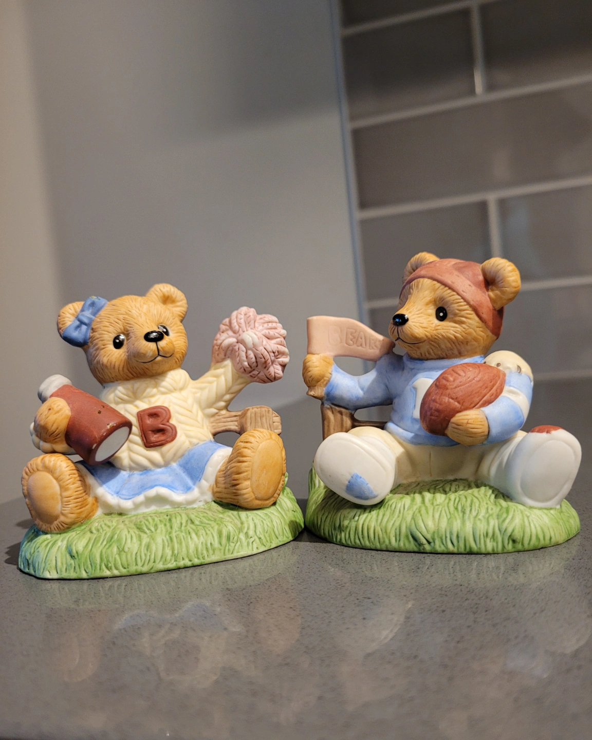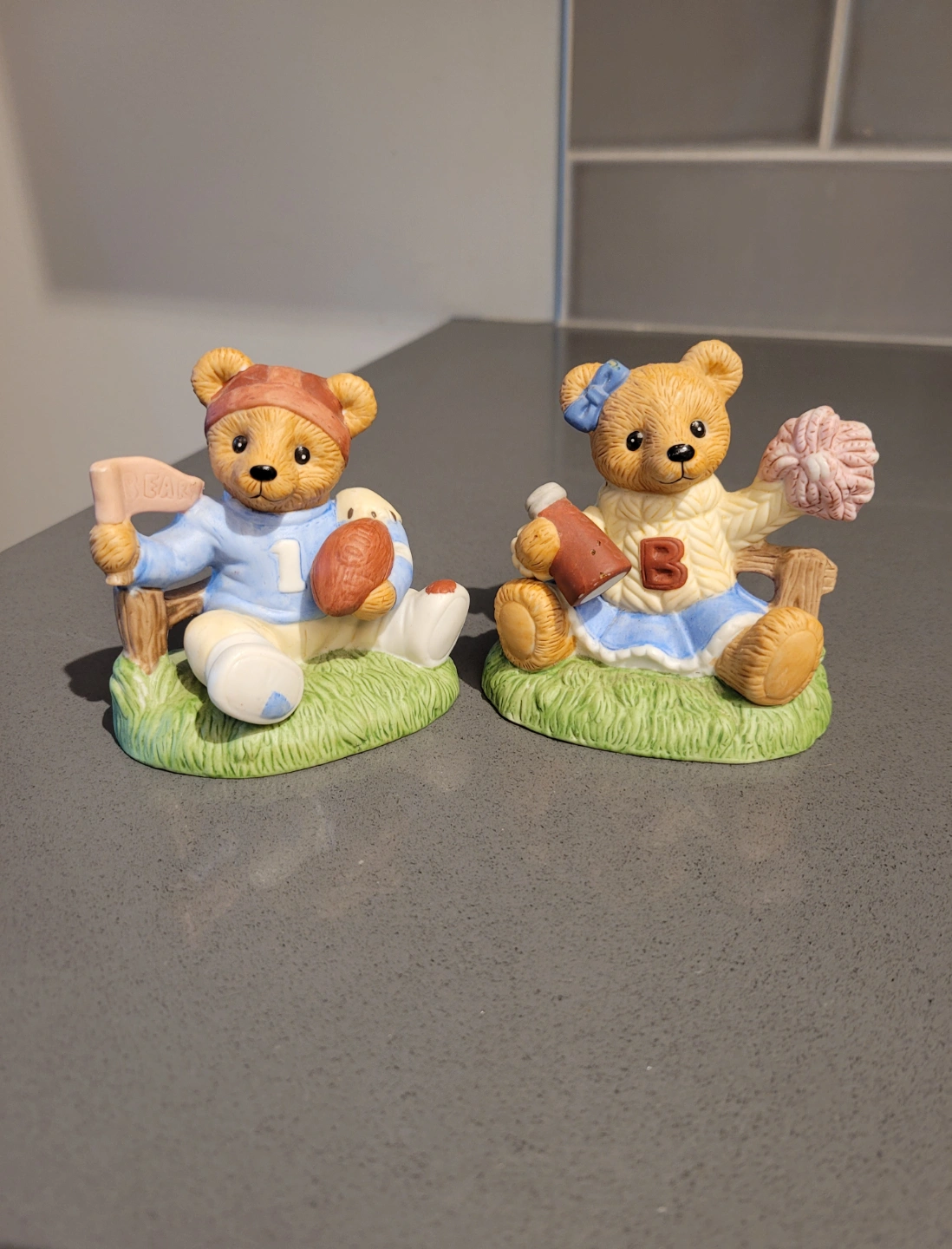 Set of two adorable ceramic bear figurines. One bear wears a football uniform and holds a football. The other bear wears a cheerleader outfit and holds pom-poms. Both bears are sitting on a small bench. Collectible, charming, and perfect for a sports fan. Approximately 3 inches high by 3 inches long. Feel free to check out my other unique items.