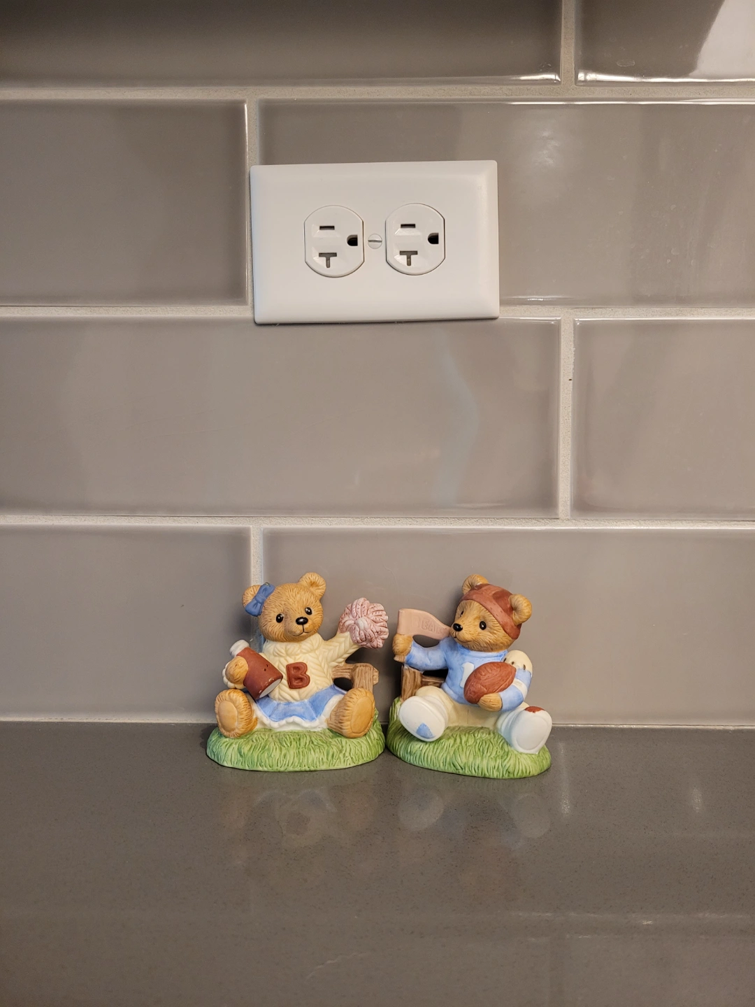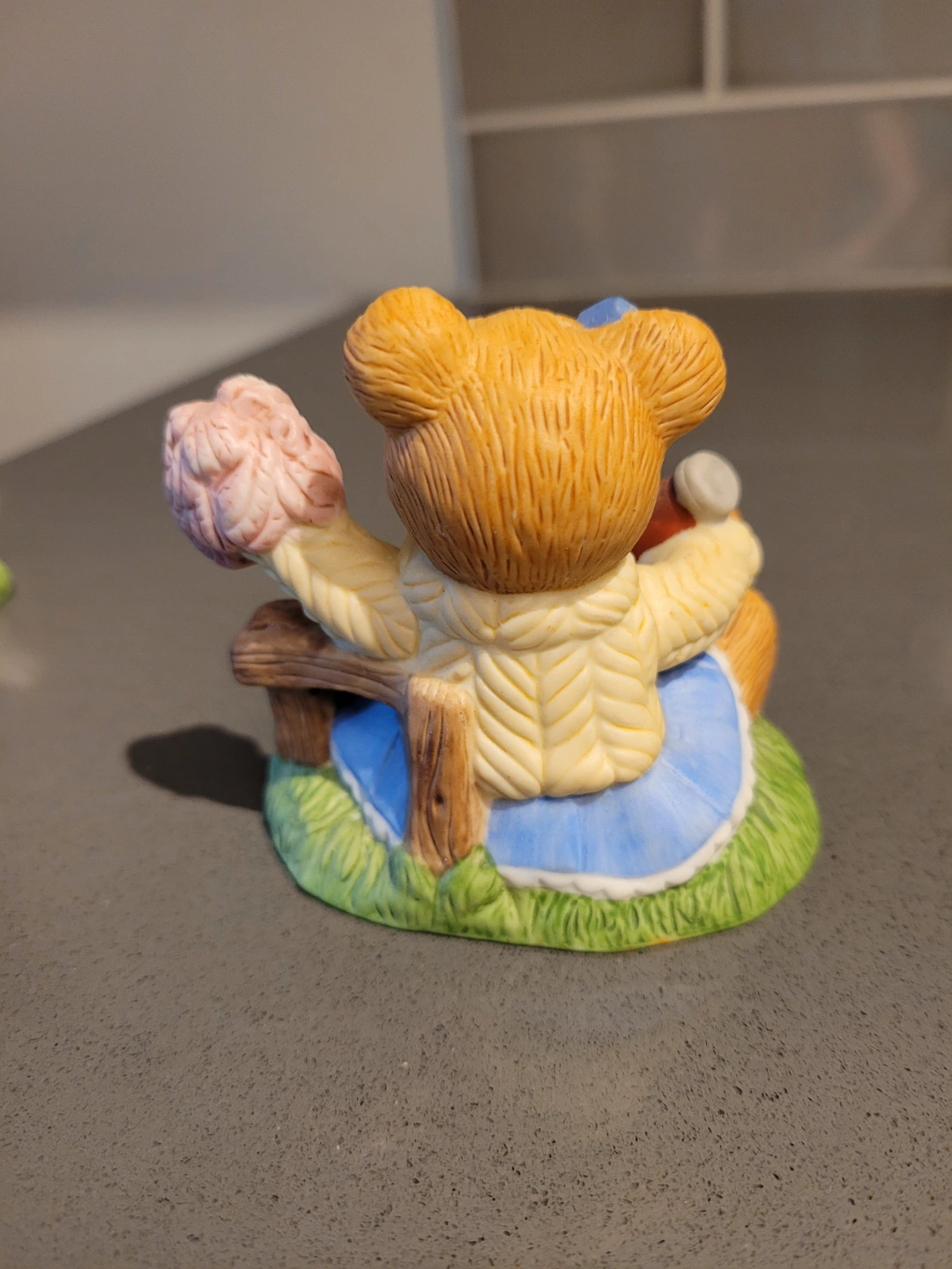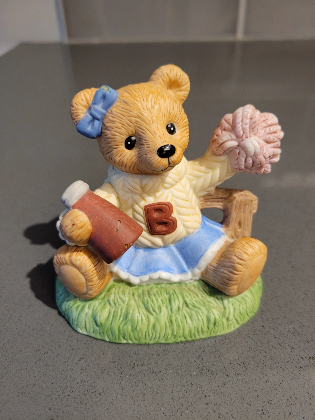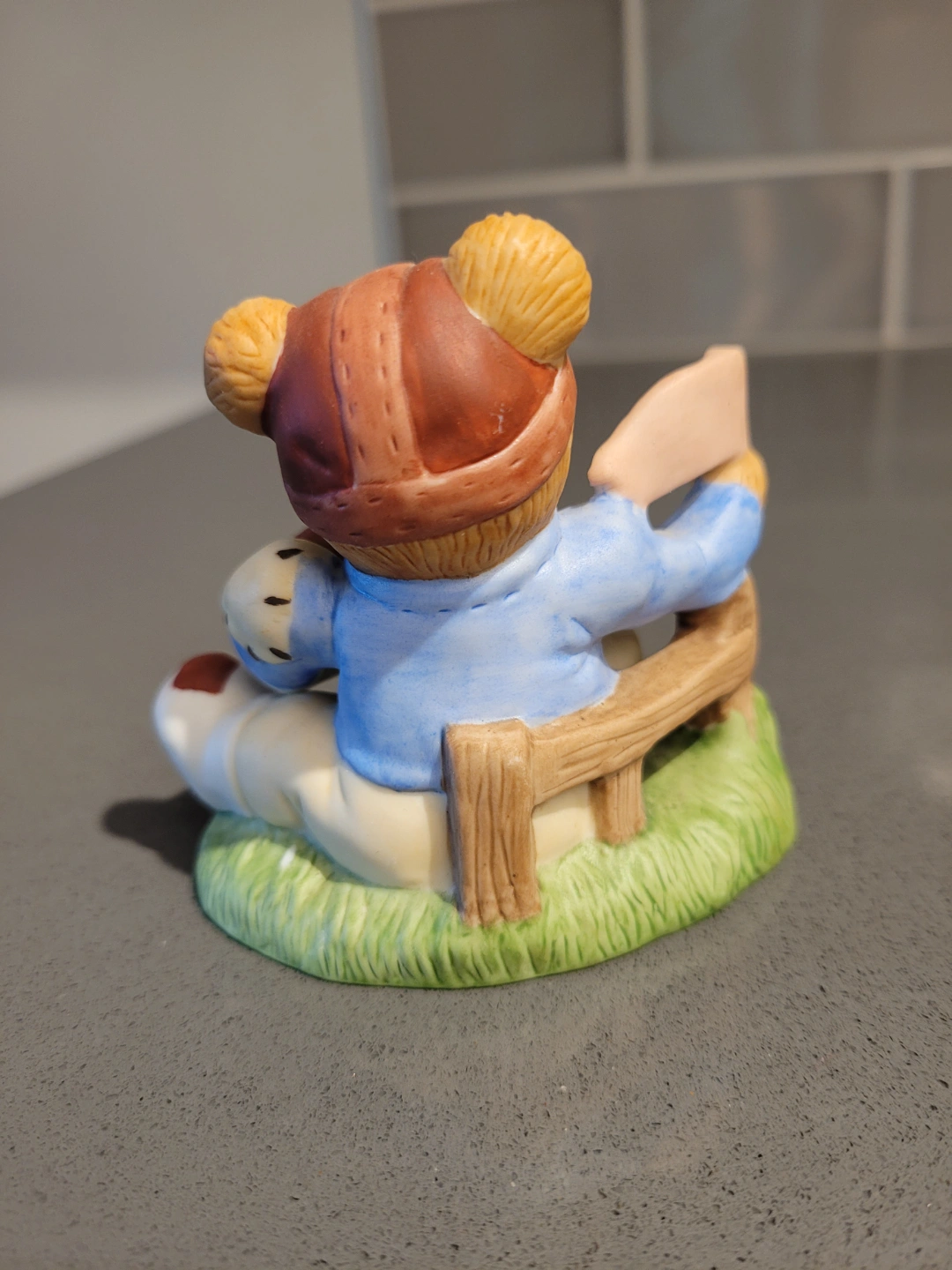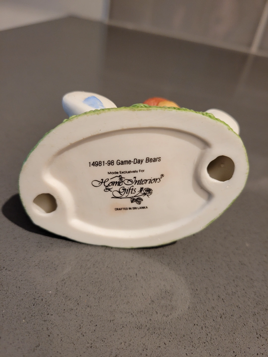 Set of two adorable ceramic bear figurines. One bear wears a football uniform and holds a football. The other bear wears a cheerleader outfit and holds pom-poms. Both bears are sitting on a small bench. Collectible, charming, and perfect for a sports fan. Approximately 3 inches high by 3 inches long. Feel free to check out my other unique items.