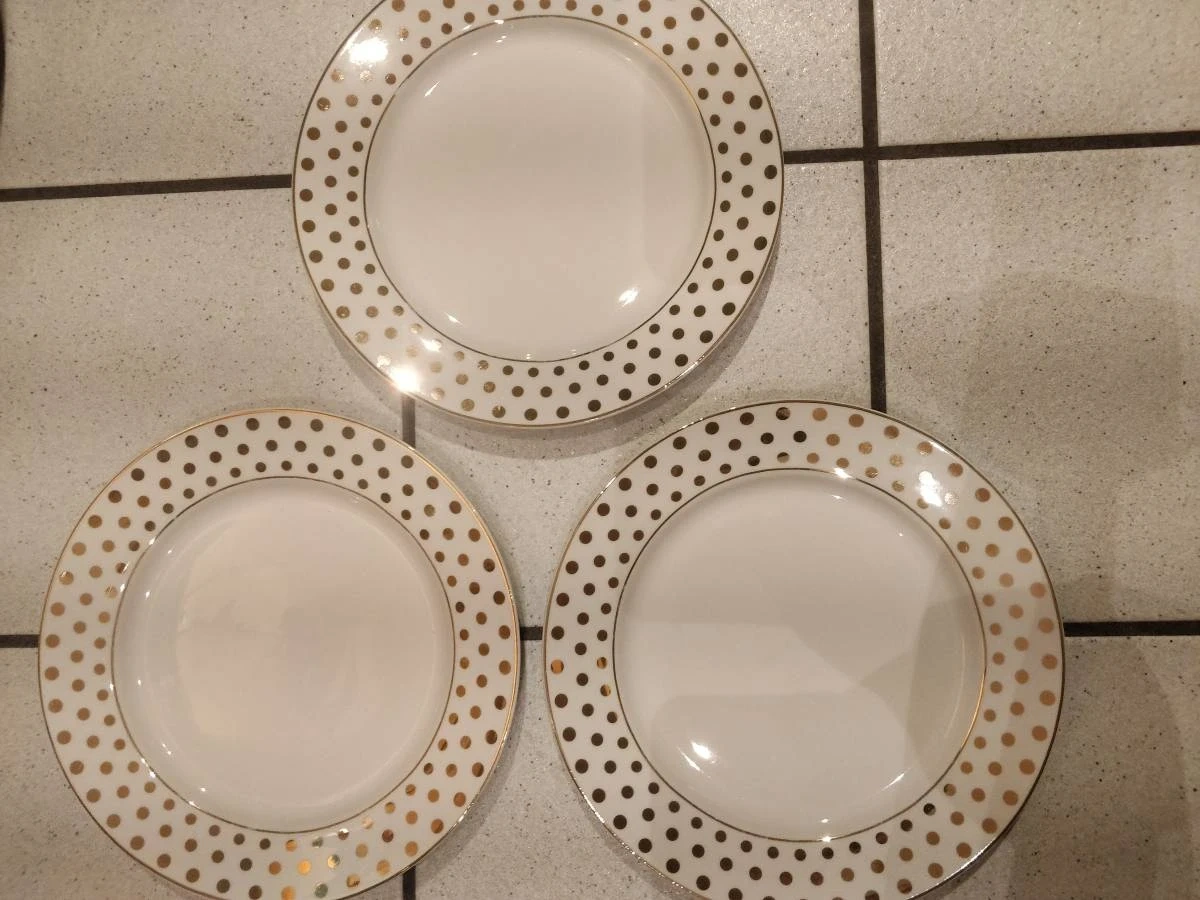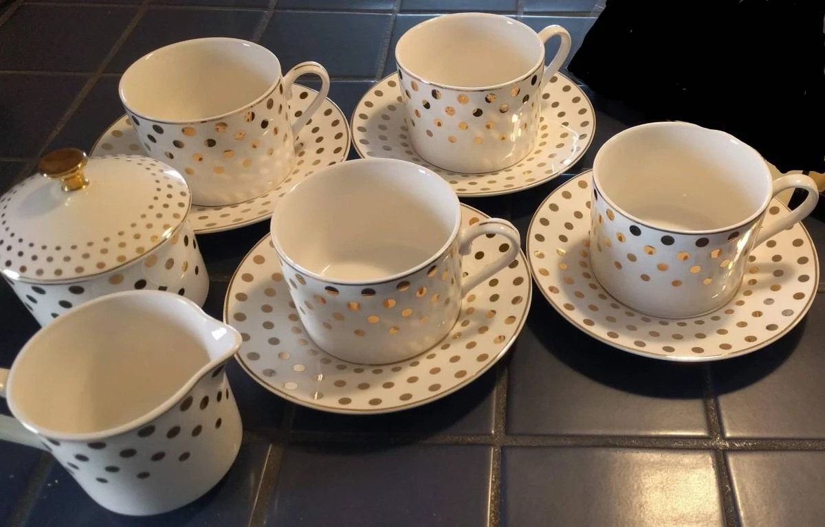 Elegant tea set. Features gold polka dots on off-white background. Includes four teacups and saucers, creamer, sugar bowl with lid, and three dessert plates. Perfect for afternoon tea or special occasions. new condition