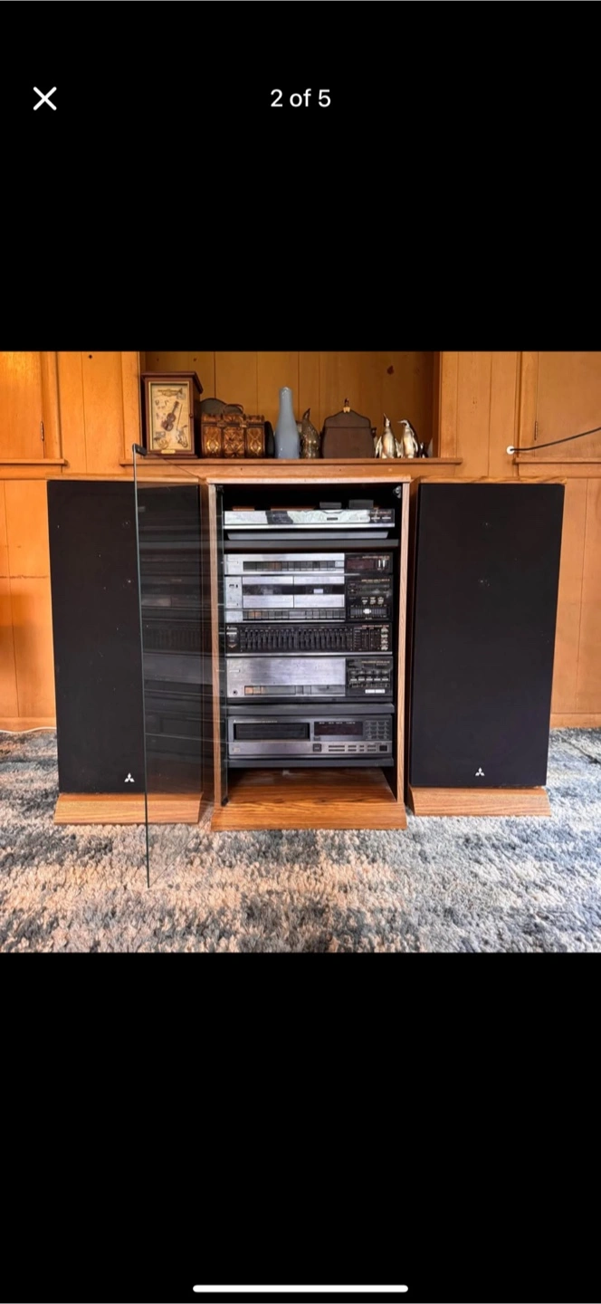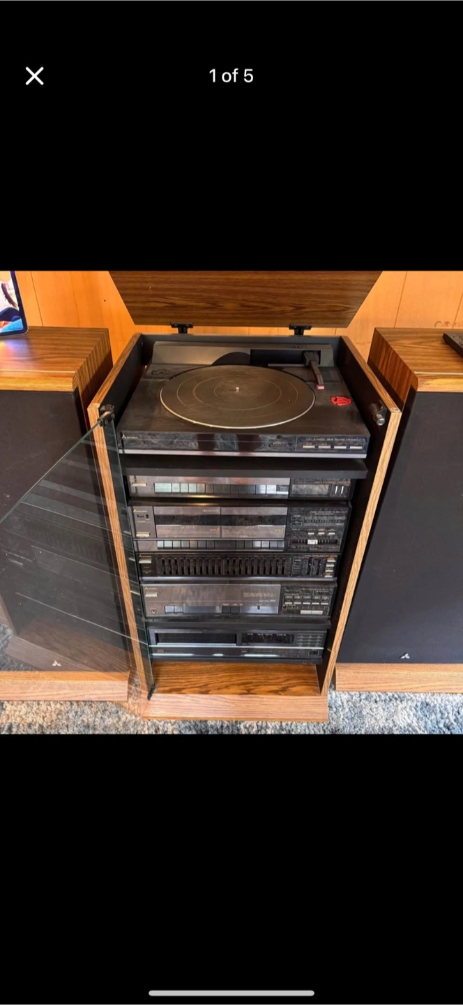 Complete vintage stereo system. Includes turntable, cassette deck, graphic equalizer, amplifier, and speakers. All components are built into a single wooden cabinet. Great for collectors or retro enthusiasts.