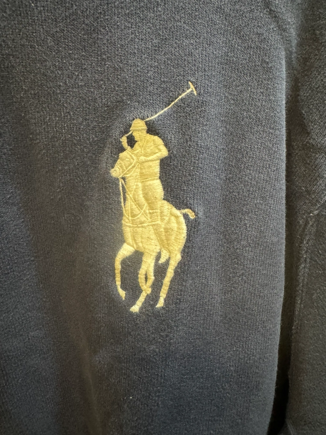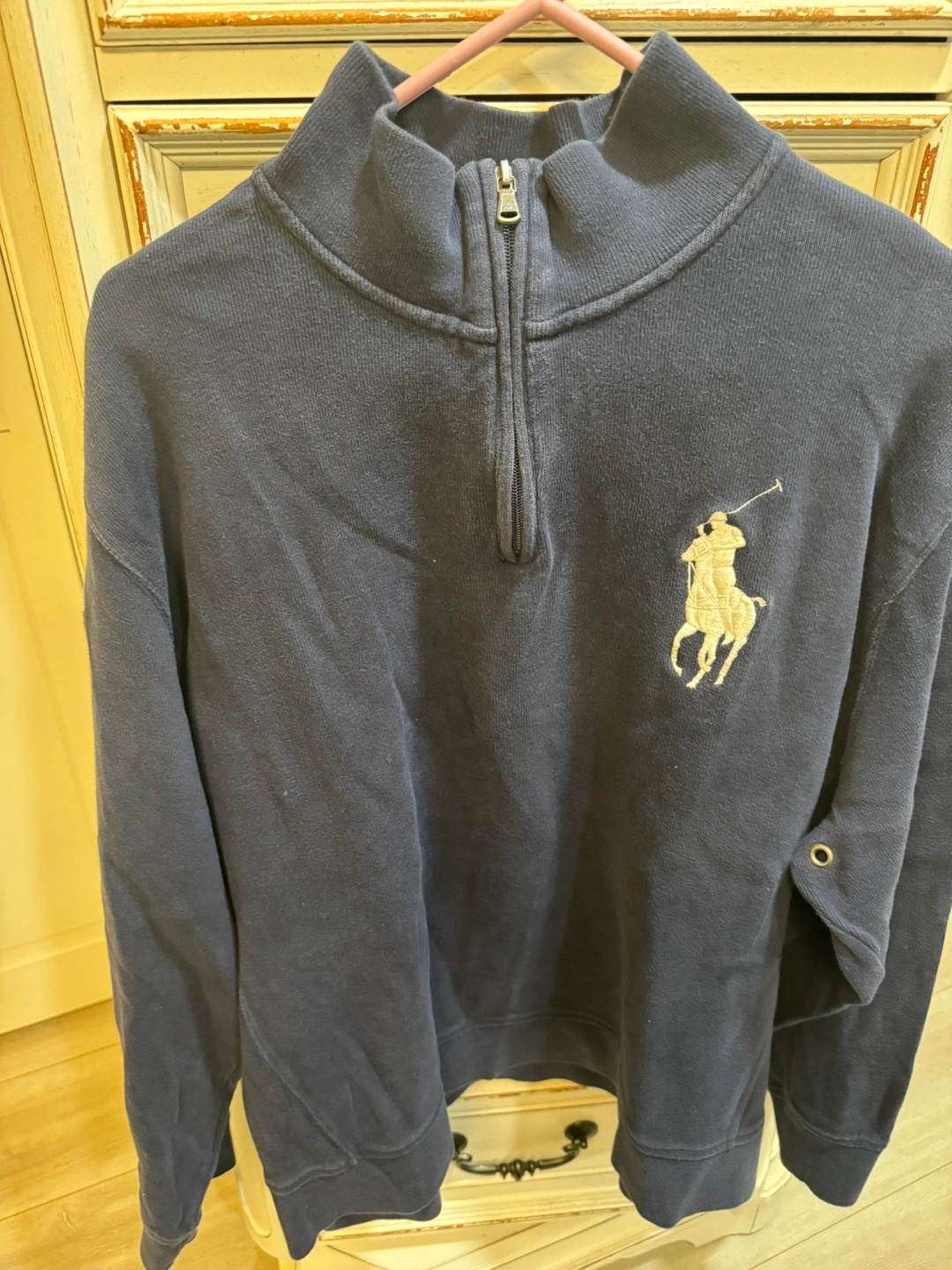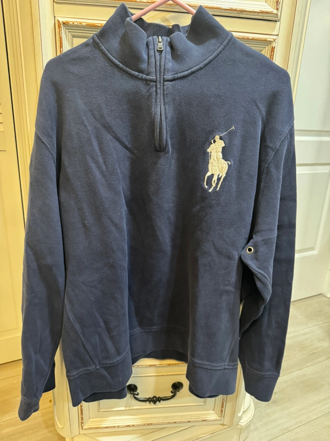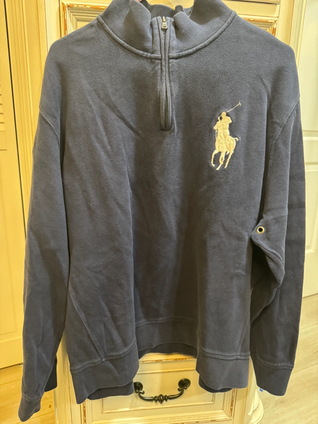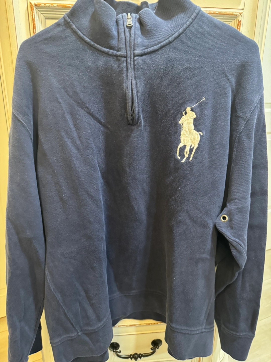 Men's navy blue quarter zip sweatshirt. Features embroidered Polo Ralph Lauren logo. Long sleeves, comfortable cotton material.